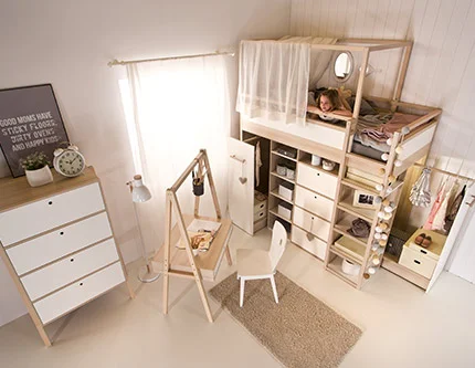 A bunk bed for a girl, as well as a boy, can become a magical castle, a charming country house or a place to build bases. Nothing prevents you from setting two of the same model in one room and personalizing them with accessories. Bunk beds give children sharing a room more privacy and are just as comfortable as traditional single beds, with the added advantage that they can be transformed into a creative play space.