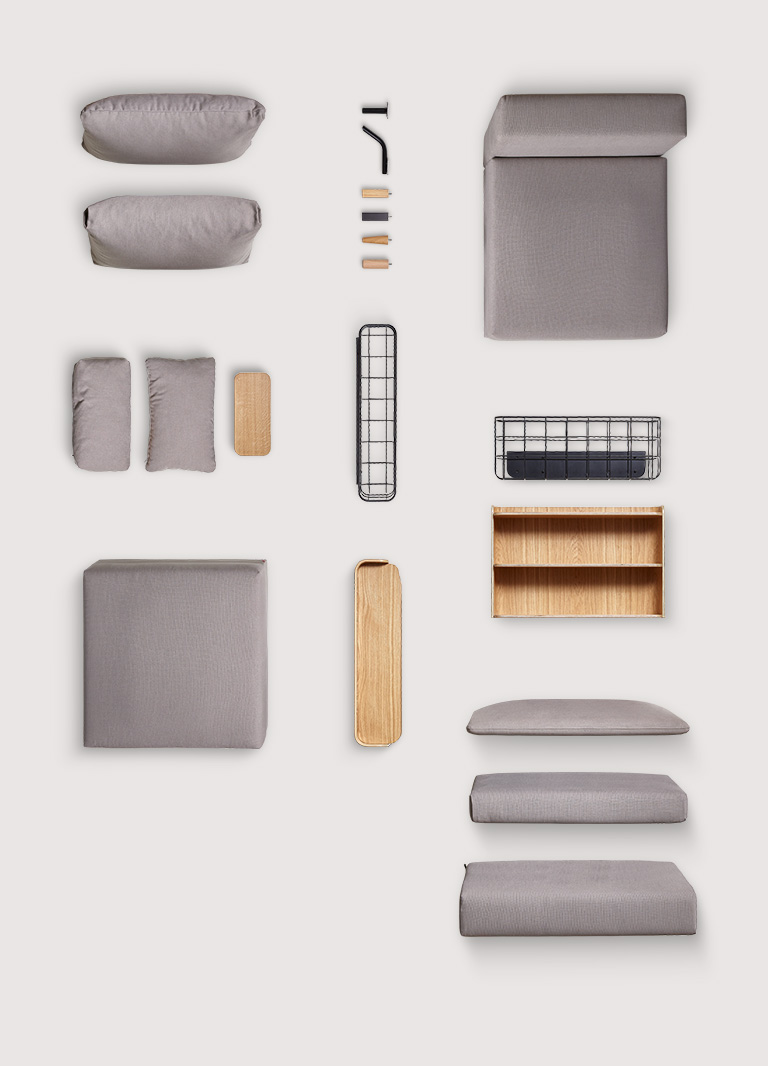We designed the Conffi modules so that assembly is smooth and effortless. There are toothed crocodiles under each module to connect the individual components. In the event of a move, you can easily disassemble the whole thing and take your Conffi to the next flat. Thanks to the modular design, the packages with the individual elements will fit into the lift.