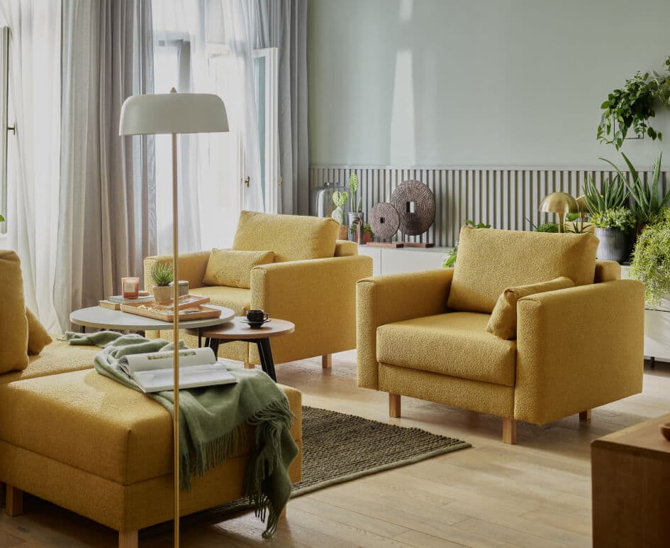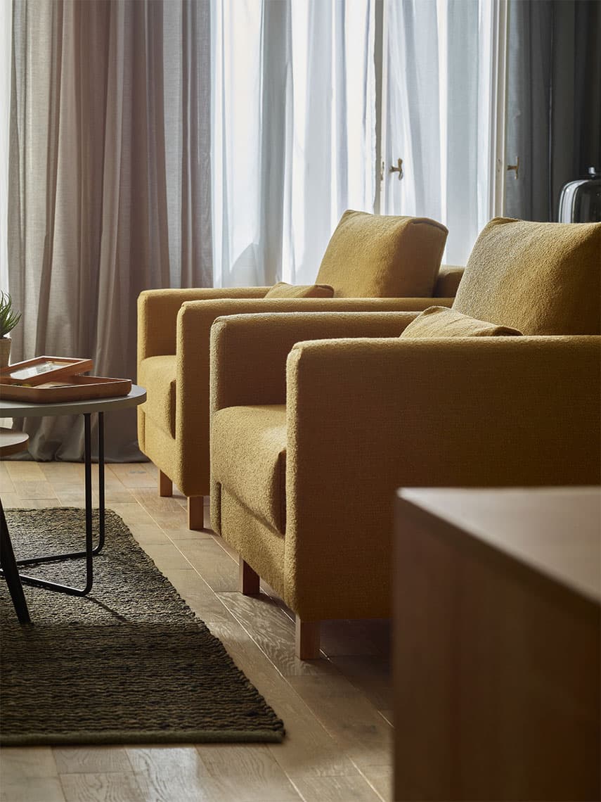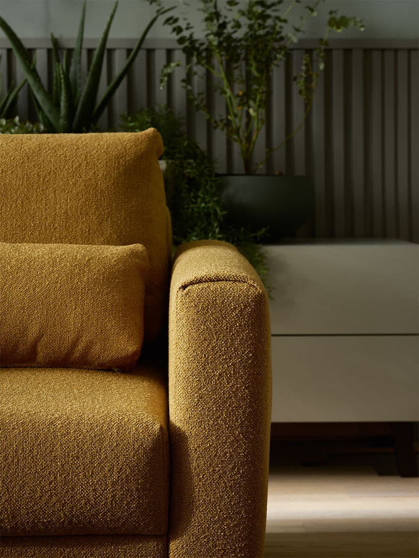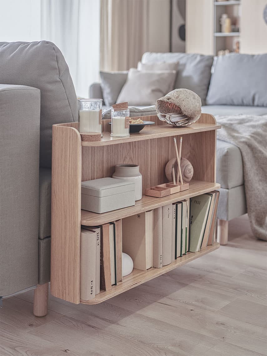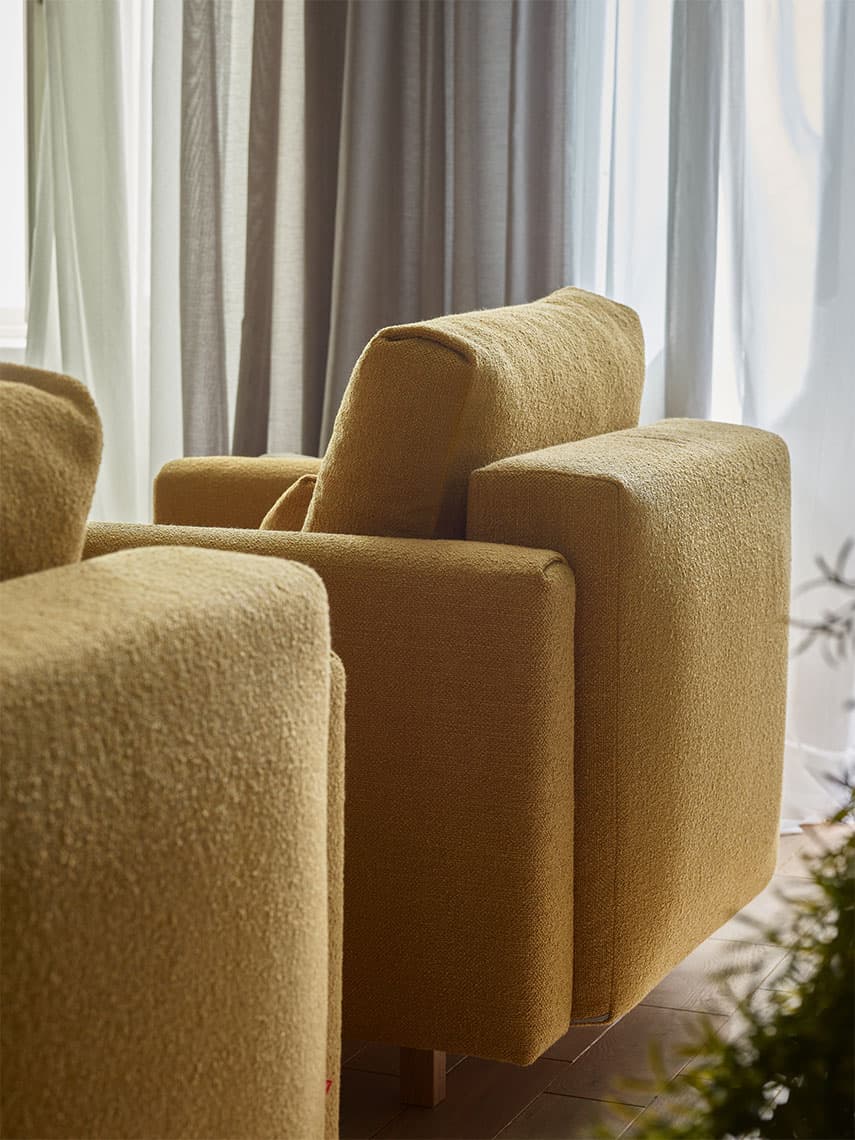Conffi will take any form and find its way into any interior, just give it the shape and colour of your choice. Choose a wide armrest with dents or a narrow one. Or instead of an upholstered side, a functional metal basket with a top or a wooden shelf. You can also choose from four types of wooden legs or a set of metal legs.