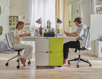 There are times when someone accompanies us to work or study. An interesting solution for a room shared by siblings or a home office used by a couple will be a double-sided desk. Matching it with ergonomic swivel armchairs and mobile pedestals, we will provide both people with full comfort.