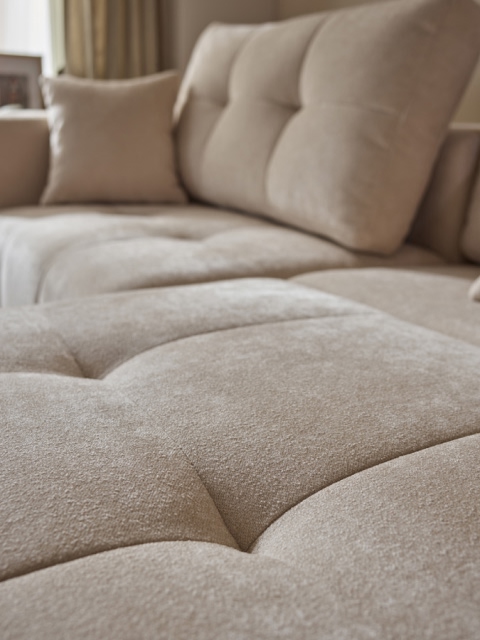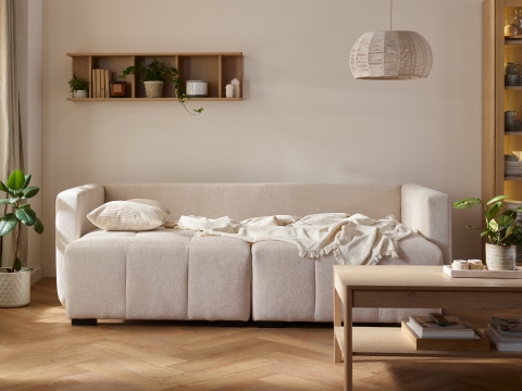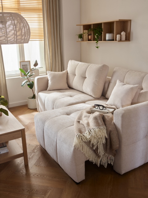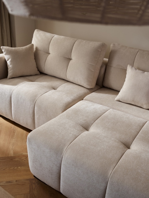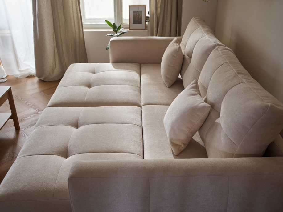 Po rozłożeniu obu modułów siedziskowych powstaje obszerna powierzchnia wypoczynkowa, która funkcjonalnością i komfortem dorównuje dużym narożnikom, a jednocześnie zajmuje znacznie mniej miejsca w salonie. Wysuwając tylko jeden moduł tworzysz szezląg, a cały mebel staje się narożnikiem.