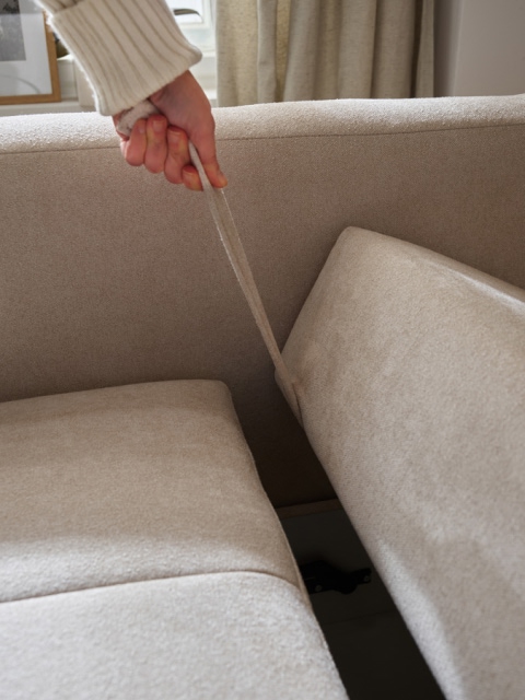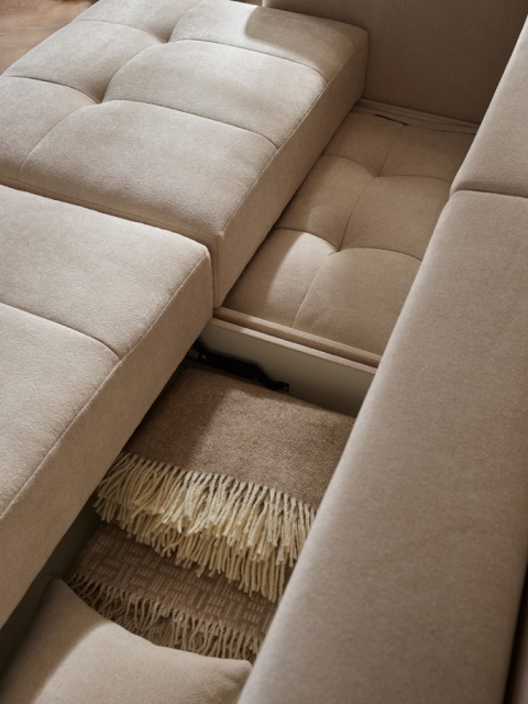 Pod każdym siedziskiem znajduje się obszerna przestrzeń do przechowywania, idealna dla kocy, poduszek czy pościeli.