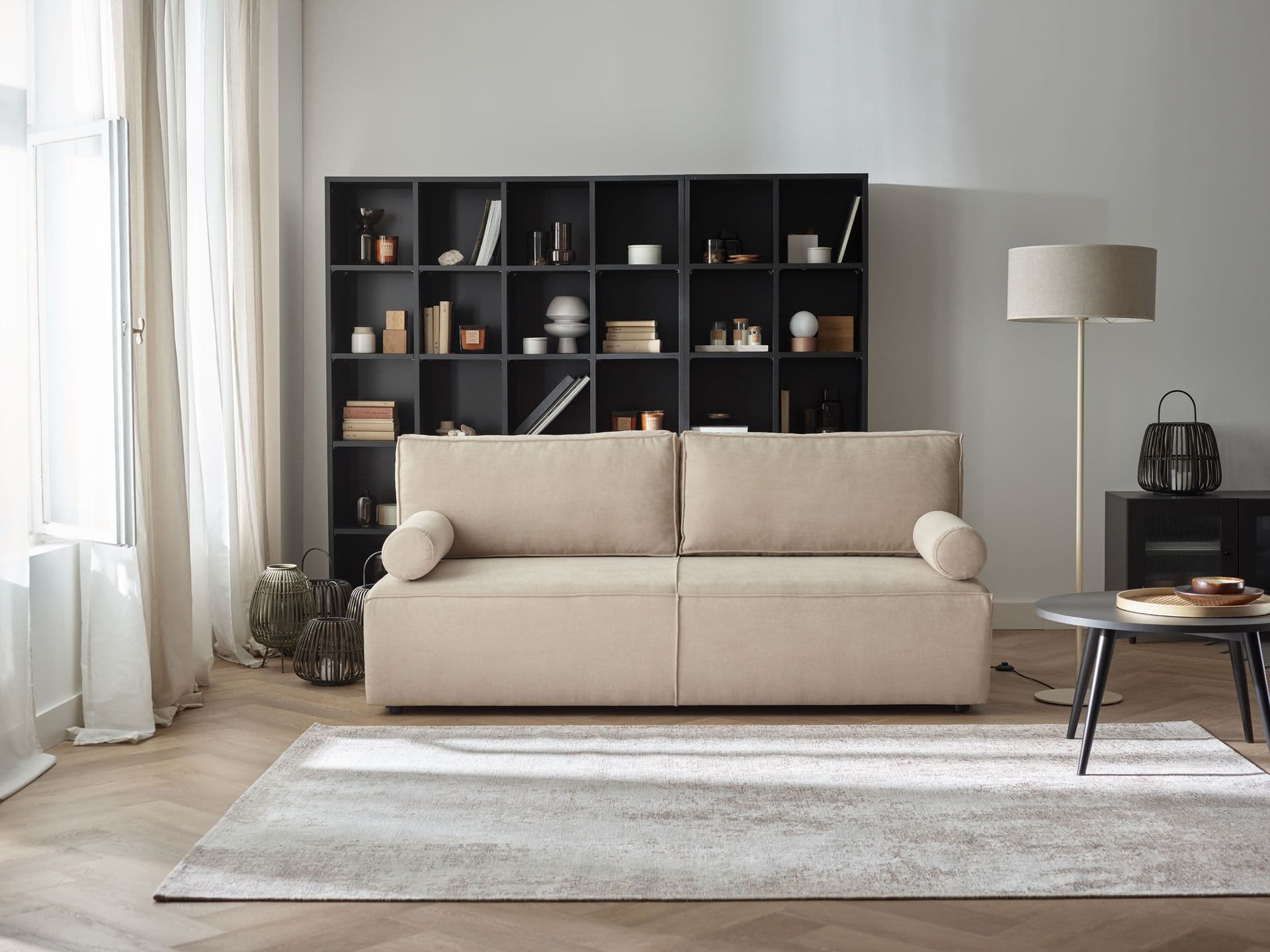 A beige sofa with black accessories will create a slightly more modern atmosphere. The soft and comfortable Lark corner sofa with its rounded form will create a successful duo with the black floor lamp in industrial style, the dark minimalist coffee table and the glass cabinet from the Creative collection in the same shade. A dark wood floor will prove to be the finishing touch.