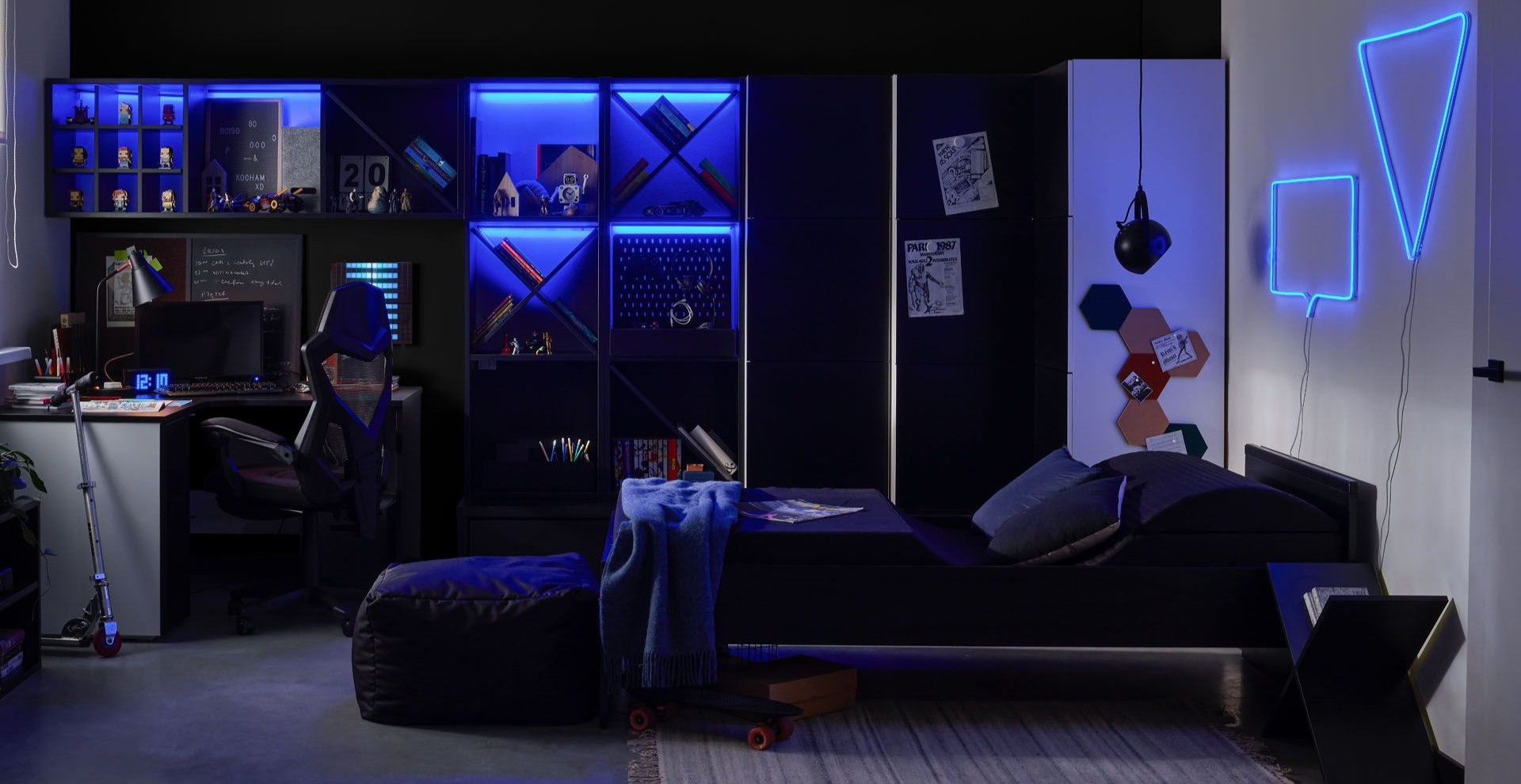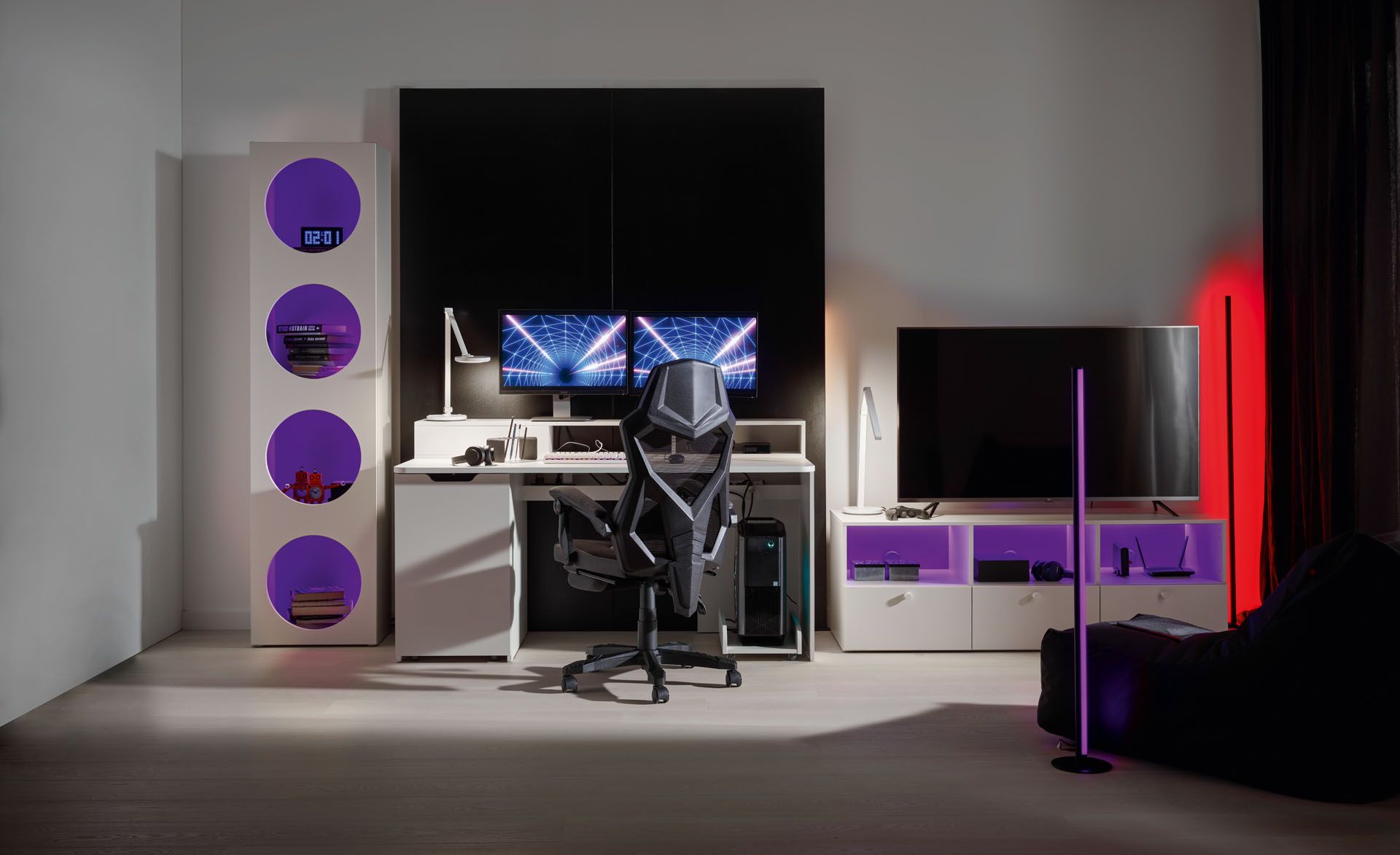 When thinking about how to furnish a gaming room for yourself or your child, it is impossible to forget about gadgets that will give the interior the right character. Game discs, figurines depicting favourite characters or RPG manuals should be properly displayed. This can be done with the help of multifunctional neon fillers, which make it even easier to keep the bookshelves tidy. The X-shaped ones can also be used as a table on which you can put your book or phone.