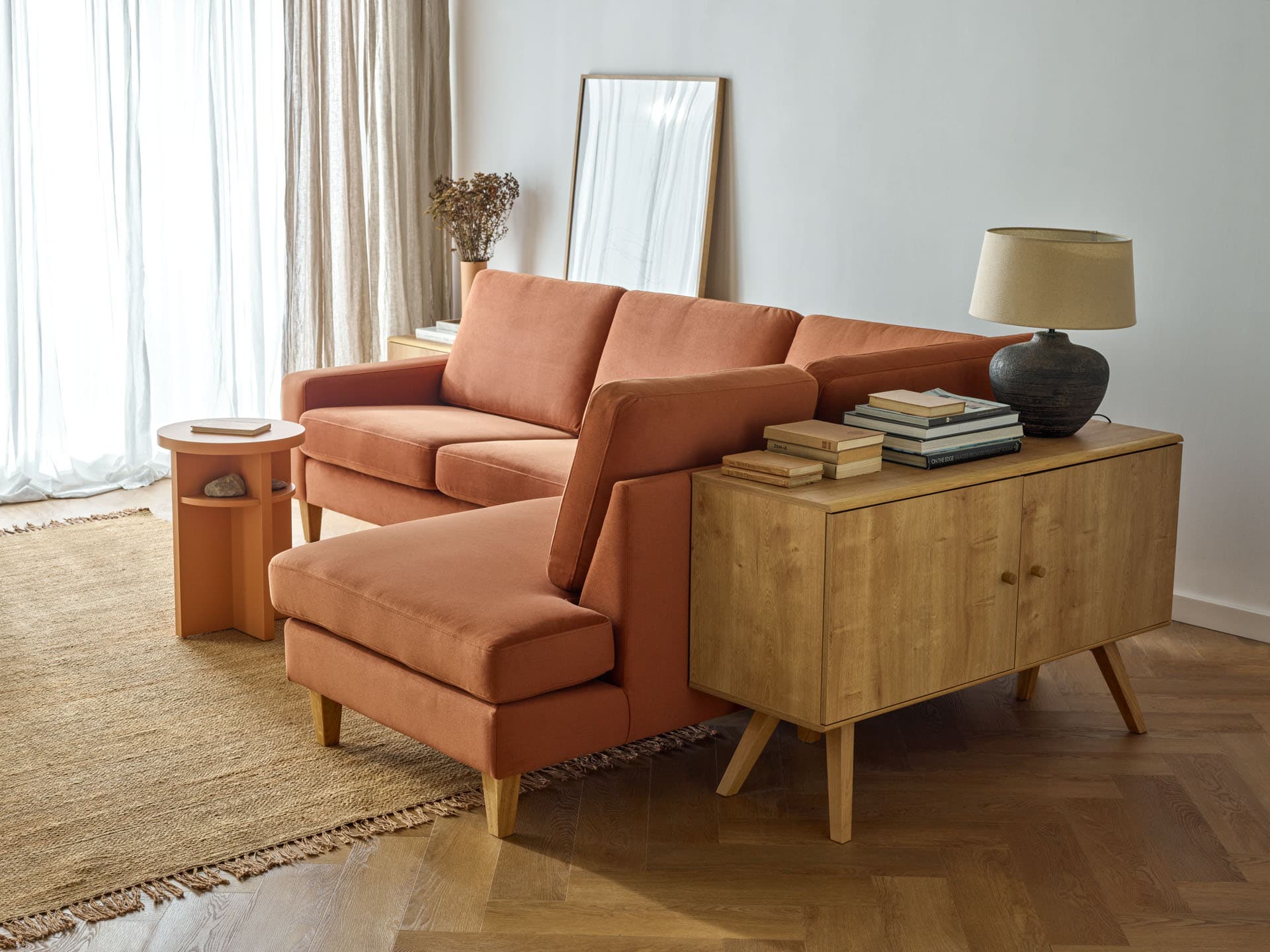 Light wood colours have a great power to make interiors feel cosy. Warm upholstery colours in particular will go well with them. The red Volan sofa will draw the eye like a magnet, and its fiery colour will give the space an intriguing expression. A similar effect can be achieved by choosing the Duvet sofa in mustard-coloured upholstery fabric, which will go well with the green of the plants and the natural oak colour of the floor.