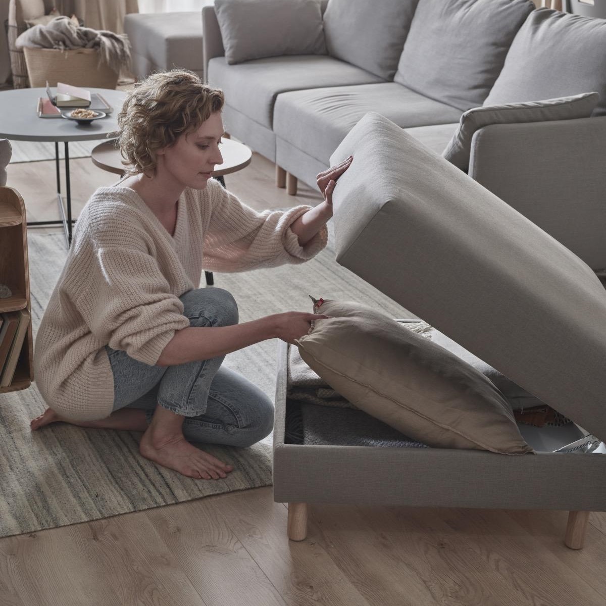 Pillows with storage compartments will also help us to keep our living room well organised and tidy. The storage compartments contain the softCotta, Noel or Milton footstools. With these, a warm blanket and cushion can be within easy reach during an evening's relaxation. A lockable storage box, which can also be used as a coffee table, will also protect textiles from dust.