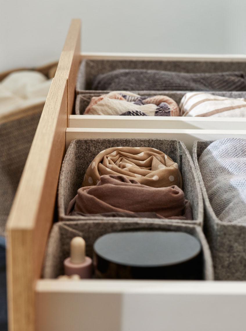 Before buying the right furniture, it is worth considering how large your clothing collection is and how you like to store it. Do you want your clothes hung up, folded on shelves or perhaps organised in drawers? Putting in a wardrobe, chest of drawers or bookcase is usually a good solution. Also helpful are any boxes or organisers in which to organise small items. Both tall containers for cupboards and low organisers for drawers can be useful.