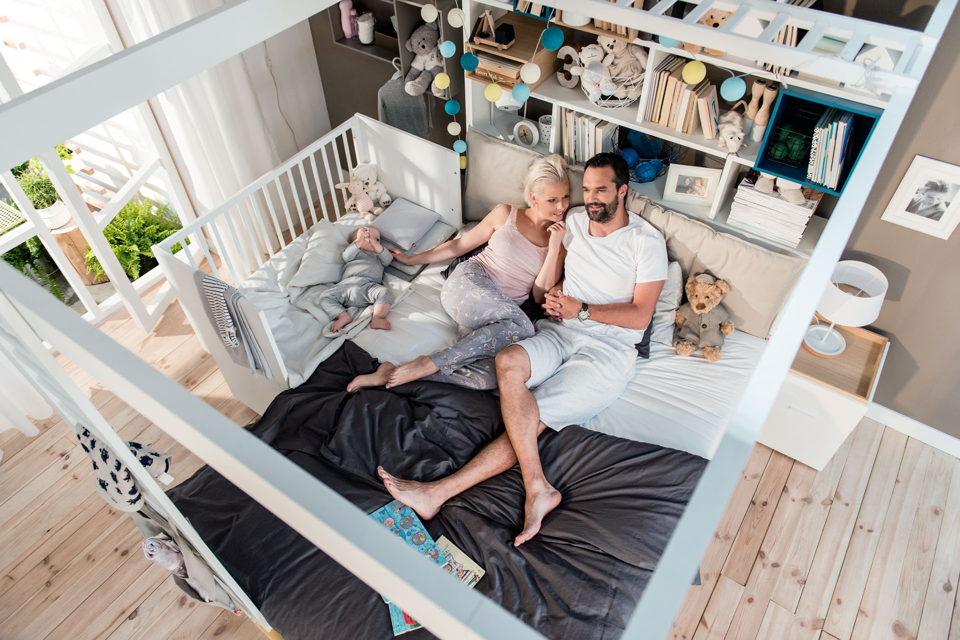 In the baby's corner, versatile solutions that can be adapted to specific needs and situations will also be important. The multifunctional 4 You cot can be conveniently attached to our bed thanks to its adjustable height. It also has a practical storage drawer and removable rungs to make it easier to get out of the cot when the little one is a bit older. And when the cot is no longer needed, we can easily convert it into a functional couch.