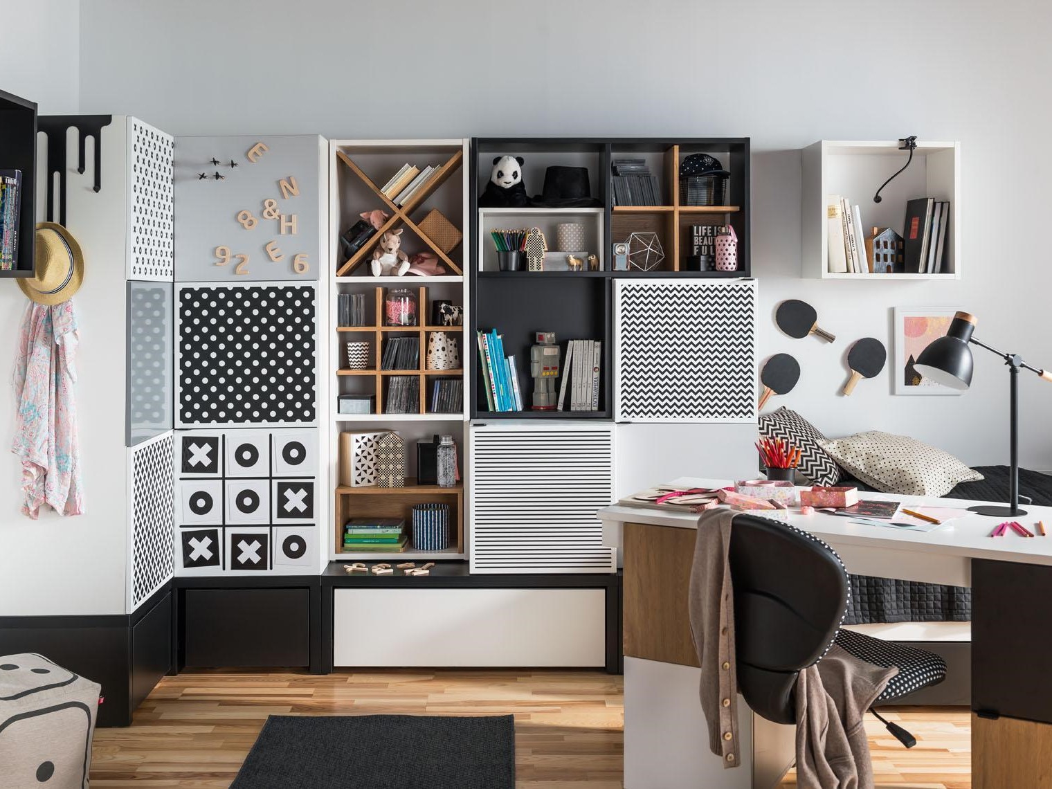 The black and white Young Users furniture will look interesting, especially in a flat inhabited by young people. Functional overlays mounted on the fronts of cabinets will allow us to carry out a quick metamorphosis of the interior each time the tenants change. Metal accessories will not only help personalise the room to suit the needs of the tenant, but will also protect the furniture from mechanical damage. In addition, platforms with drawers, like cupboard extensions, will allow maximum storage space in a small flat.