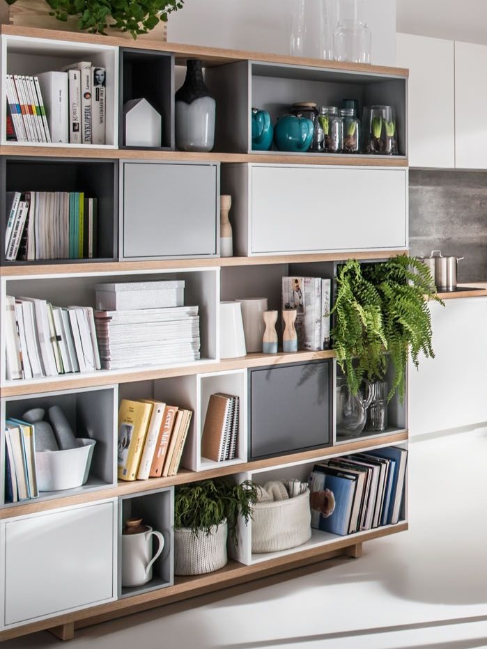 Balance furniture will also provide a neutral base that can serve reliably for years to come. Its appearance and usability can evolve at will. The multifunctional elements of various sizes and colours can be assembled without screws or bolts, adapting the layout and number of open and closed cabinets to current needs.