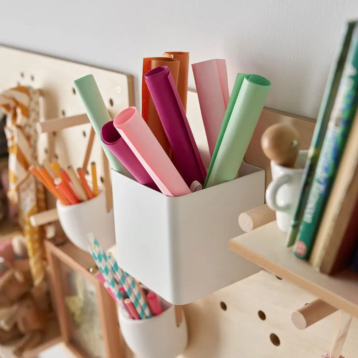 The soft rectangles and squares will form a functional whole with the decorative panel. We can match the Slot board with preferred accessories to create a multi-tasking organiser. Sturdy book shelves, containers for utensils or felt pockets for small items - it is only up to us how we use the aesthetic space. A wall above the desk decorated in this way will bring a touch of individuality and a whole range of comfort to our home office.