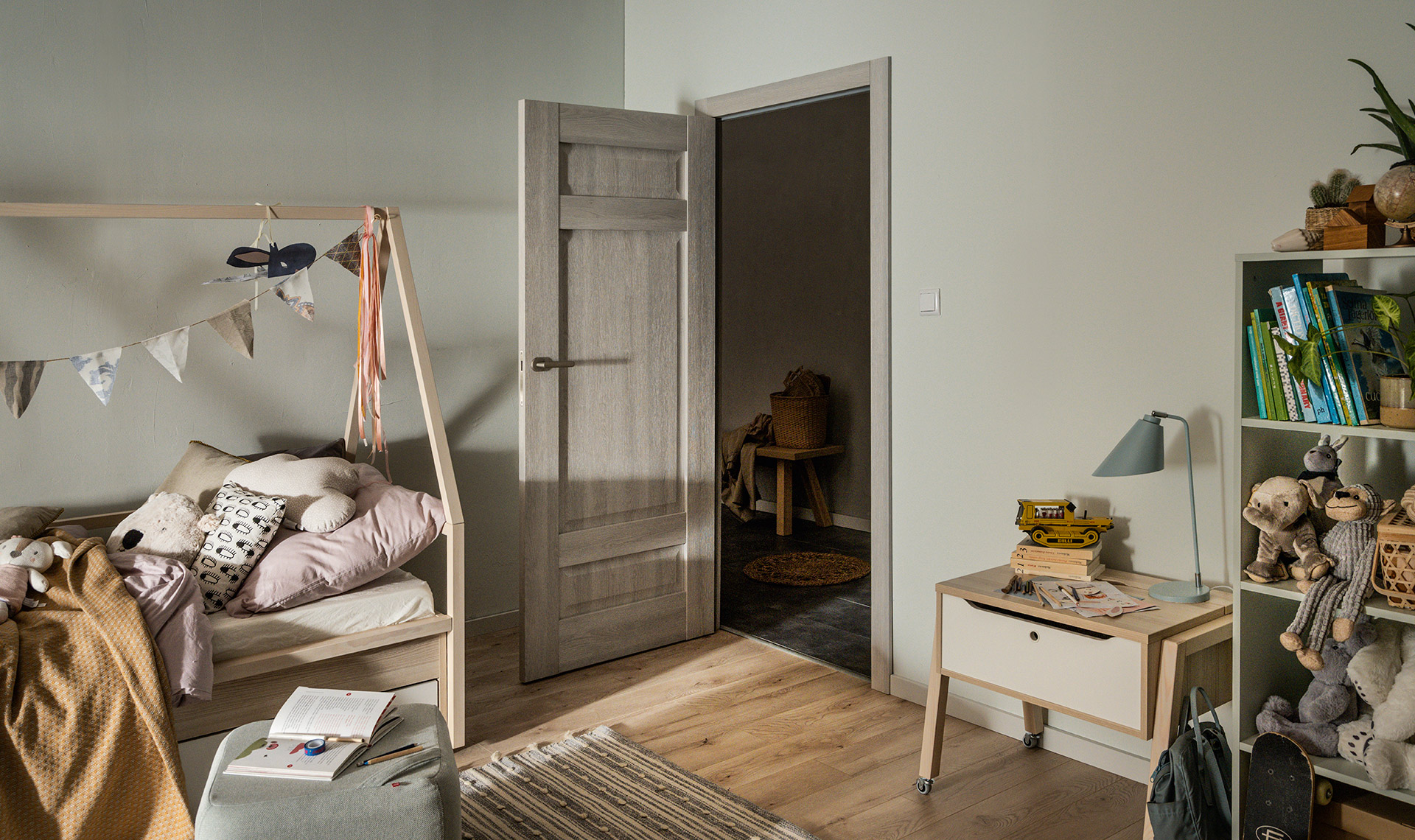 A grey door is a particularly good idea for a children's room. Not only will it balance out the intense colour of the walls and the accessories that often go there, but it is also a very functional choice. After all, all dirt and scratches will not be as visible on a grey door as they would be on a white door.