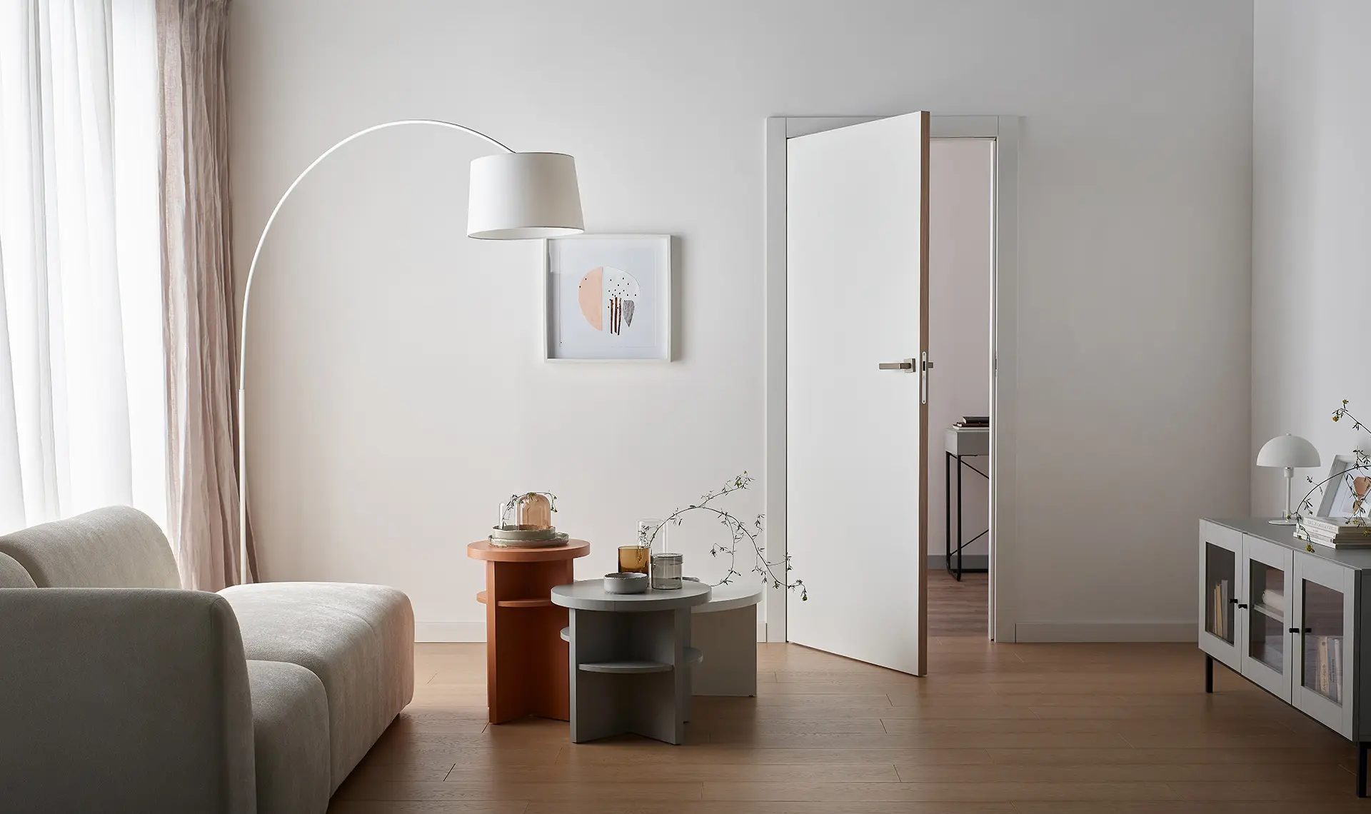The white colour of the door will work in every room, but will play a special role where we want to lighten the room and optically enlarge it. It will create a harmonious whole in light-coloured interiors, furnished with furniture of the same colour, but nothing stands in the way of white leaves being a contrast to dark walls or floor. We can successfully match them with practically any other colour. They will go well with black or cool grey, as well as with warm shades of brown and beige - depending on the combination, we can create a space that encourages relaxation, fun or hard work.