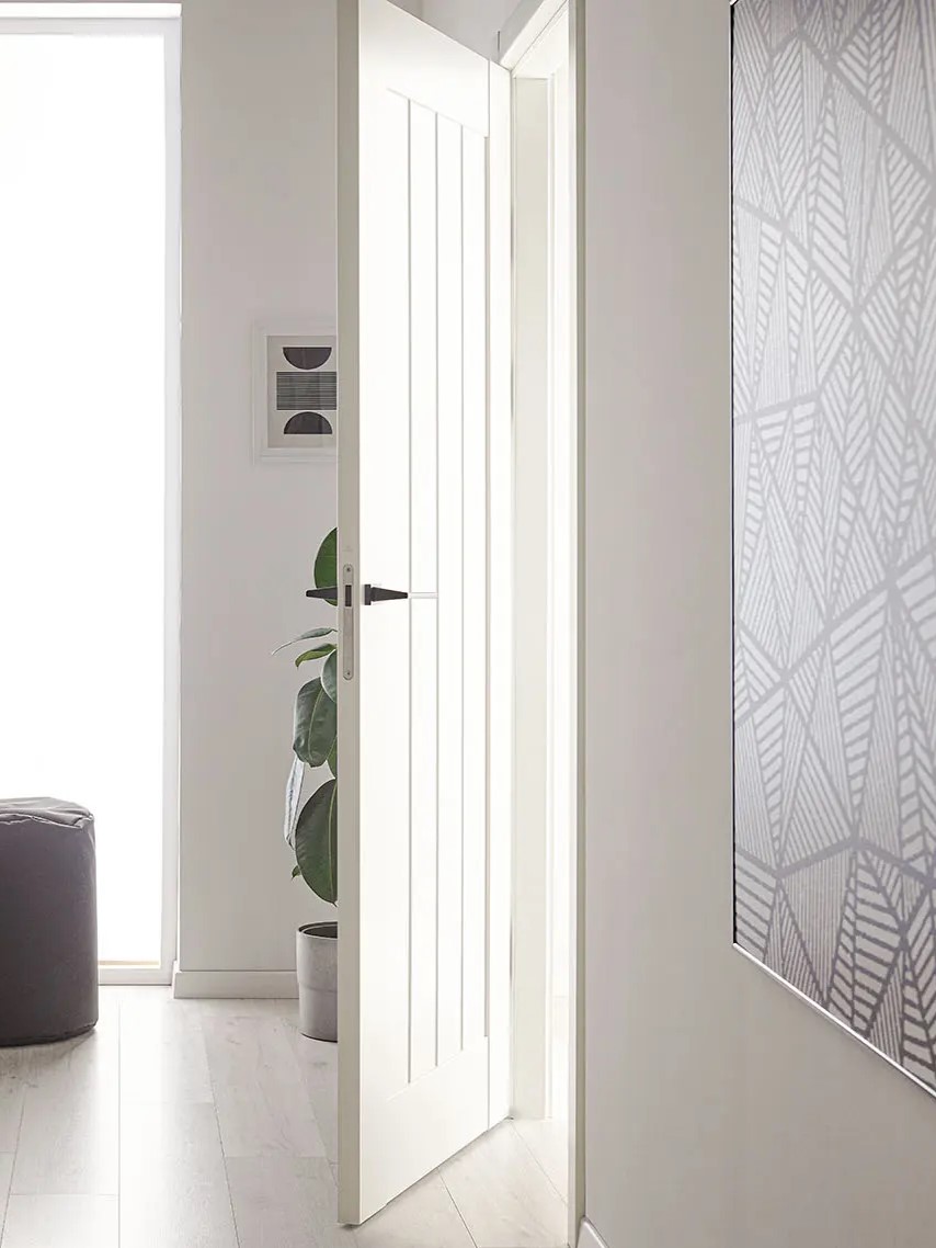 Drzwi Modus z naturalnym obrzeżem idealnie dopasują się do wnętrz, w których królują ekologiczne surowce. Taką aranżację równie dobrze co ręcznie tkany dywan Jute Natural wykonany z juty czy miękkie, lniane zasłony dopełni klamka Meda. Uchwyt z okleiną przypominającą sklejkę podkreśli ciekawy styl stolarki. Na podobny zabieg pozwalają proste drzwi Supri z antracytowym wykończeniem krawędzi, widocznym po otwarciu skrzydła. Klamka w zbliżonym odcieniu szarości będzie świetnie kontrastować z dominującą bielą.