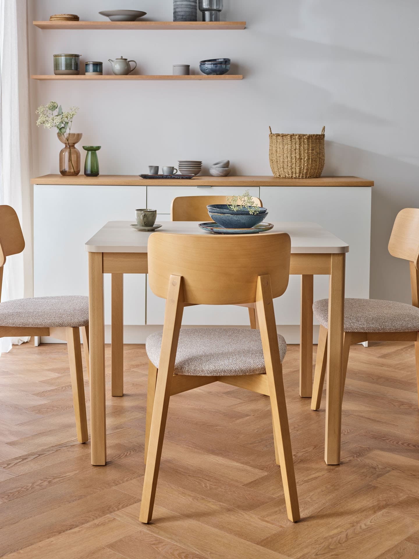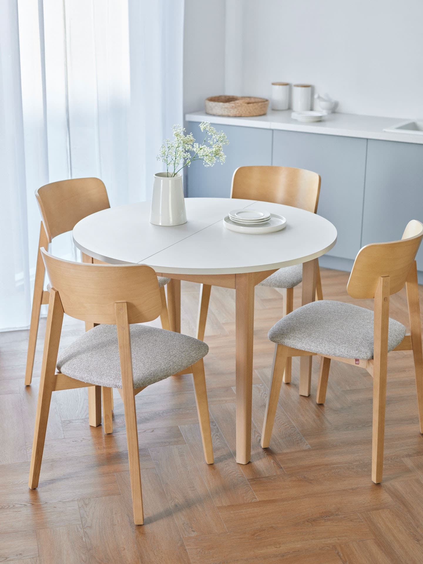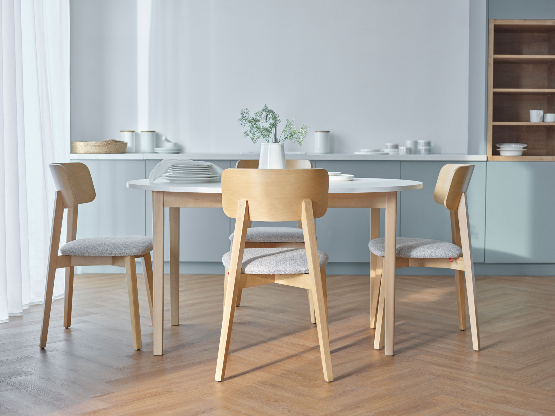 The choice of chairs for a white table depends on the effect you want to achieve. The Alvio chairs, upholstered in beige fabric, add elegance and lightness to the interior. Their soft forms combine well with the round white top of the Konso table. The space, devoid of sharp lines, acquires a subtle cosiness, and thanks to the floor panels in a warm wood colour, the whole looks stylish and timeless.