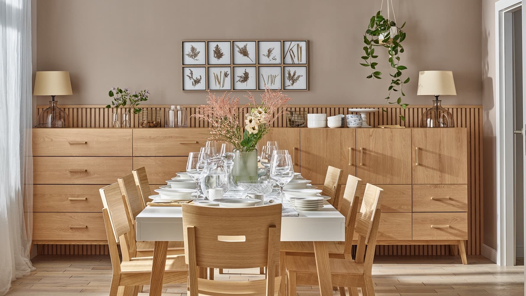 For a more idyllic dining room feel, place display cabinets against the wall to highlight the tableware, and place knotty wood panelling on the floor.