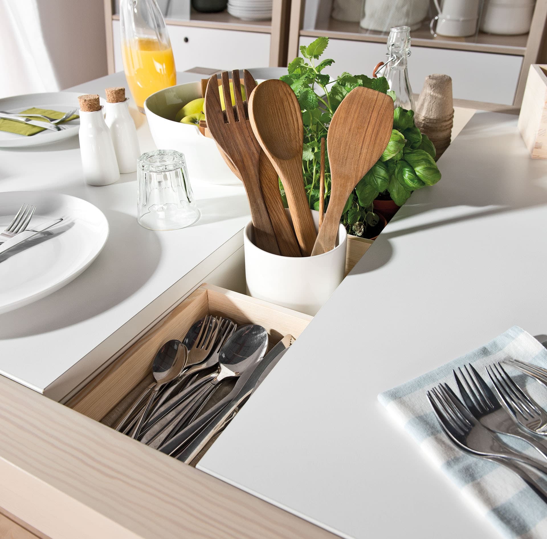 Who said only chairs would work in the dining room? Spot benches can be placed at the white 4 You table - they accommodate more guests, hide under the table and have drawers to store all the useful small items. If you put soft, graphite cushions on their seats, you will gain additional comfort while sitting, but also an effective contrast.