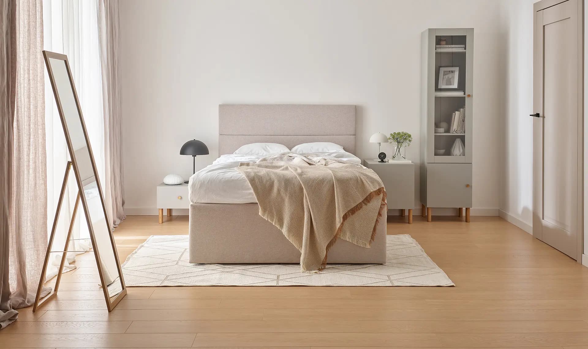 To emphasise the atmosphere of the room even more, match the colour of the bedroom floor with light-coloured doors. Combined with a neutral wall colour in beige or white, this creates a harmonious trio. If the bedroom décor is too monotonous, use colourful decorations and houseplants to break it up. The luscious green of the leaves will perfectly complement the natural shades of wood, enliven the interior and create an atmosphere conducive to relaxation and tranquillity.