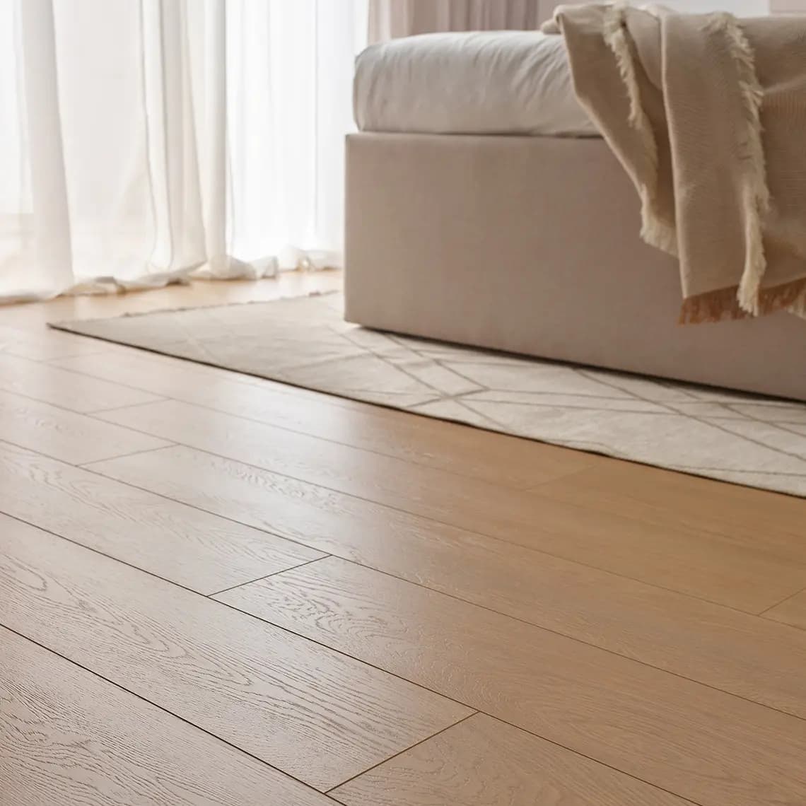 A light shade of flooring will also help to emphasise the relaxing atmosphere of the bedroom. Particularly suitable for small spaces, it will brighten and lighten the room, helping to create a calming and peaceful atmosphere.