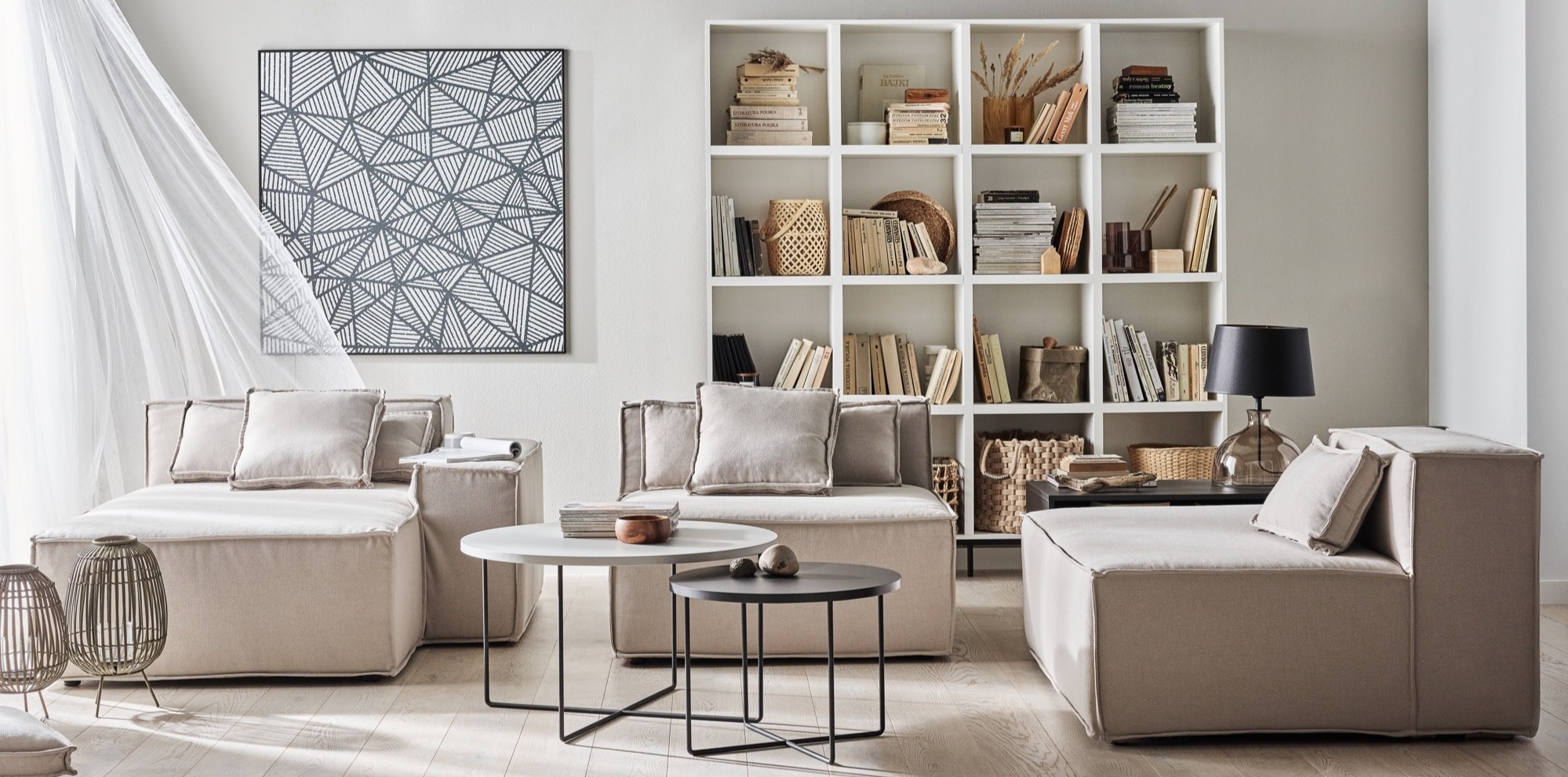 An arrangement with a beige sofa surrounded by light accessories will ensure a visually light effect. The Nui modular corner sofa, distinguished by its soft, rounded lines, goes well with delicate, beige curtains and the Modern White flat woven rug with a subtle, washed pattern. Low display cabinets can provide a contrasting accent - their cool grey will bring depth and elegance to the interior.