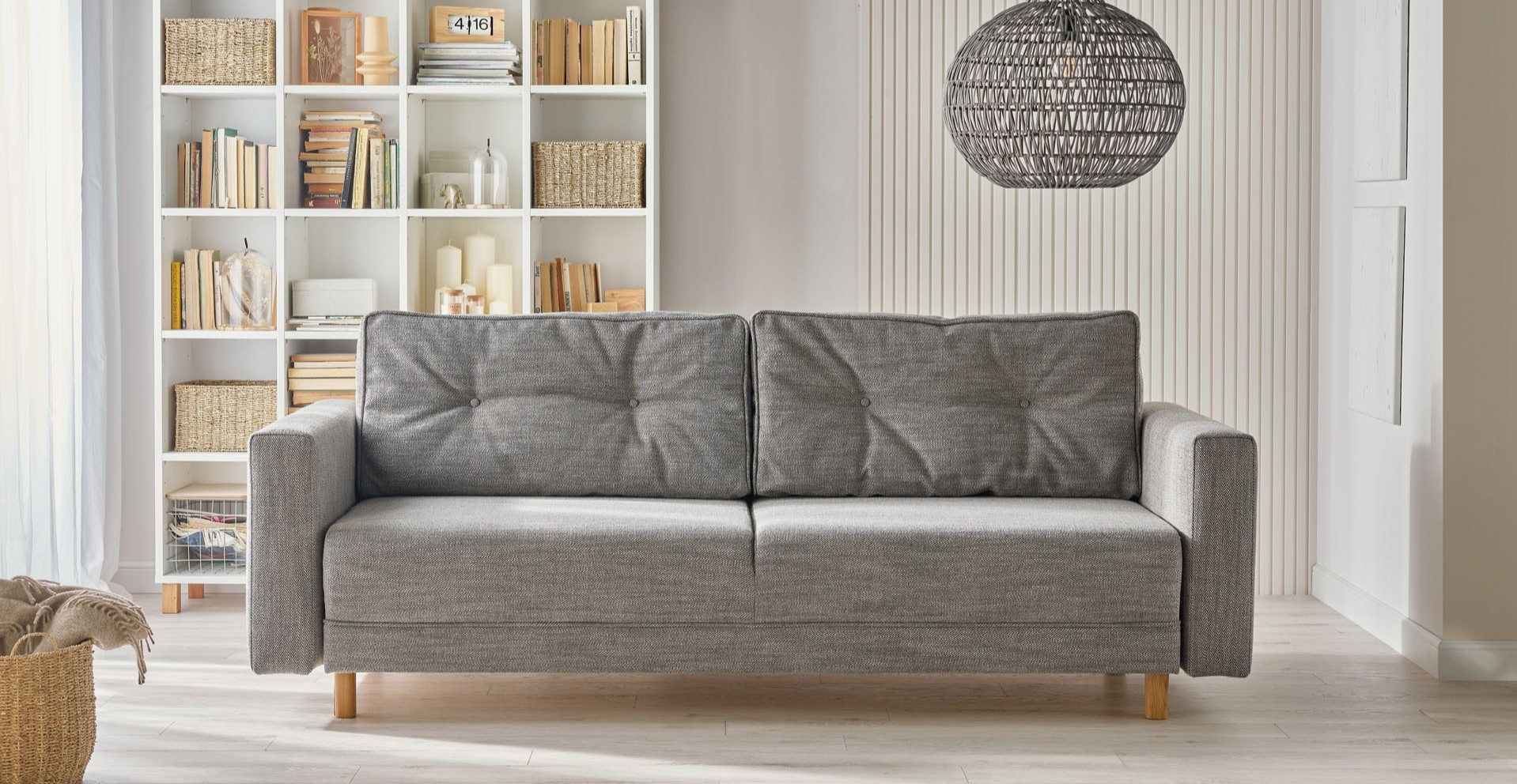 A comfortable grey sofa wrapped in shapely armrests will find its way well into a Scandinavian-style room. It is perfectly matched with white slats, subtly standing out against the light wall, and floor panels imitating a whitewashed board. The comfortable piece of furniture is complemented by a tall Creative bookcase and a large, openwork Ombra lamp, which spreads pleasant, atmospheric light in the evening.