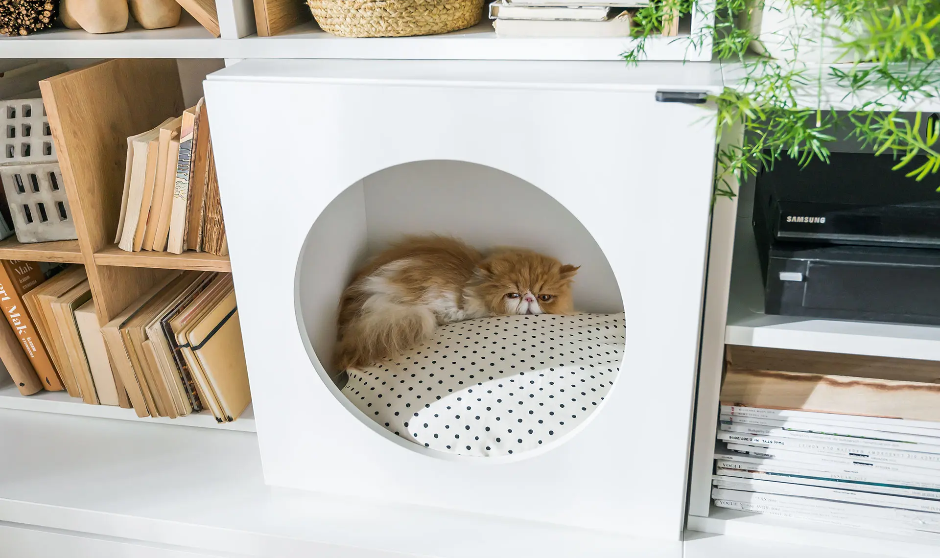 The solution may be to create a separate corner for him. Arrange it in such a way that the cat can always keep an eye on the whole room. A special pet cupboard is particularly useful. By covering it with a soft blanket or cushion and placing it on a small raised area, you can give your cat a comfortable alternative to a sofa or armchair. A scratching post can be placed right next to the cat's little kingdom, and its favourite toys can be hung on the hooks.