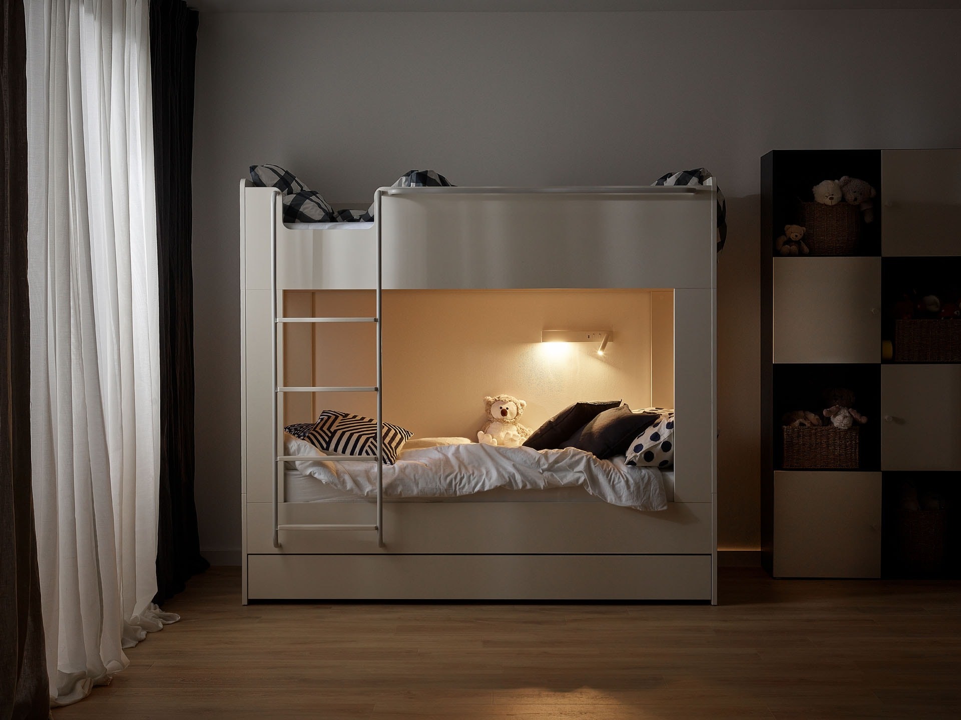 A small room with a bunk bed doesn't have to feel cramped and cluttered at all. By making clever use of the vertical space, we can conjure up an interior that is both functional and cosy. Thanks to its clever design, the Reli bunk bed not only provides two comfortable places to sleep. It also offers the potential for additional space that can be adapted in many ways, especially in the area under the lower bed.