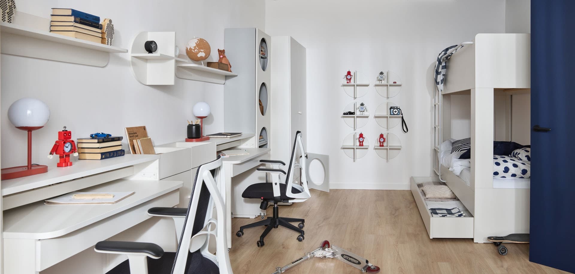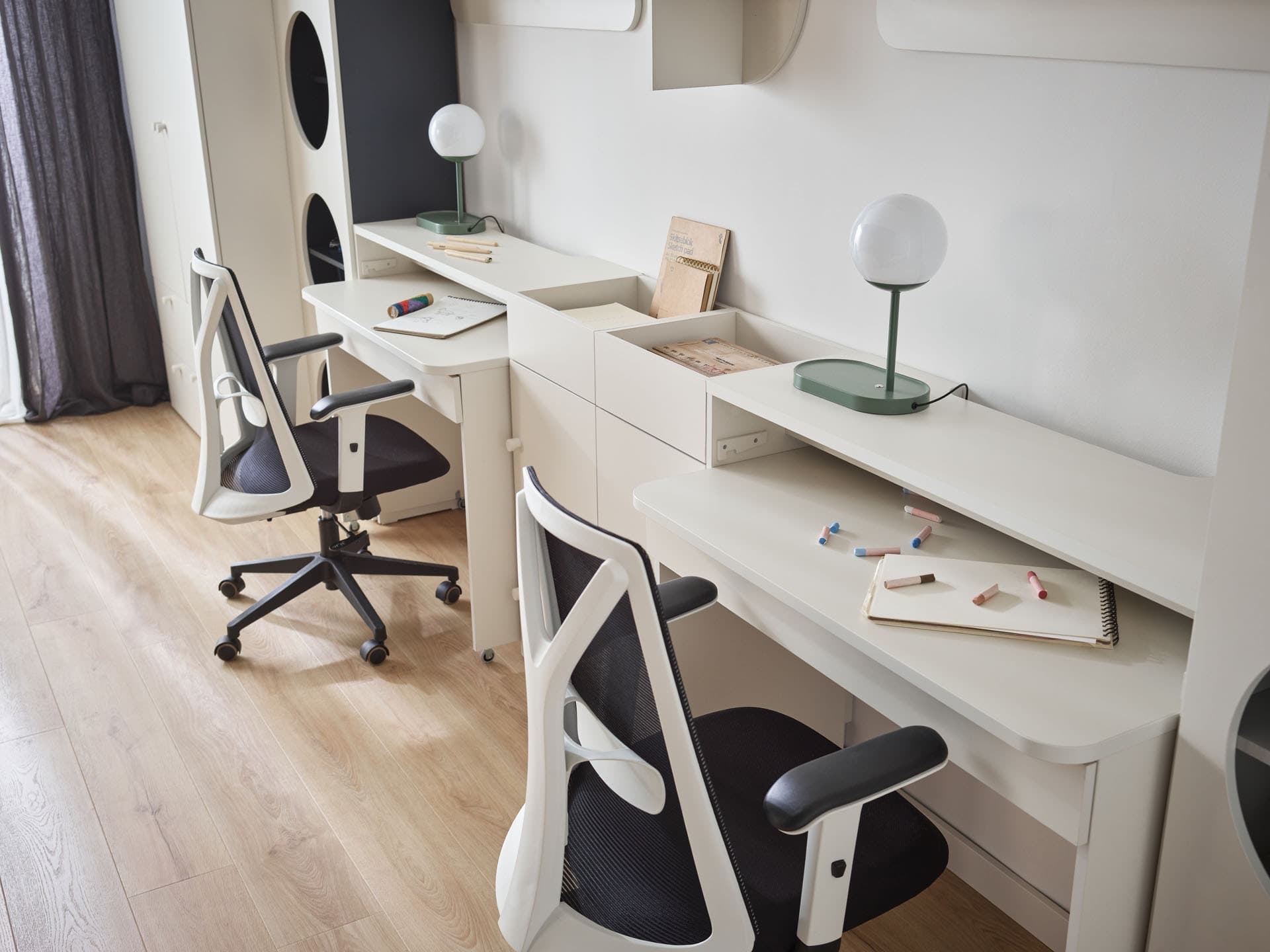But how do you creatively furnish a room with a bunk bed so that the room is not only functional and safe, but also fulfils its purpose as the children grow older? The key is to choose the right furniture. Those in the Reli collection will work well for a seven-year-old as well as a teenager and even in a young adult's room. The variety of pieces available allows the furnishings to be tailored to individual needs and the size of the room. With the help of Rela, we can easily arrange every part of the room, and the universal base in alabaster white will provide the perfect backdrop for any changing vision.