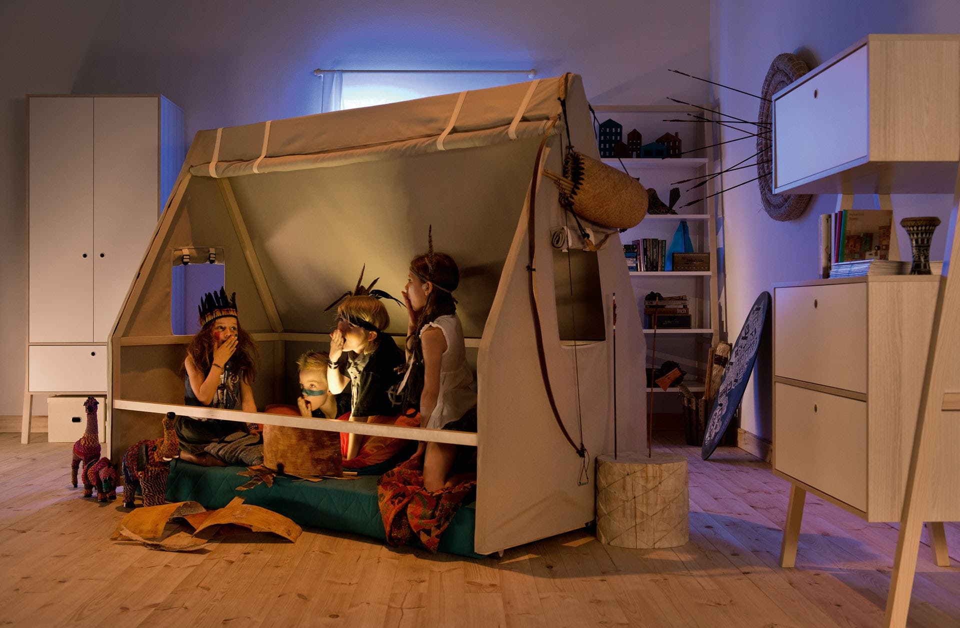 Smaller children can benefit from other imaginative beds that, like the bunk beds, will enable the creation of a base or play centre. A clever solution could be the Spot Young bed. By adding a mobile Tipi trolley to it, you can easily transform the sleeping area into a cosy base that stimulates children's imagination and encourages creative play. The original canopy bed, which can be decorated with a light curtain or lamps, will also help to create an intimate atmosphere.