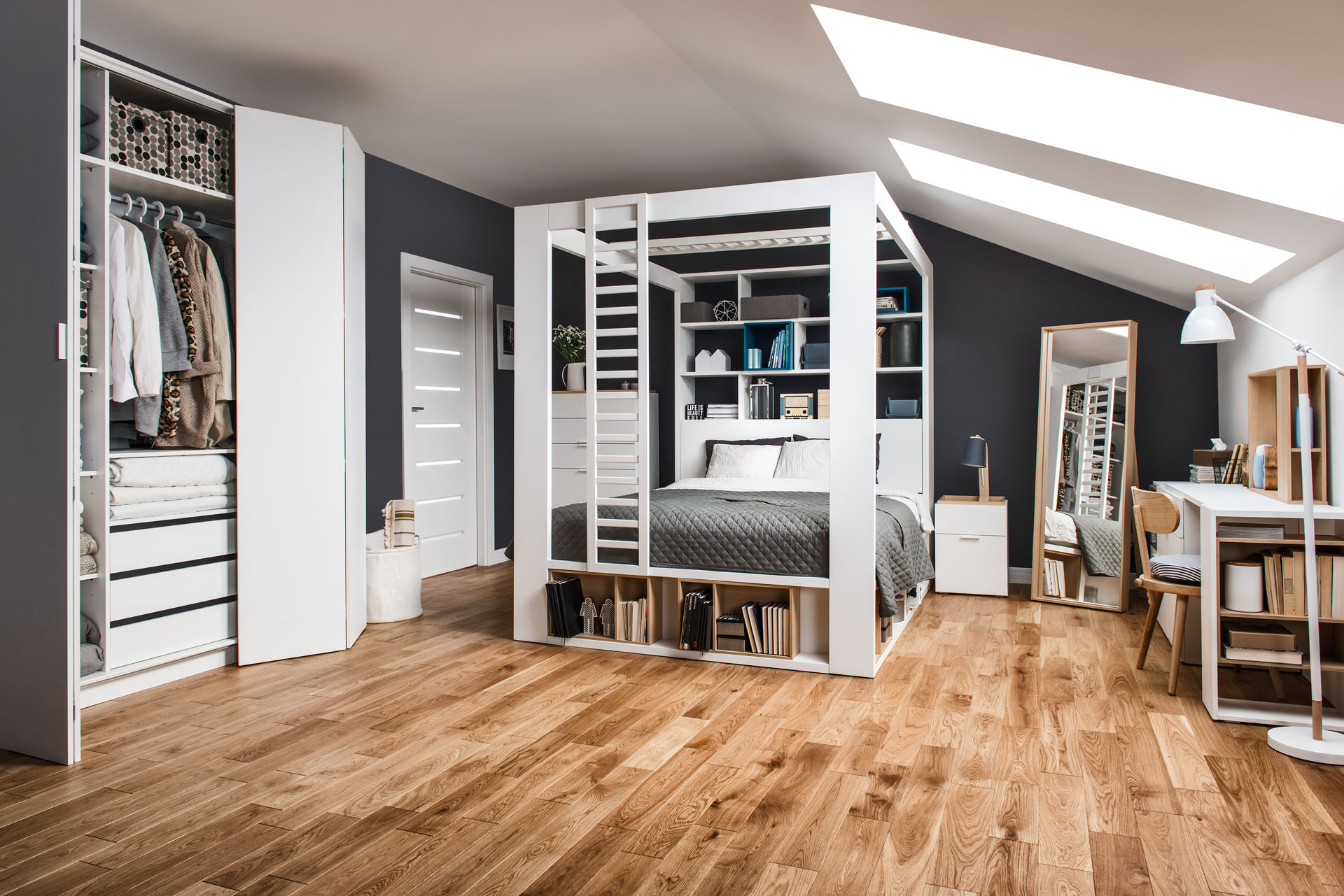 The clever 4 You bed will also help to create a functional arrangement for a small bedroom, with the headboard providing additional storage space. The bookcase has enough space for frames or books to create a private library in the bedroom. The liftable frame, on the other hand, conceals a spacious storage compartment underneath, in which we can store, for example, spare bedding, blankets and pillows. As a result, we no longer need to set up an additional chest of drawers inside. The bed also has a practical canopy and ladders for hanging your favourite ornaments, plants or softly shining beige Happy Lights. There is also an additional alcove just below it - the perfect place for all the things you want to keep close at hand.