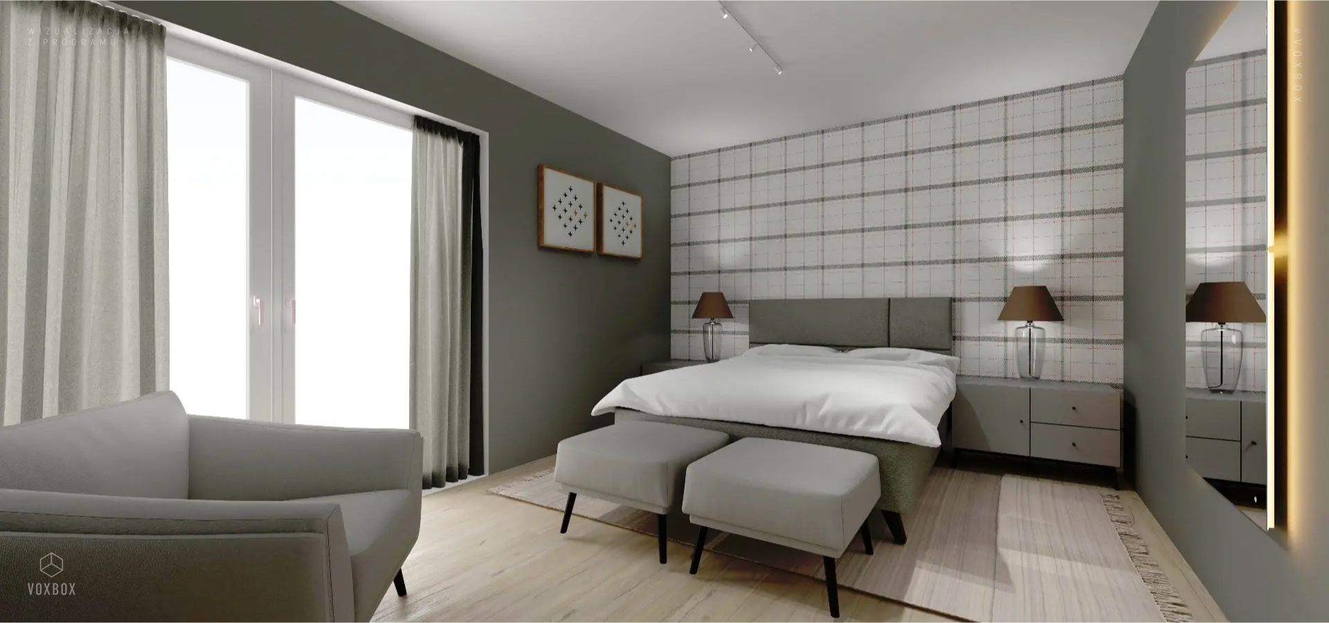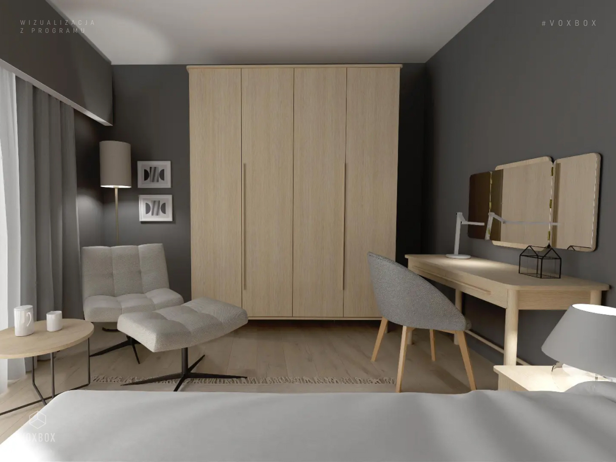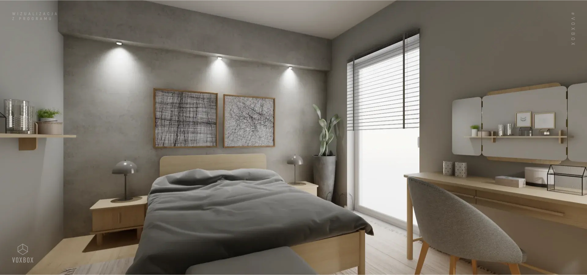 Monotony can be avoided not only by an appropriate use of colours, but also by choosing materials with different textures. Cool shades of grey will beautifully balance out natural floors in a warm, honey-coloured tone. If we want to bring a modern touch to our interiors, we can opt for raw finishing elements. Vinyl floors imitating concrete will beautifully complement the grey walls, creating a cohesive bedroom arrangement.
