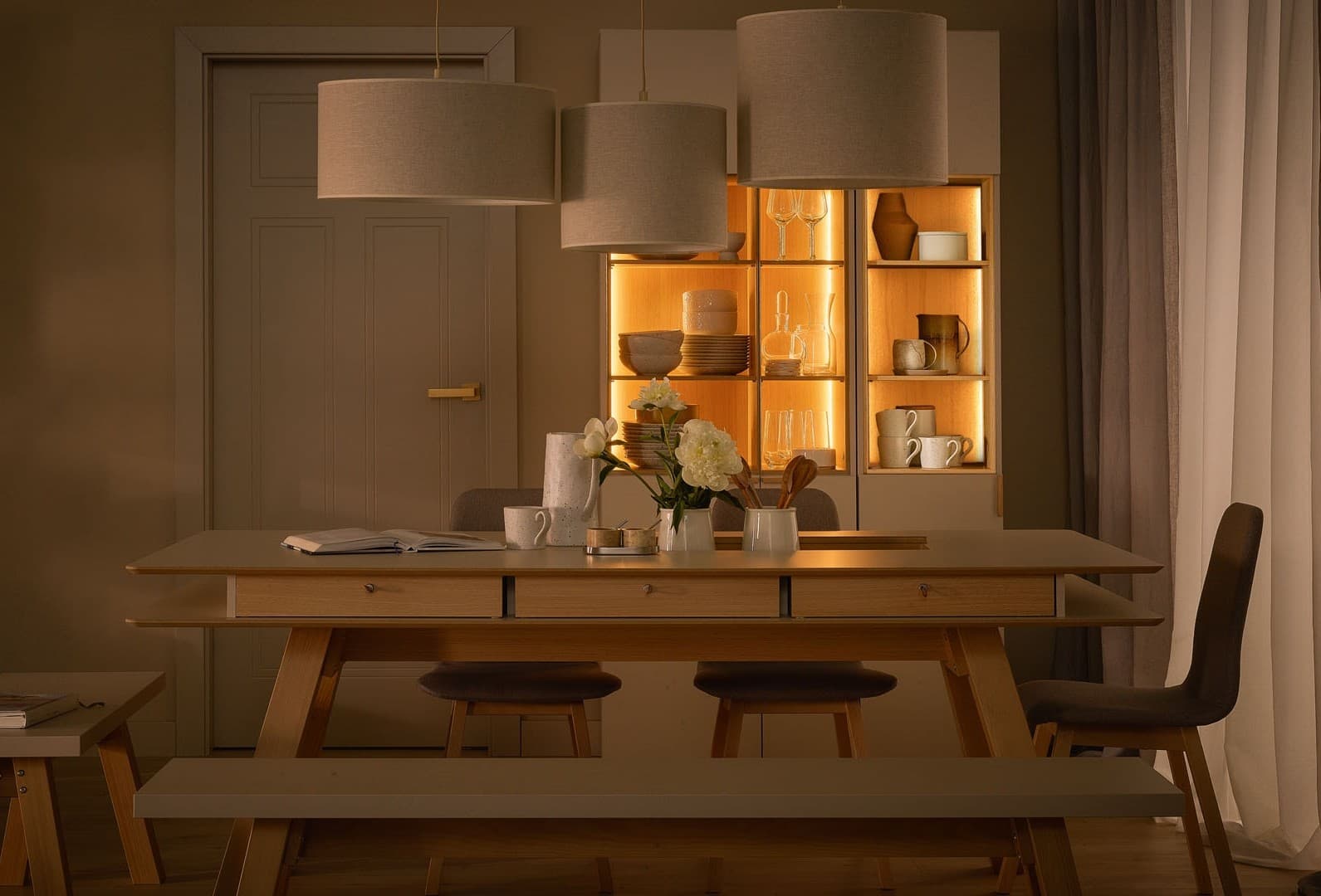 Large, wide shades look better when hung a little higher, as they do not overwhelm the interior and do not restrict the field of view of those sitting at the table. Slenderer models and smaller lamps can be hung a little lower - then there is no risk that they will dominate the space or disturb its proportions.
