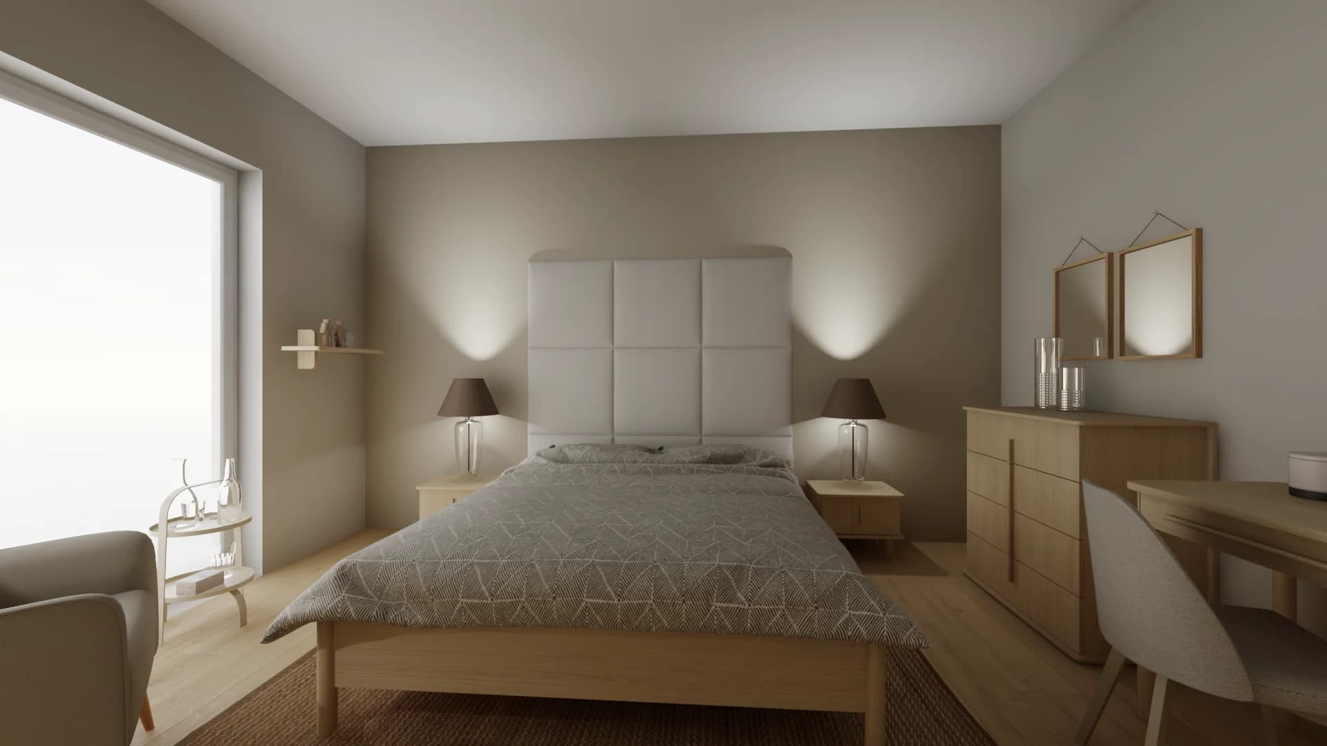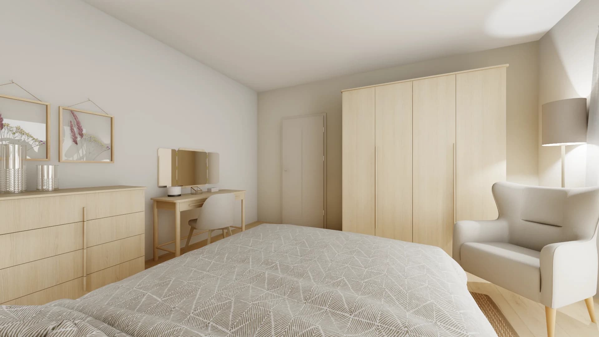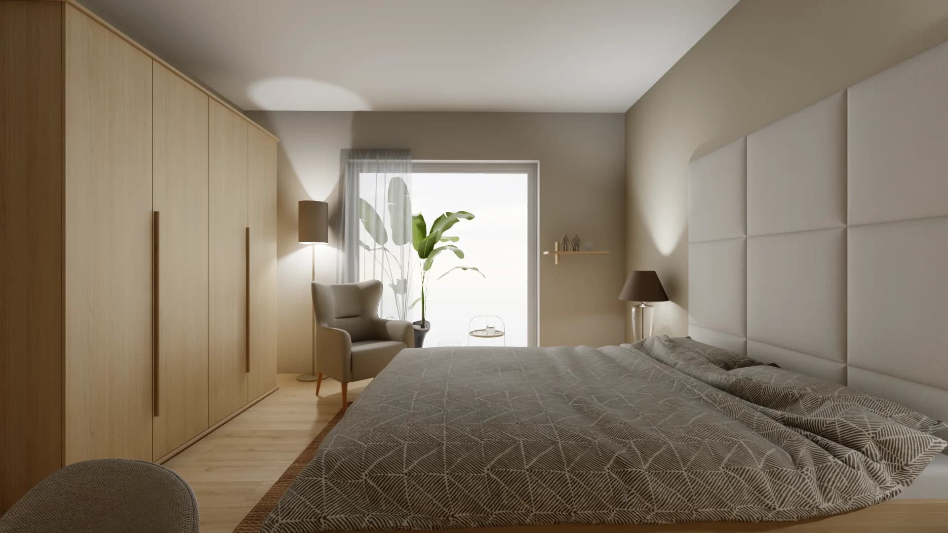A true oasis of relaxation for her and him. At its centre is a large bed with a high headboard made of upholstered panels. The four-door wardrobe provides space for wardrobe items and various accessories. A comfortable ear cushion by the window encourages an evening with a book. Getting ready in the morning is facilitated by a neat dressing table with an upholstered chair.
