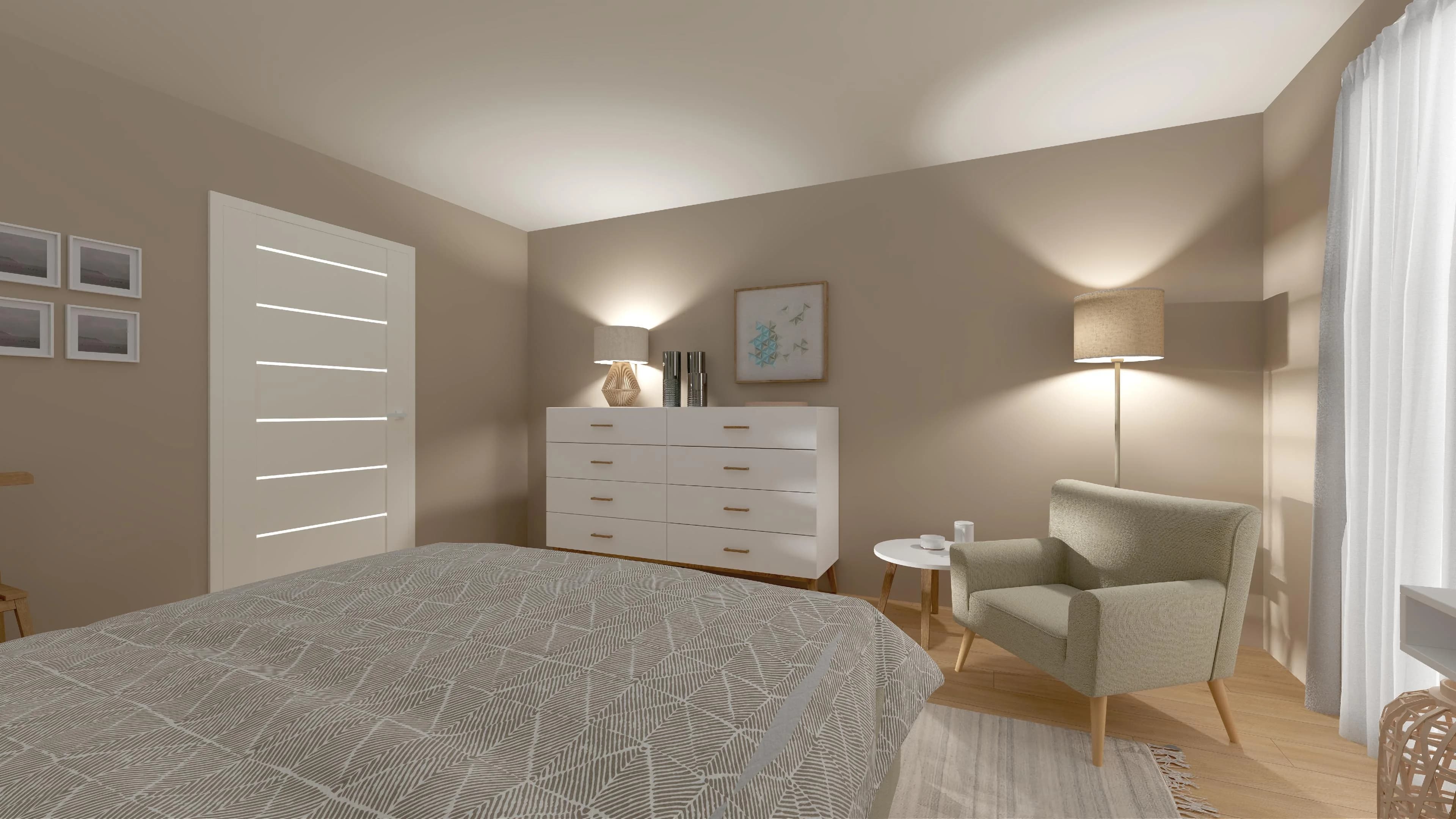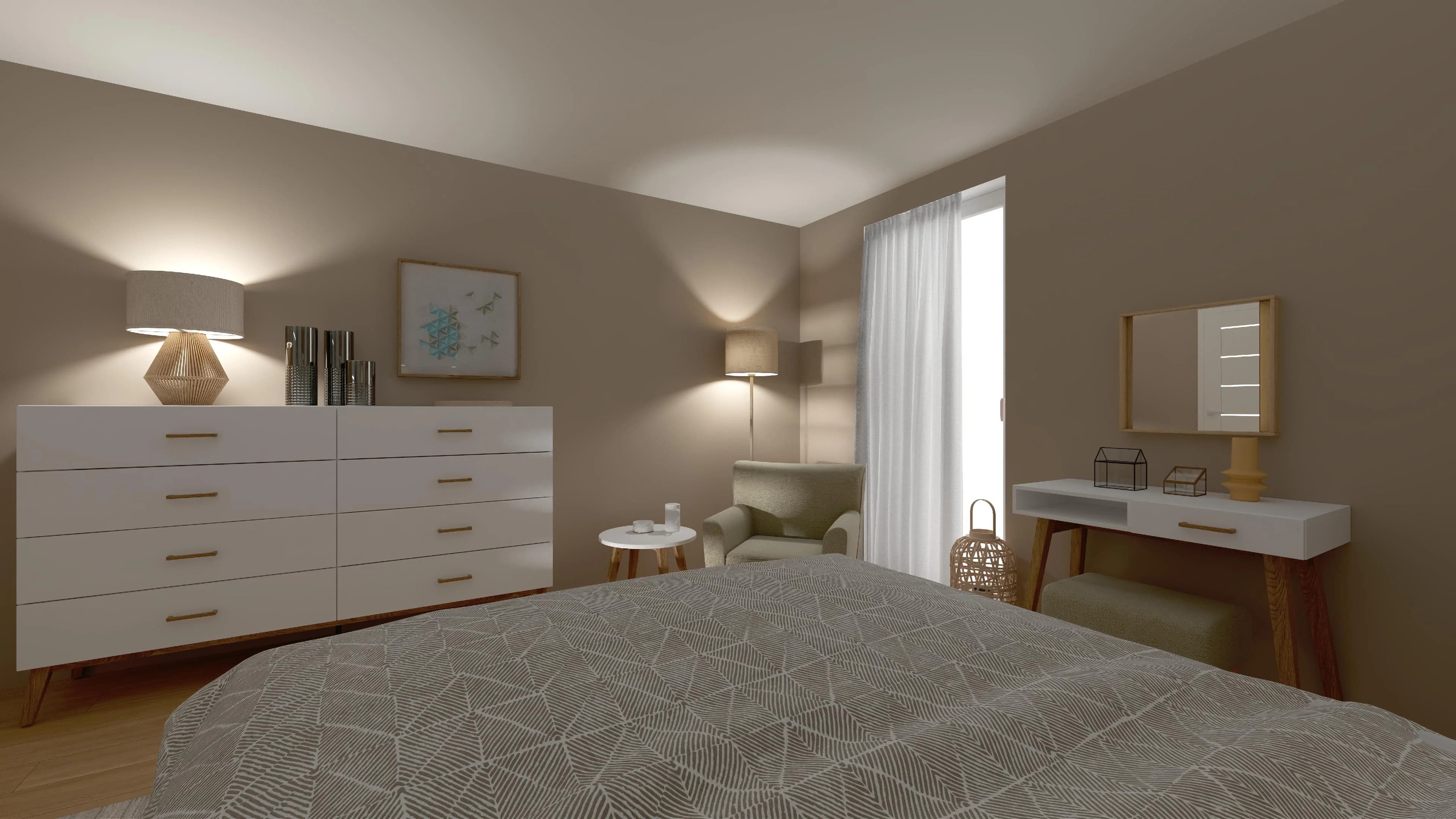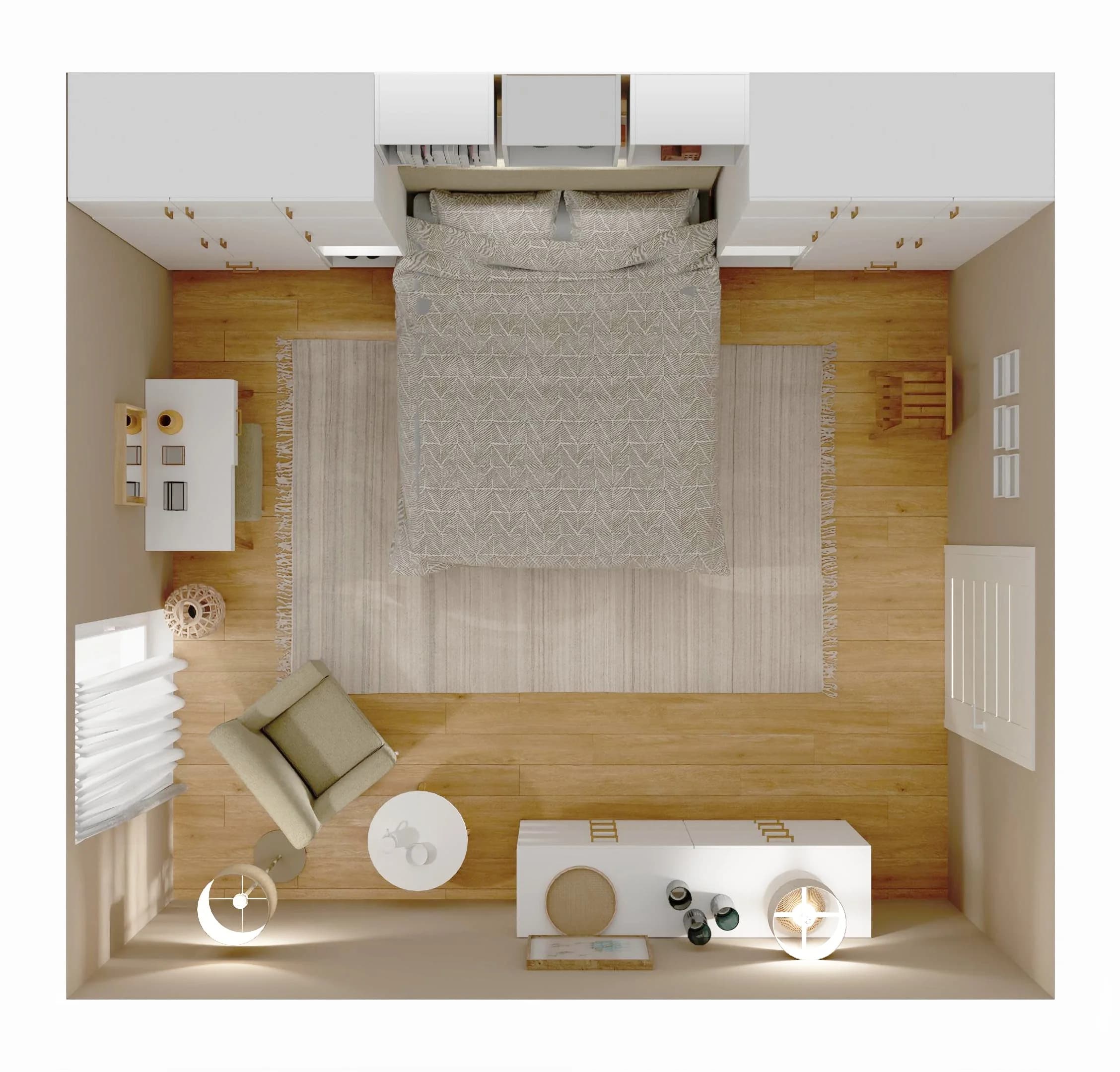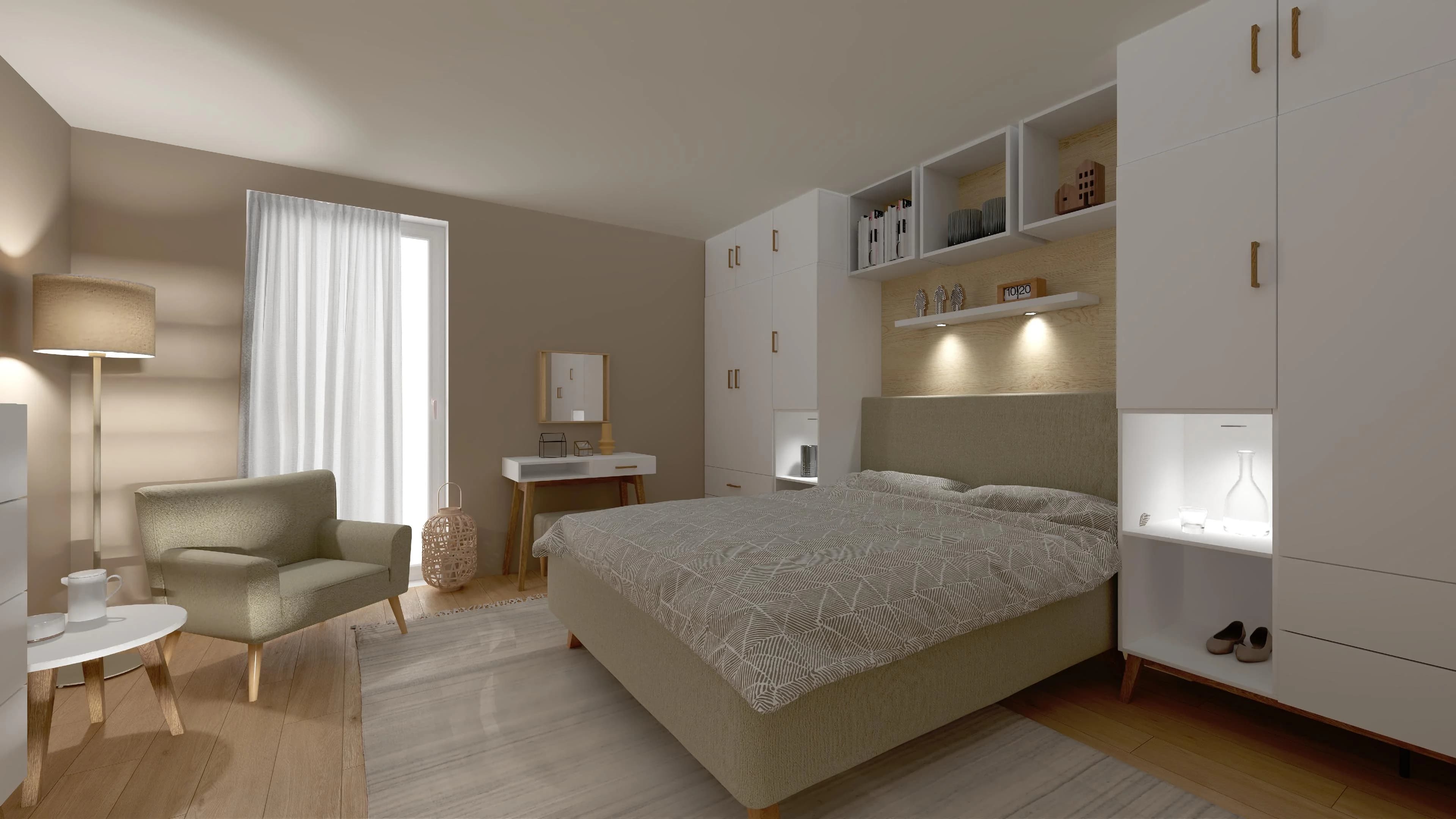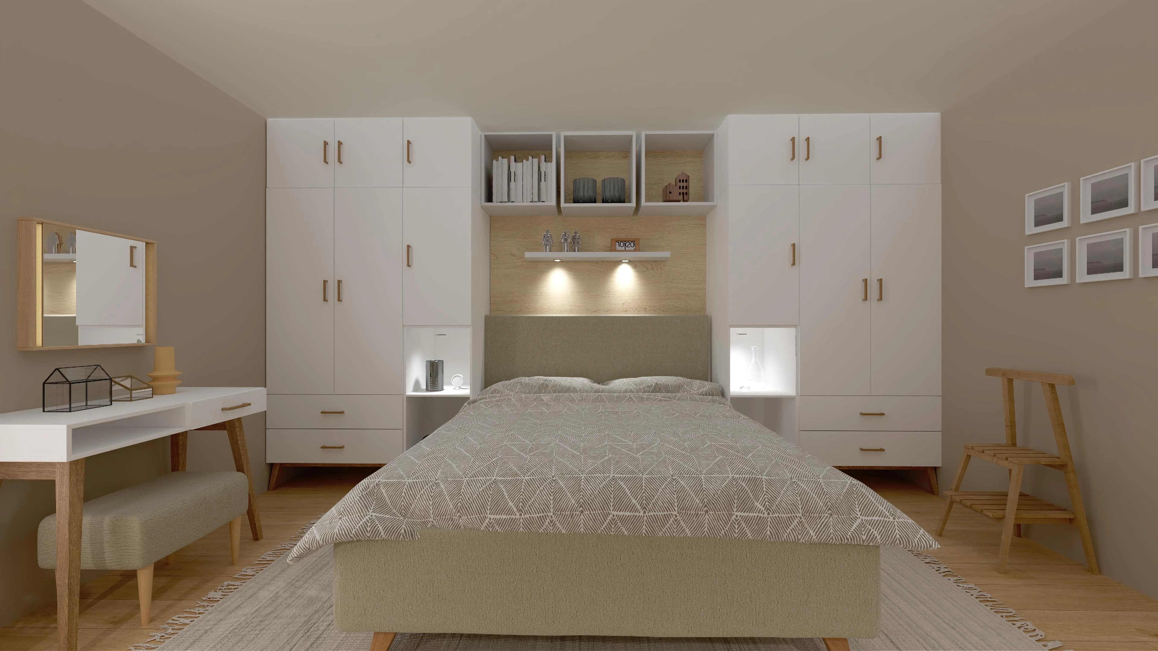 Kiedy miejsca w sypialni jest niewiele, z pomocą przychodzą pomysłowe meble. Dwie szafy idealnie sprawdzą się jako garderoba dla niej i dla niego. Brak szafek nocnych rekompensują wnęki, do których można odłożyć potrzebne drobiazgi. Ustawione na środku łóżko pozwala wygodnie się wyspać. Przy gustownej toaletce można zadbać o urodę lub chwilę popracować.