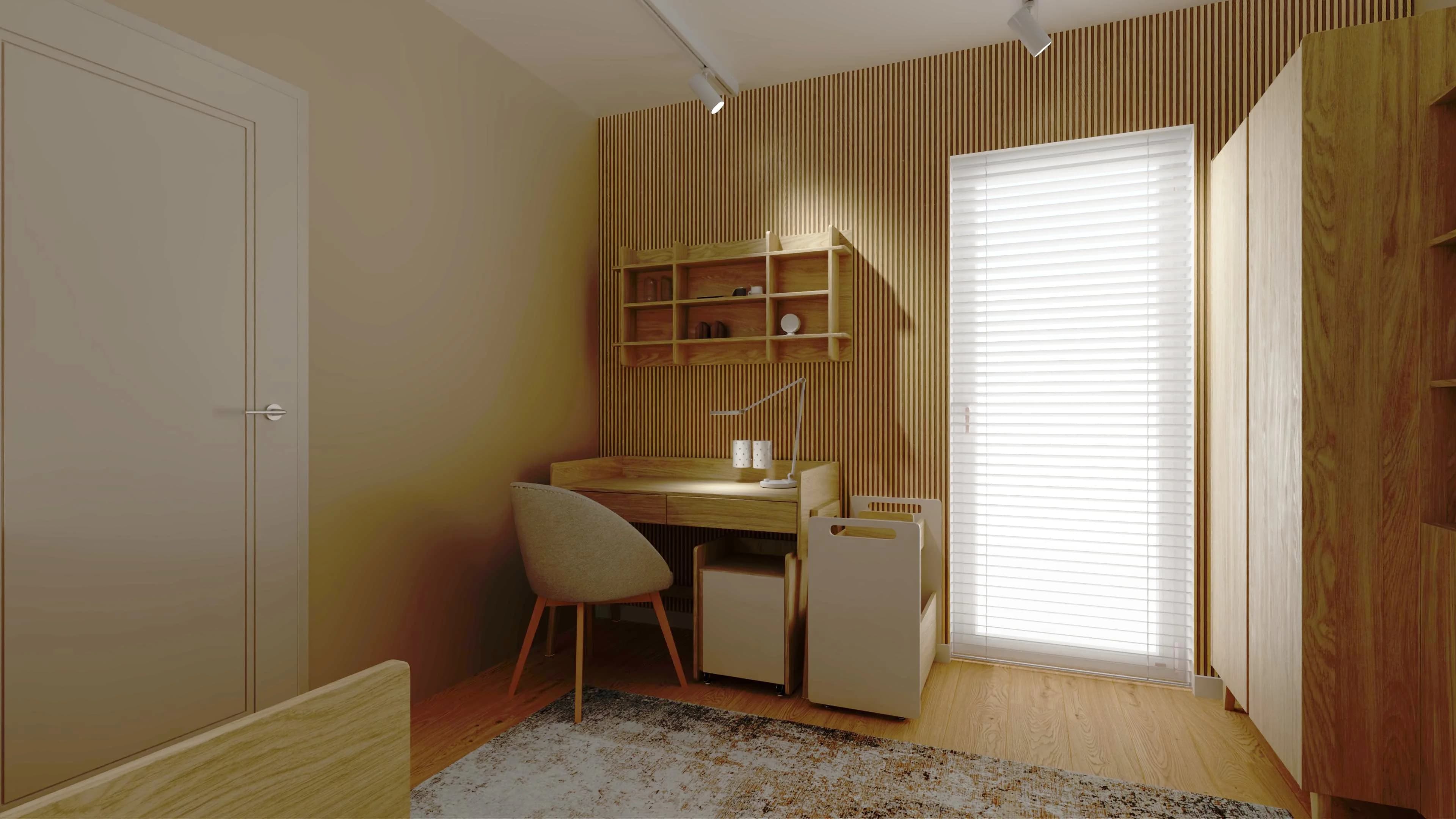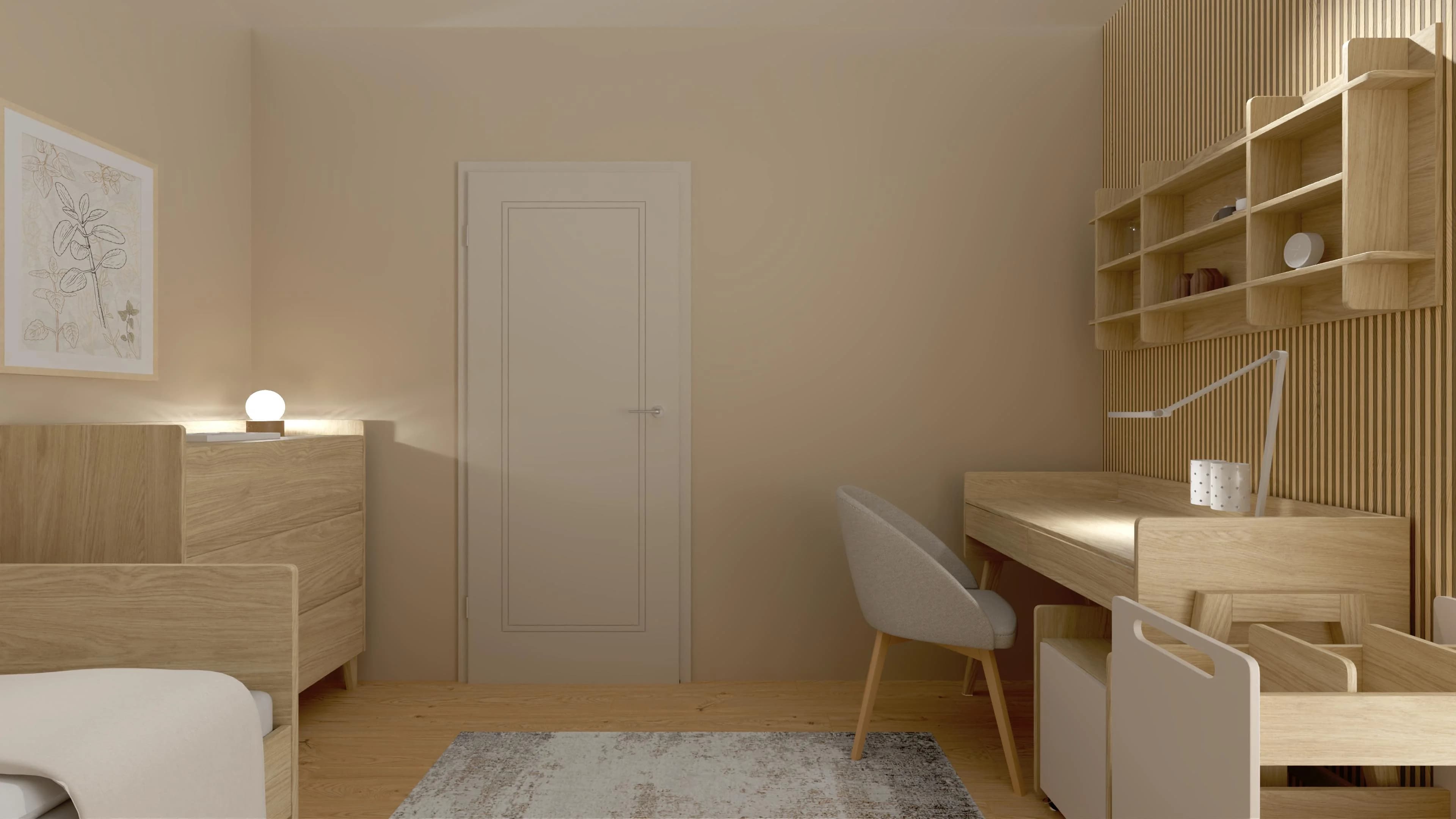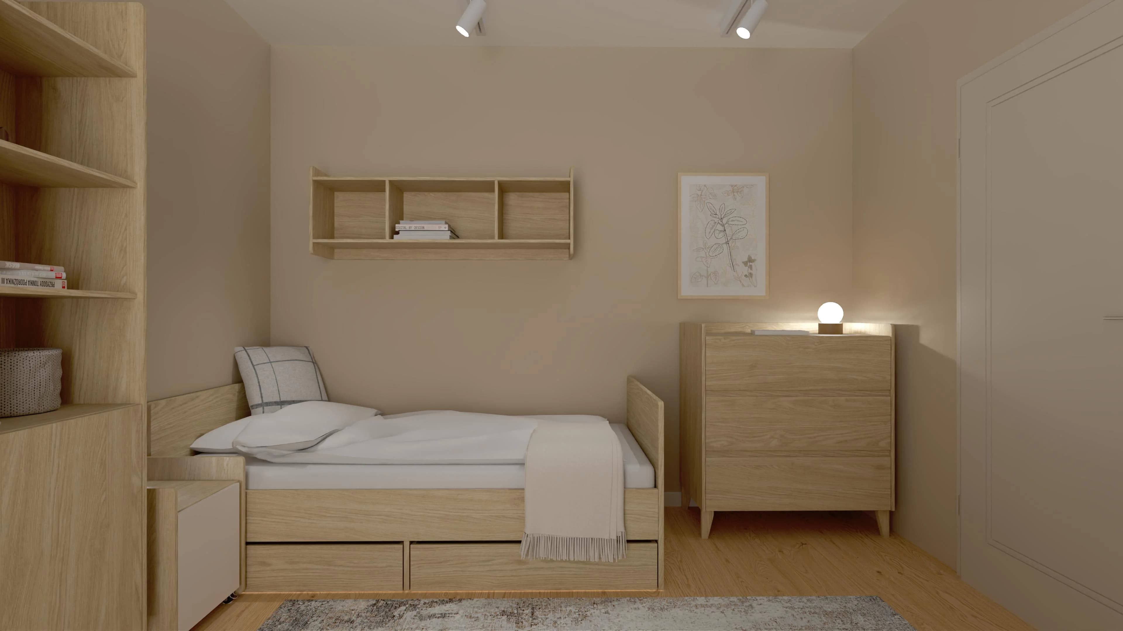 W tej harmonijnej przestrzeni łatwo się zrelaksować, uczyć i rozwijać swoje pasje. Przytulną atmosferę tworzą ciepłe odcienie beżu i drewna. Łóżko z miękką pościelą zaprasza do odpoczynku, a dzięki dodatkowym szufladom pełni również funkcję praktycznego schowka. Strefę nauki wyznacza dekoracyjna ściana z lameli oraz funkcjonalne biurko z kontenerkiem na podręczne drobiazgi.