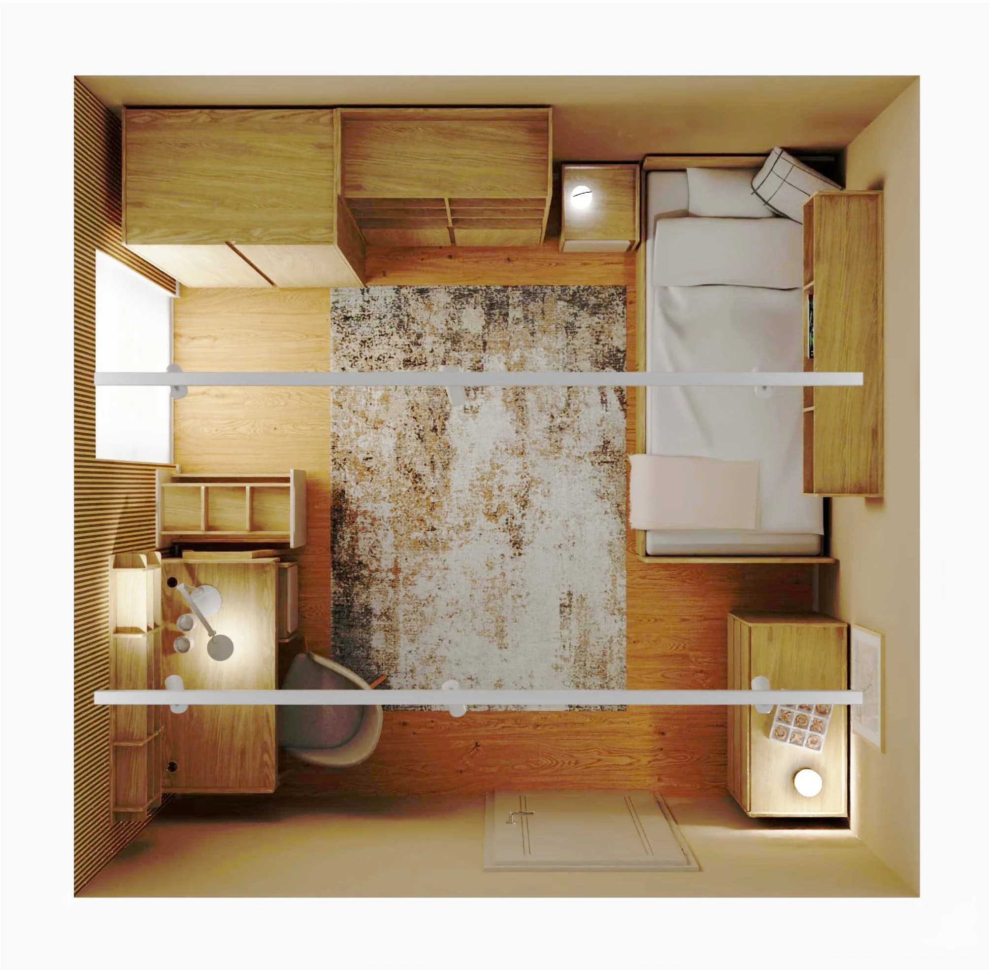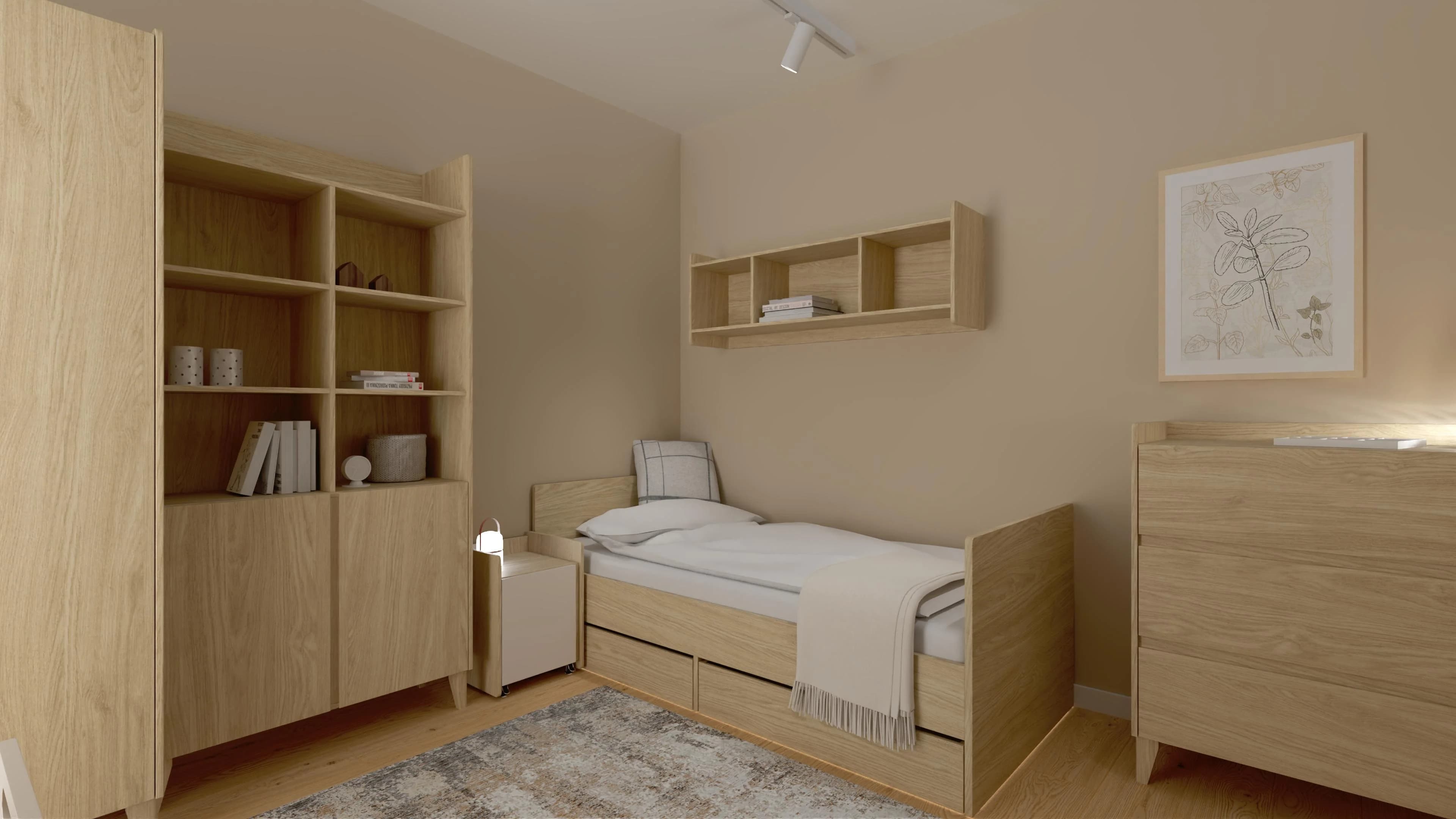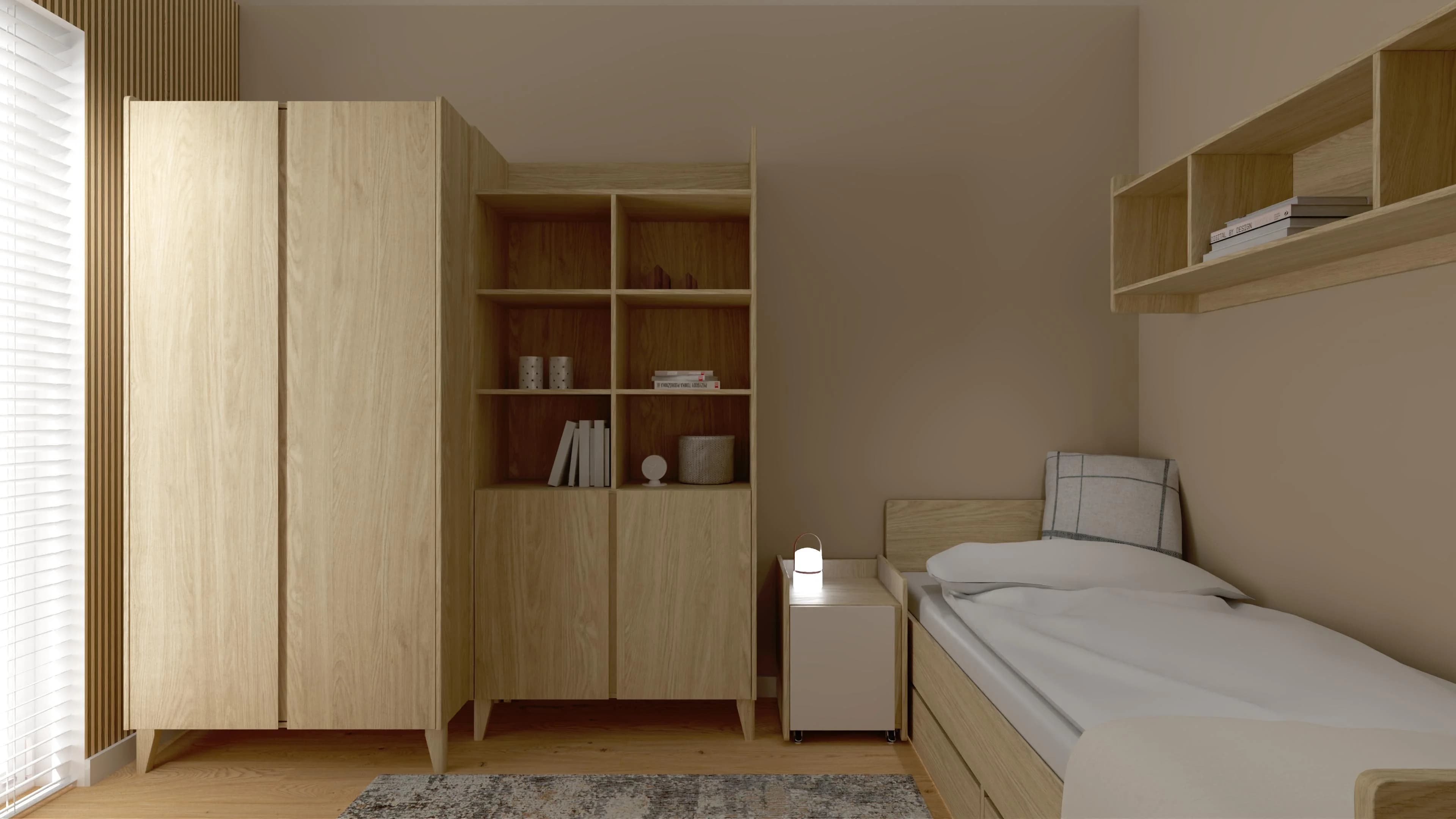 W tej harmonijnej przestrzeni łatwo się zrelaksować, uczyć i rozwijać swoje pasje. Przytulną atmosferę tworzą ciepłe odcienie beżu i drewna. Łóżko z miękką pościelą zaprasza do odpoczynku, a dzięki dodatkowym szufladom pełni również funkcję praktycznego schowka. Strefę nauki wyznacza dekoracyjna ściana z lameli oraz funkcjonalne biurko z kontenerkiem na podręczne drobiazgi.