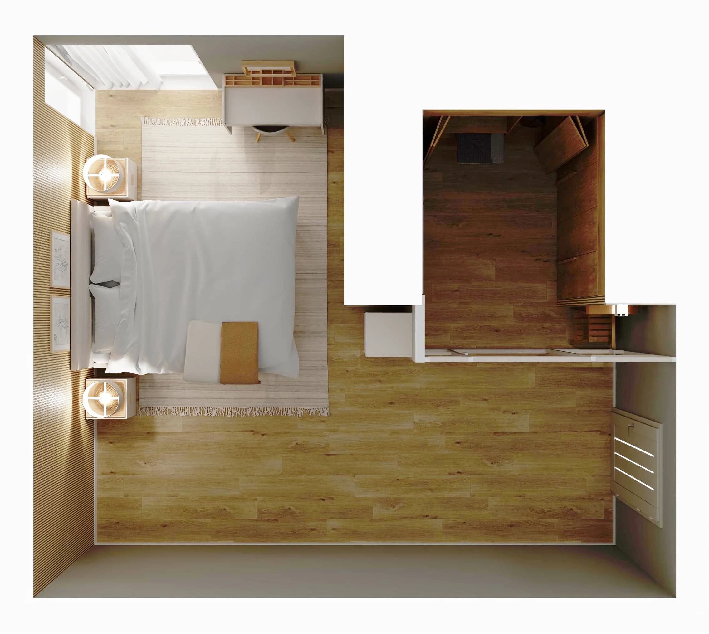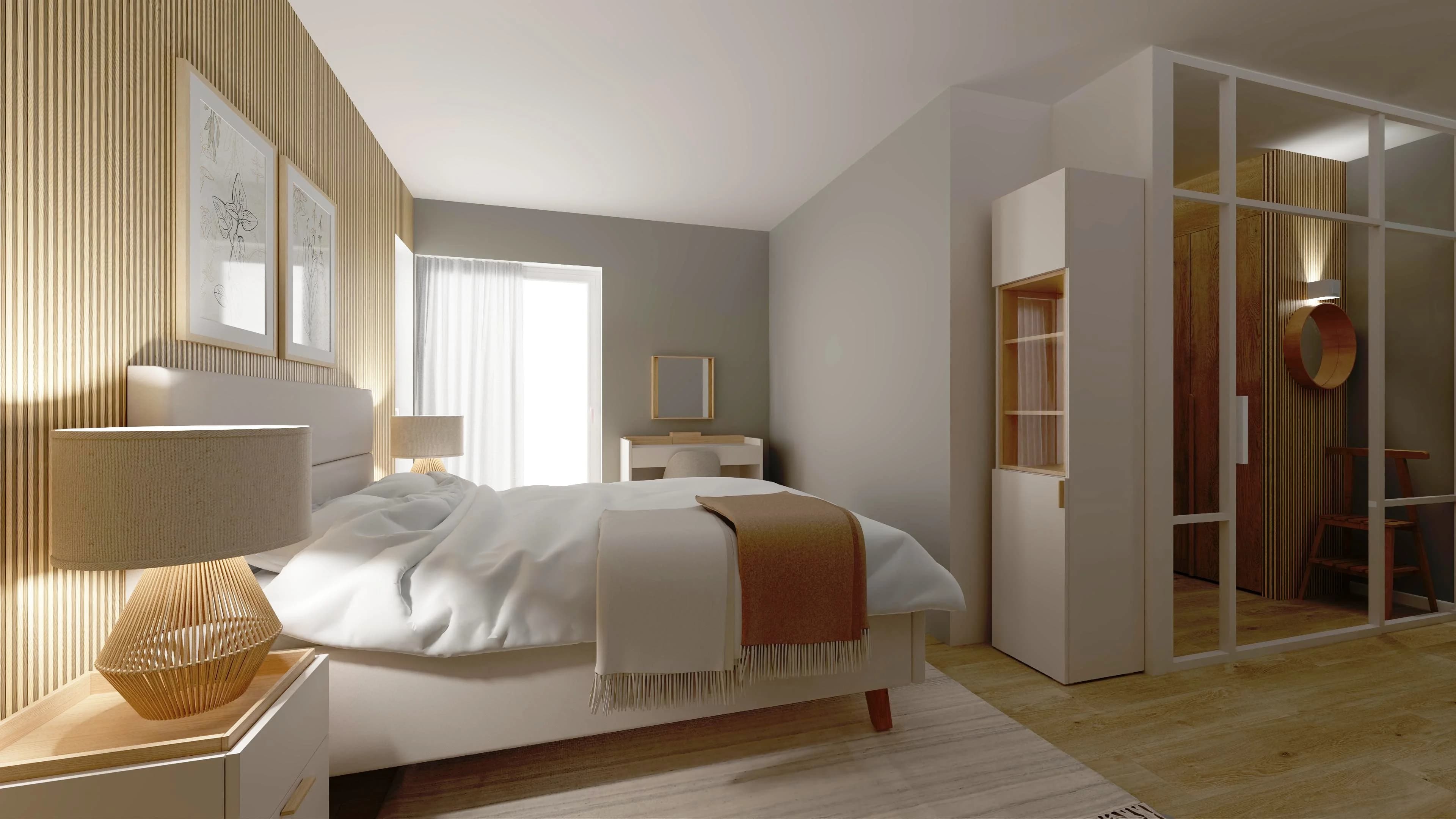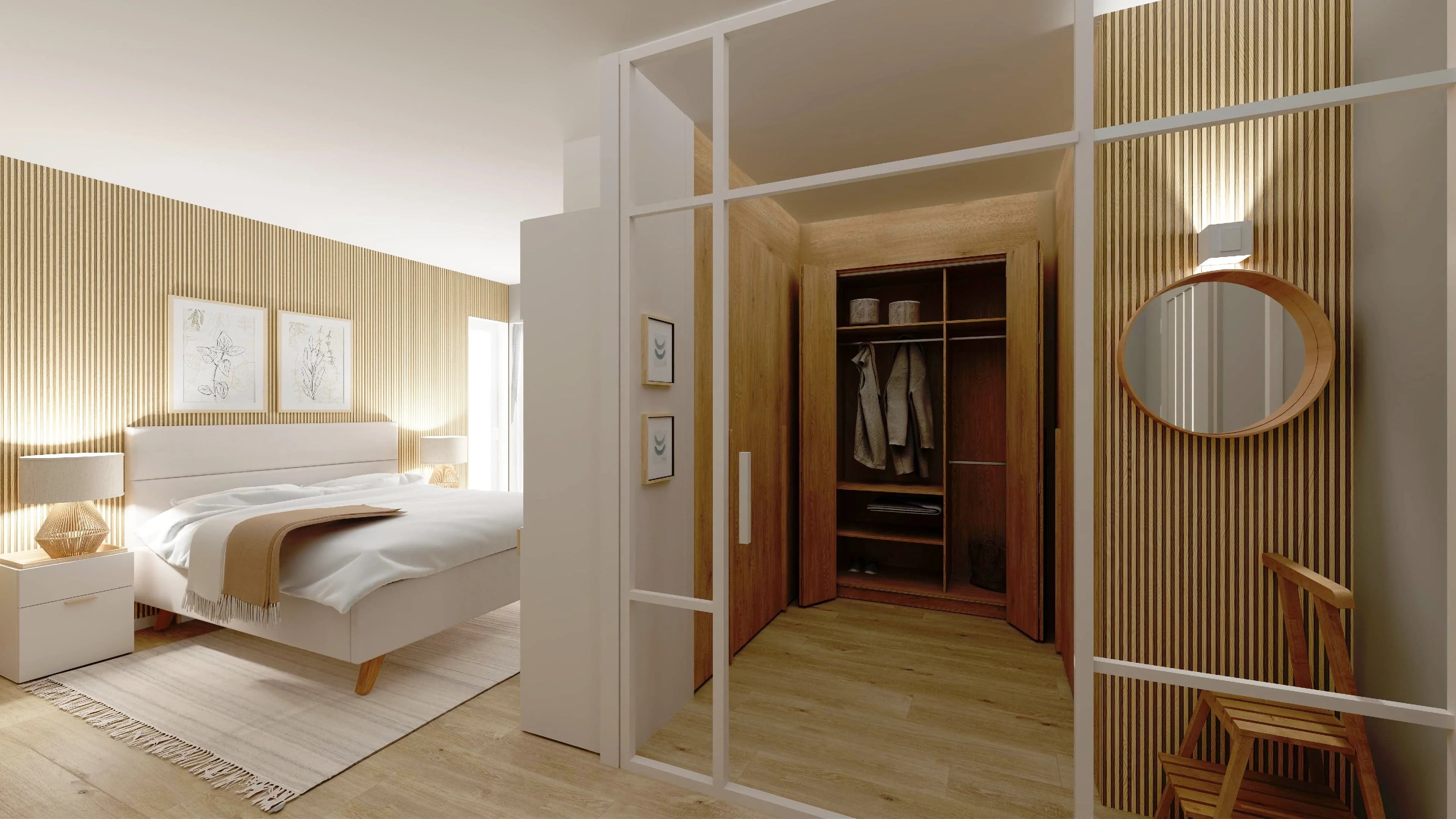 Funkcjonalna przestrzeń sypialni łączy nowoczesność z przytulnym klimatem. Jasna kolorystyka optycznie powiększa wnętrze. Centralnym punktem jest duże łóżko z miękkim wezgłowiem oraz ściana lameli w ciepłym odcieniu drewna. Za loftową ścianką znajdują się trzy szafy (160x225, 125x225 i 160x225 cm) z mnóstwem miejsca na elementy garderoby.