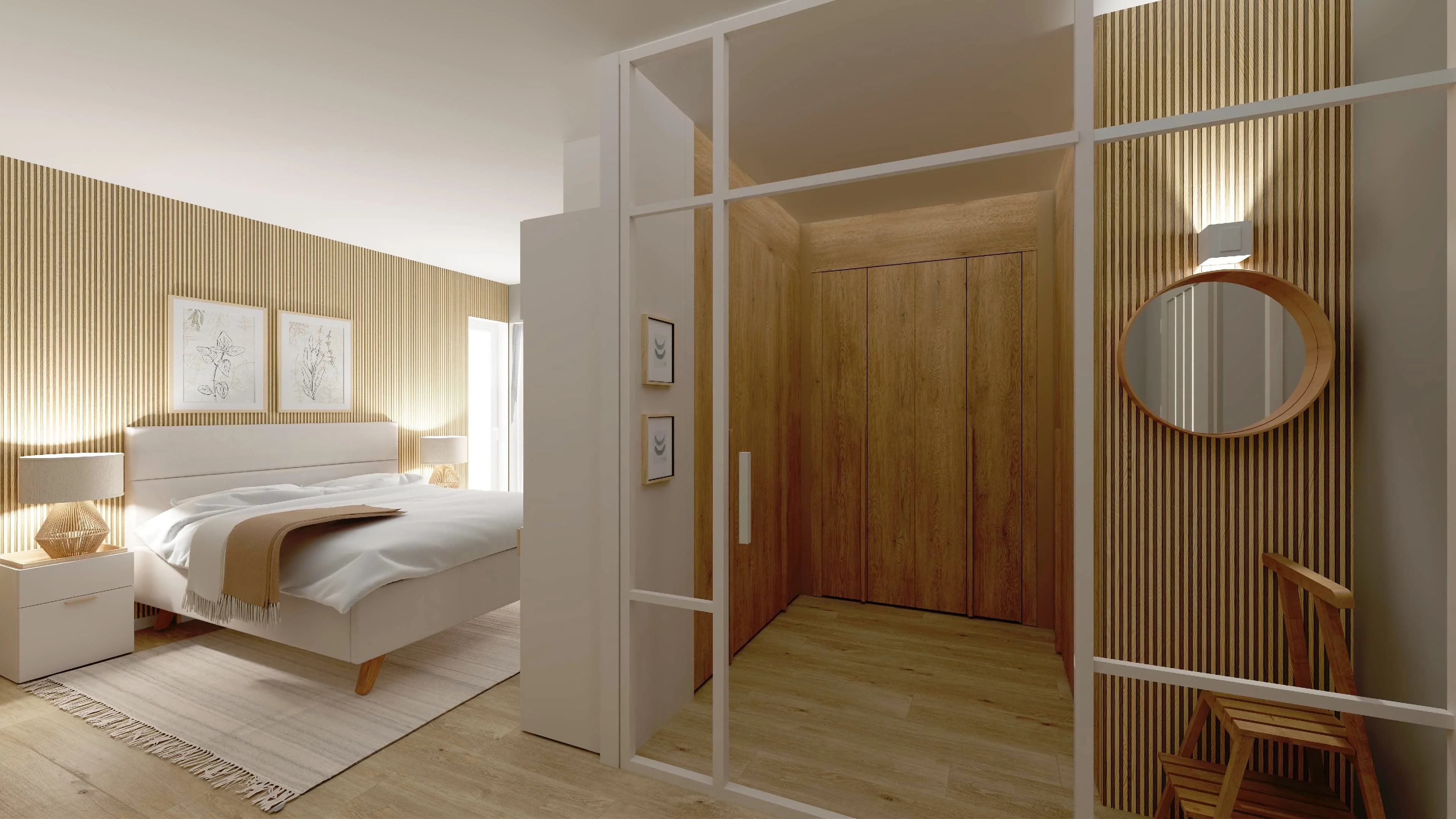Biało-dębowa sypialnia z wydzieloną garderobą