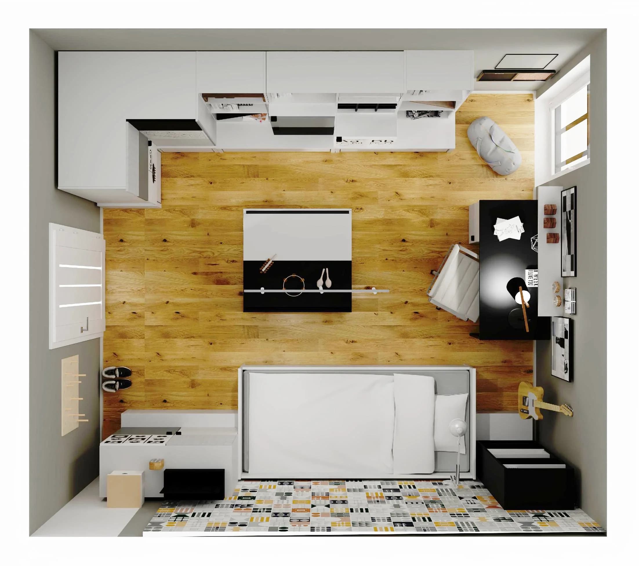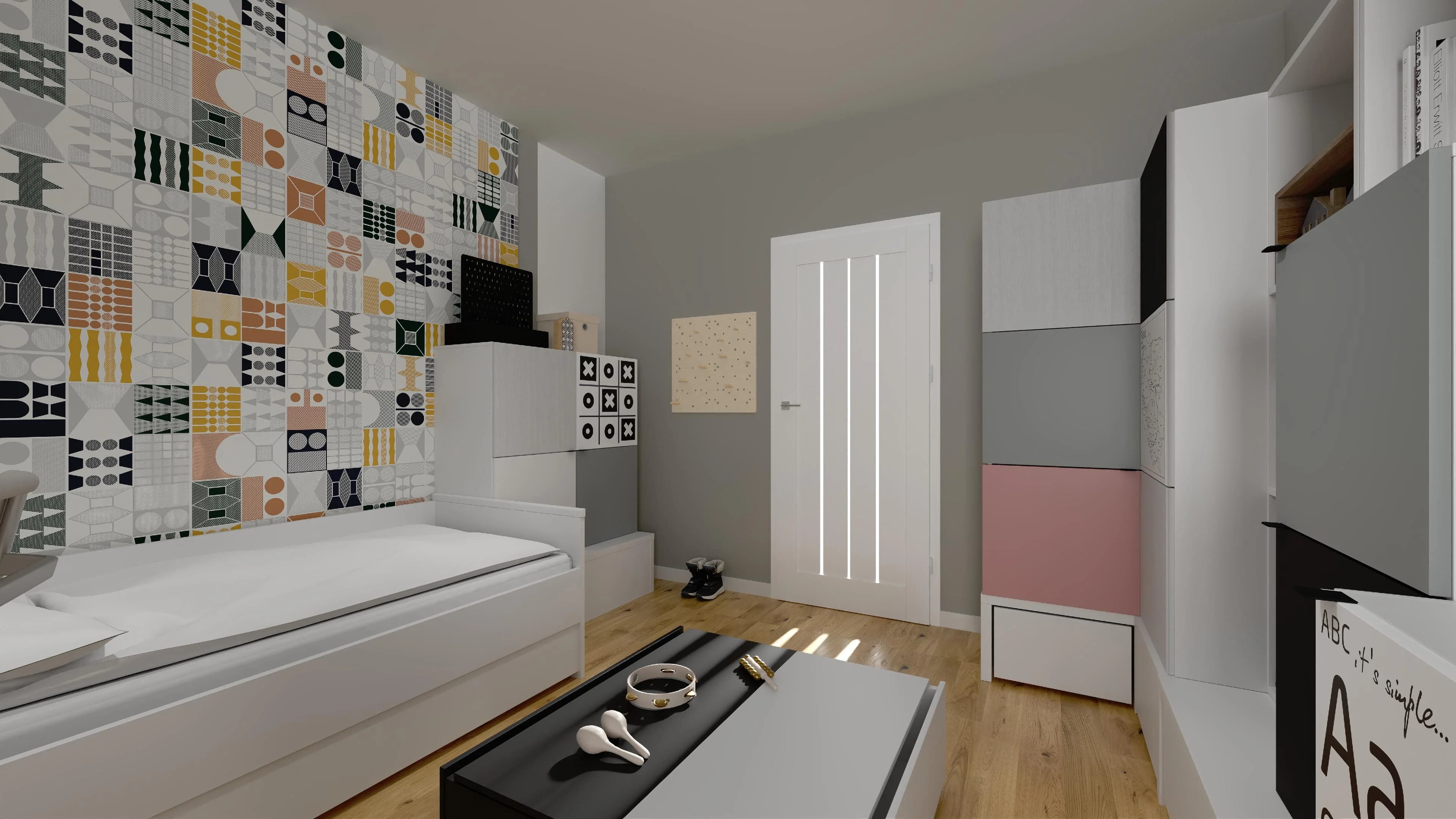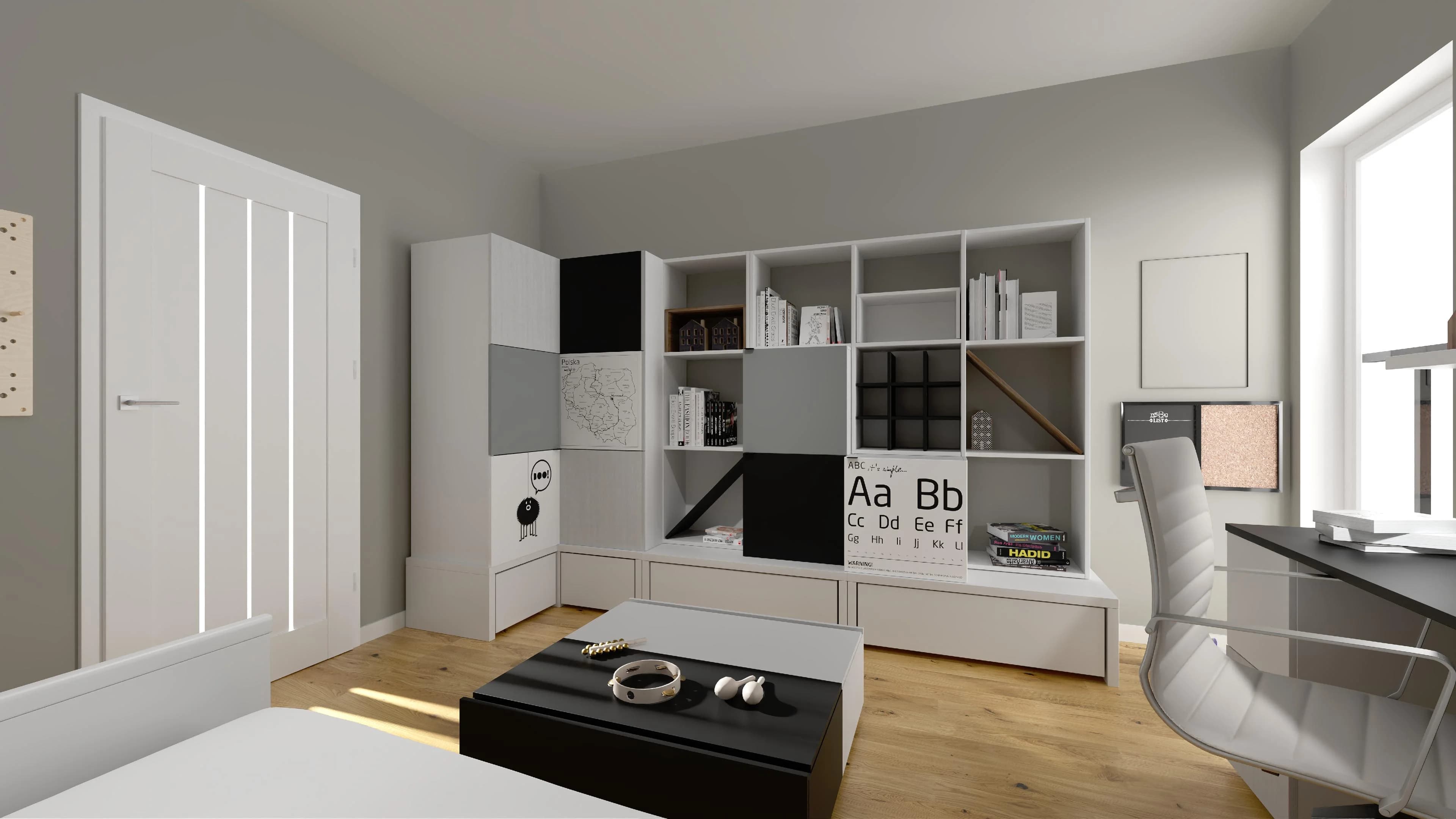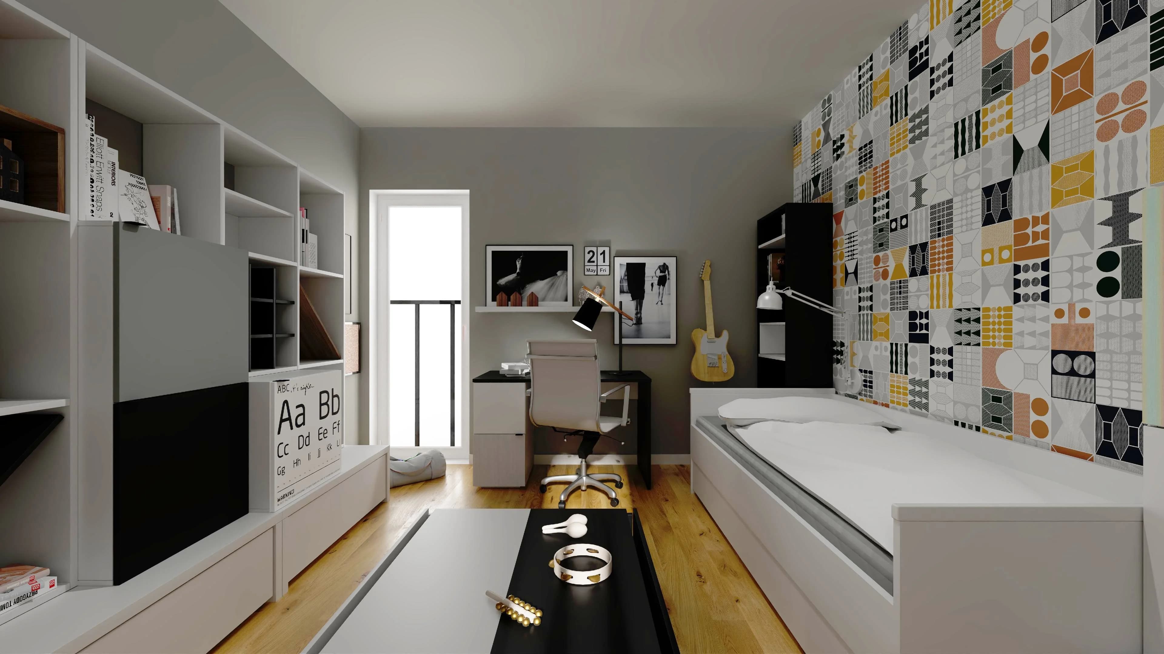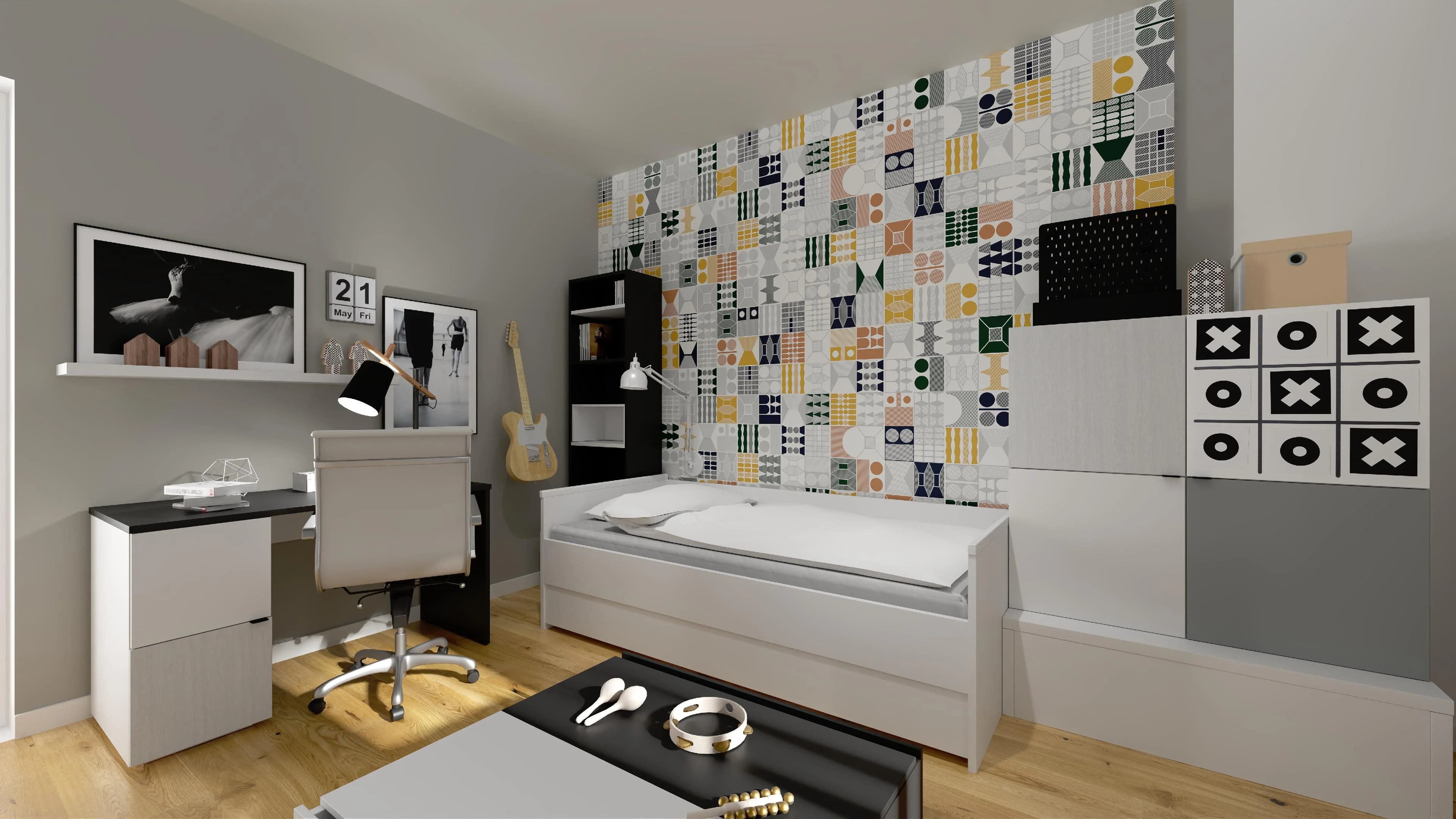 Dzięki geometrycznym panelom ściennym minimalistyczna przestrzeń zyskuje oryginalny charakter. Klasyczną szafę zastępują pomysłowe meble z dużą ilością schowków – sprawdzą się do przechowywania ubrań, książek i prywatnych skarbów. Wygodną przestrzeń do nauki oferuje biurko z obrotowym krzesłem, a miły wypoczynek gwarantuje łóżko z lampką nocną.