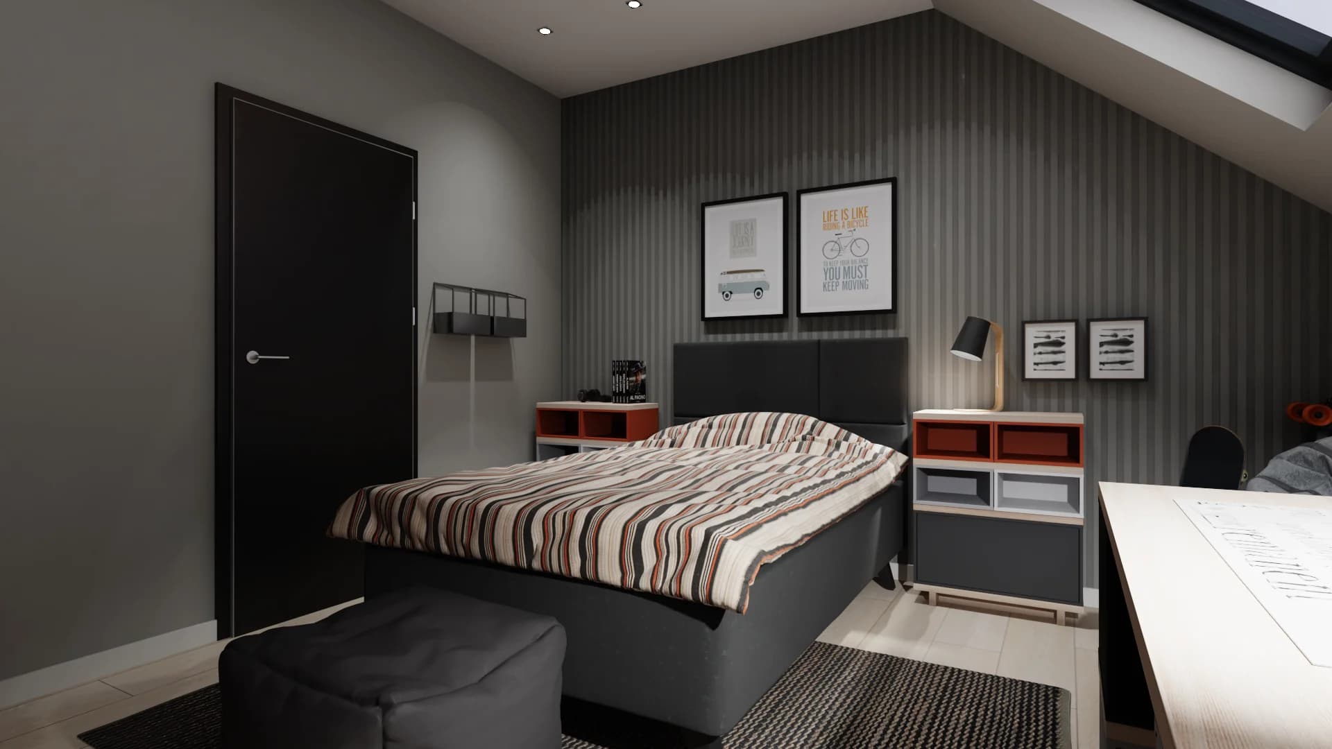 Red and grey teenager's room in the attic