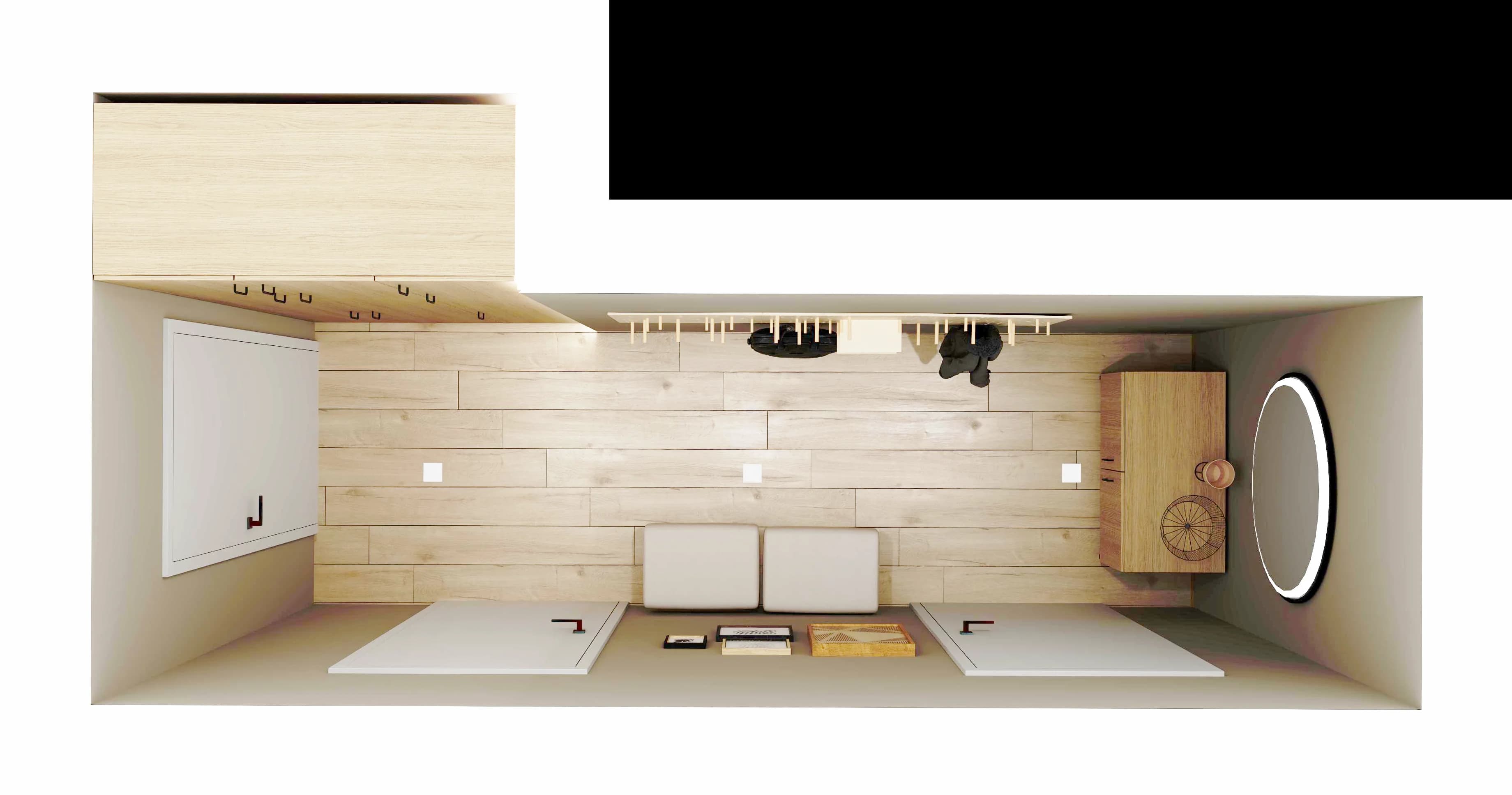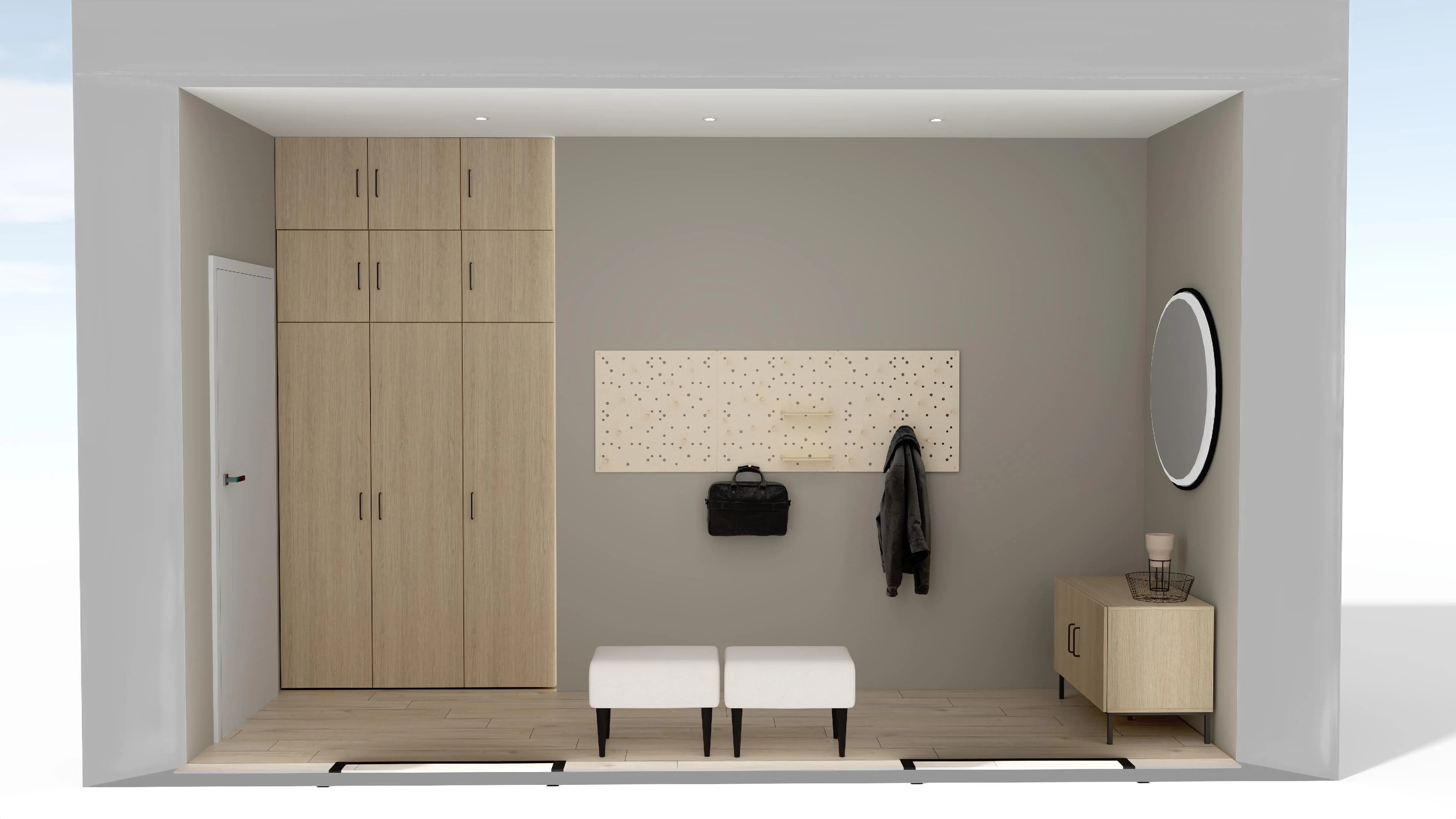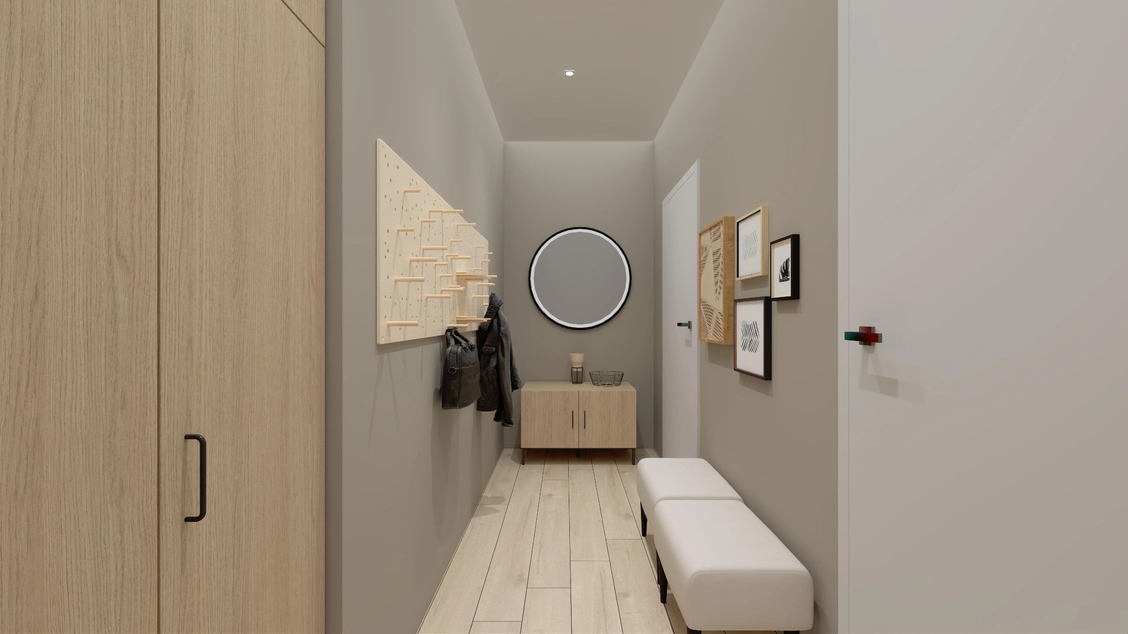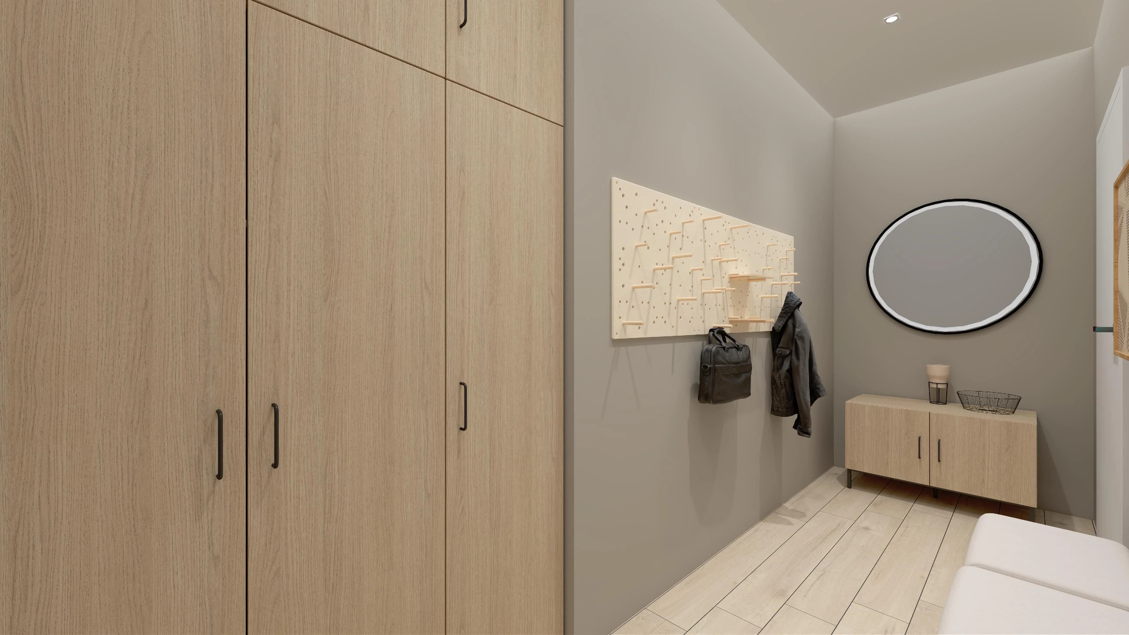Ten nieustawny, wąski przedpokój jest pełen praktycznych rozwiązań. Dzięki szafie we wnęce udało się maksymalnie wykorzystać dostępną przestrzeń i stworzyć miejsce do przechowywania rzeczy domowników. Powieszona na ścianie tablica pełni funkcję wieszaka i organizera na drobiazgi, a w okrągłym lustrze można przejrzeć się przed wyjściem.