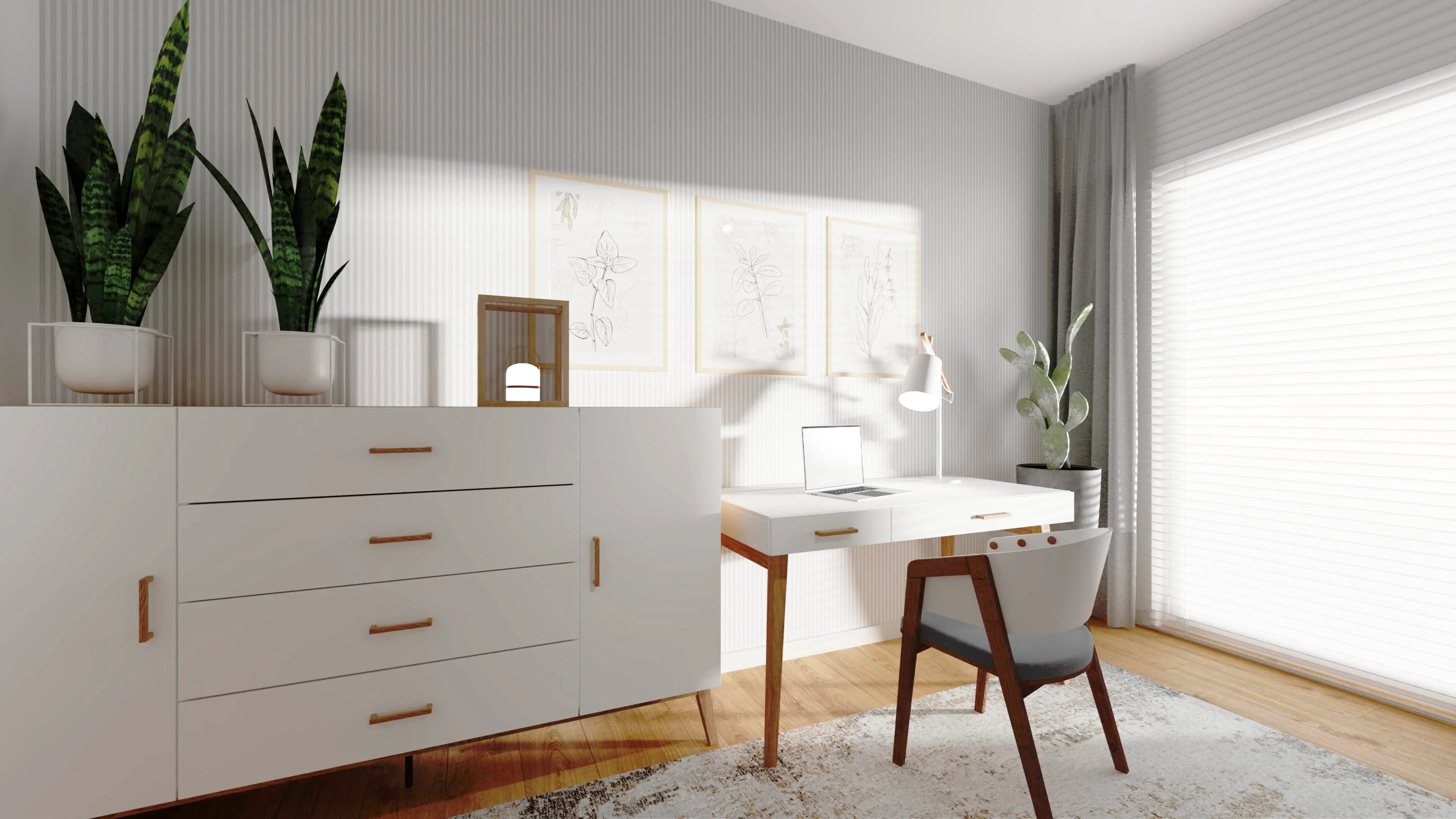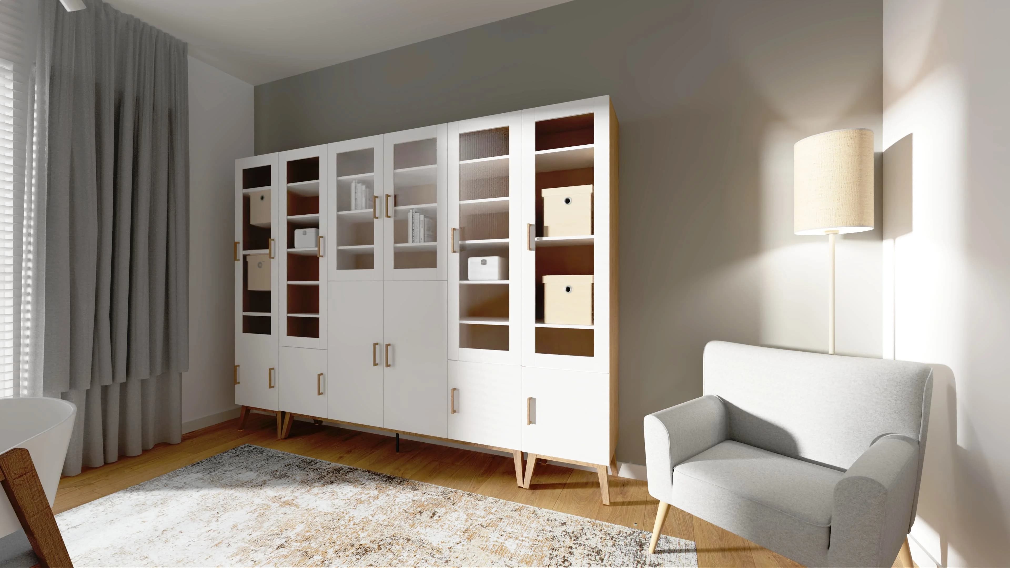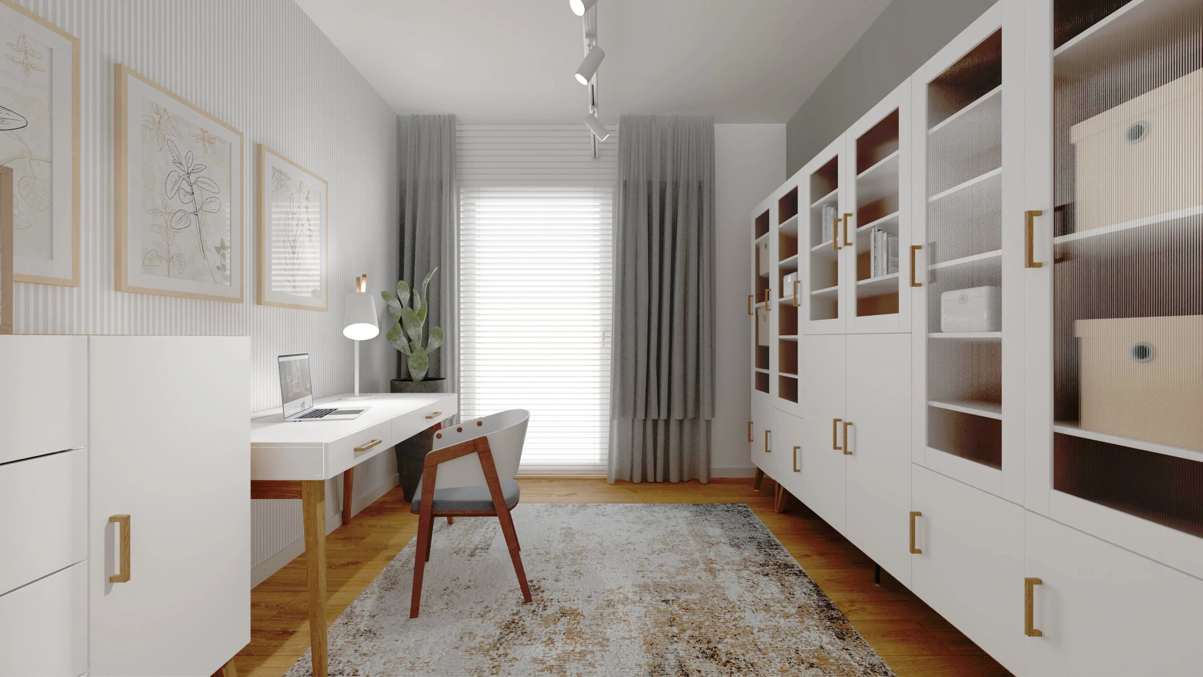 Przestronny domowy gabinet to idealne miejsce do pracy i nauki. Duże witryny wypełnione książkami zachęcają do odkrywania nowych historii, a komfortowe biurko z wygodnym krzesłem tworzą funkcjonalną strefę roboczą. Miękki dywan i jasne plakaty na ścianach dodają wnętrzu ciepła. Dodatkową lekkość i wyciszenie wprowadzają białe lamele na ścianie.