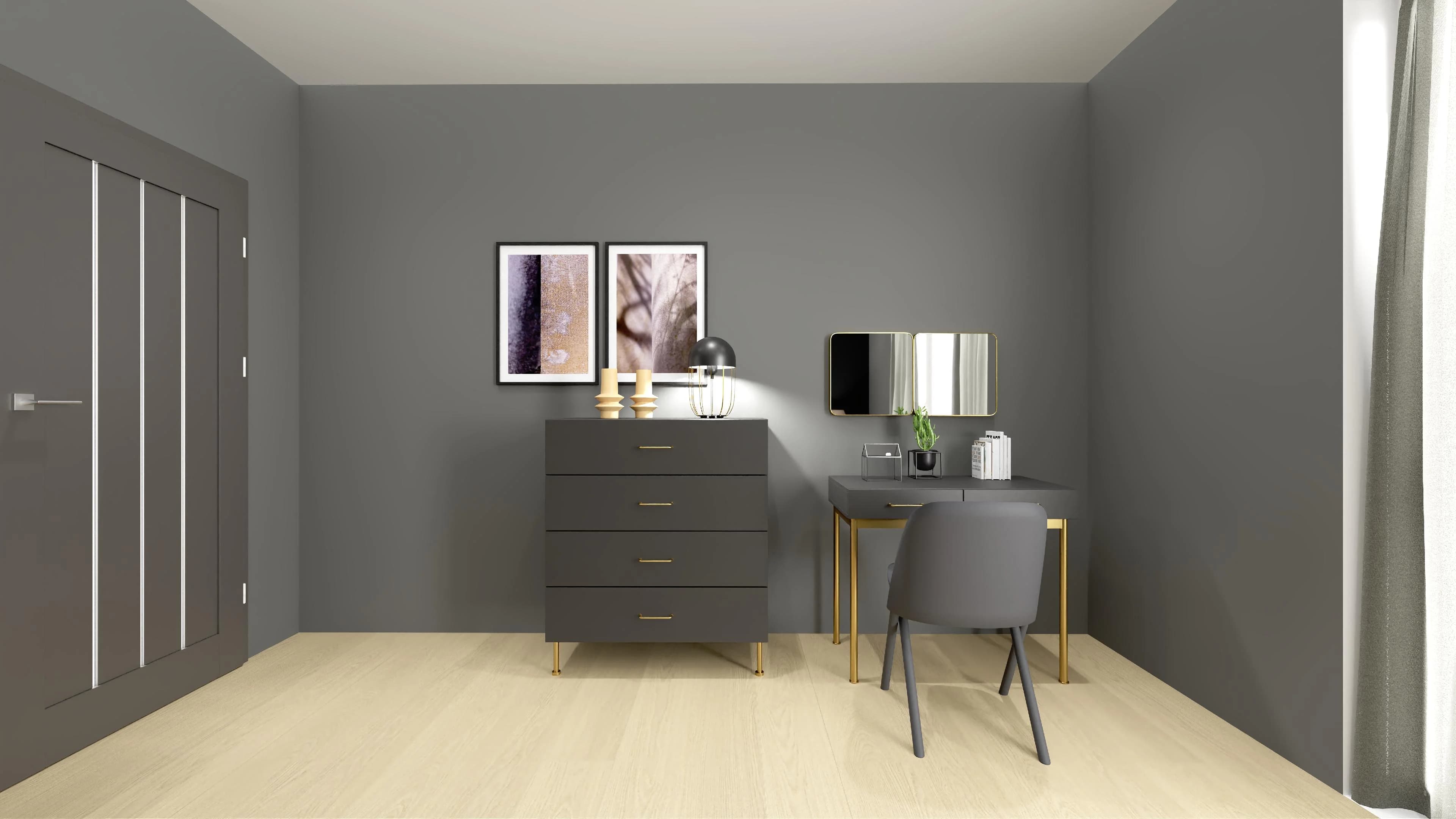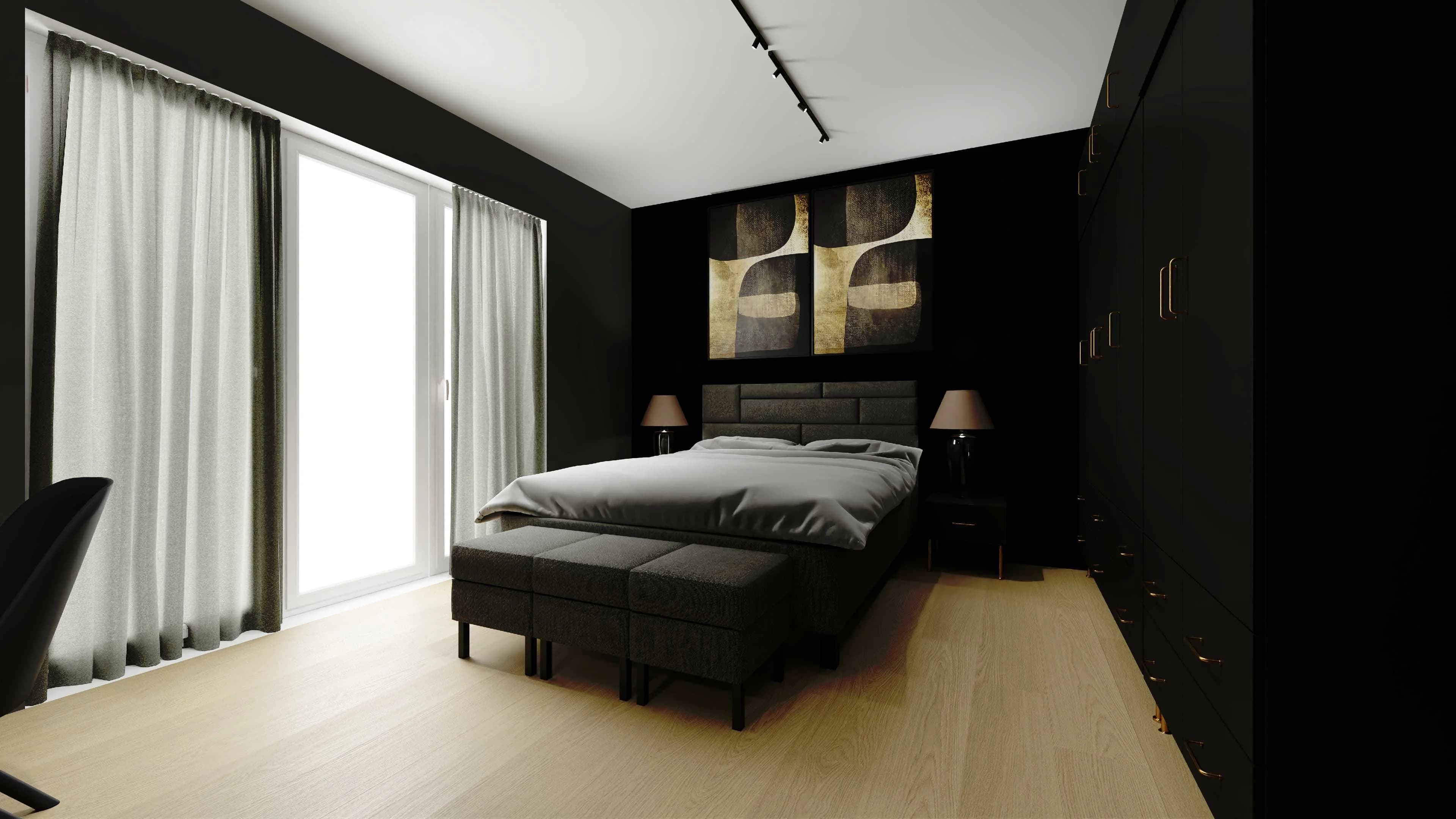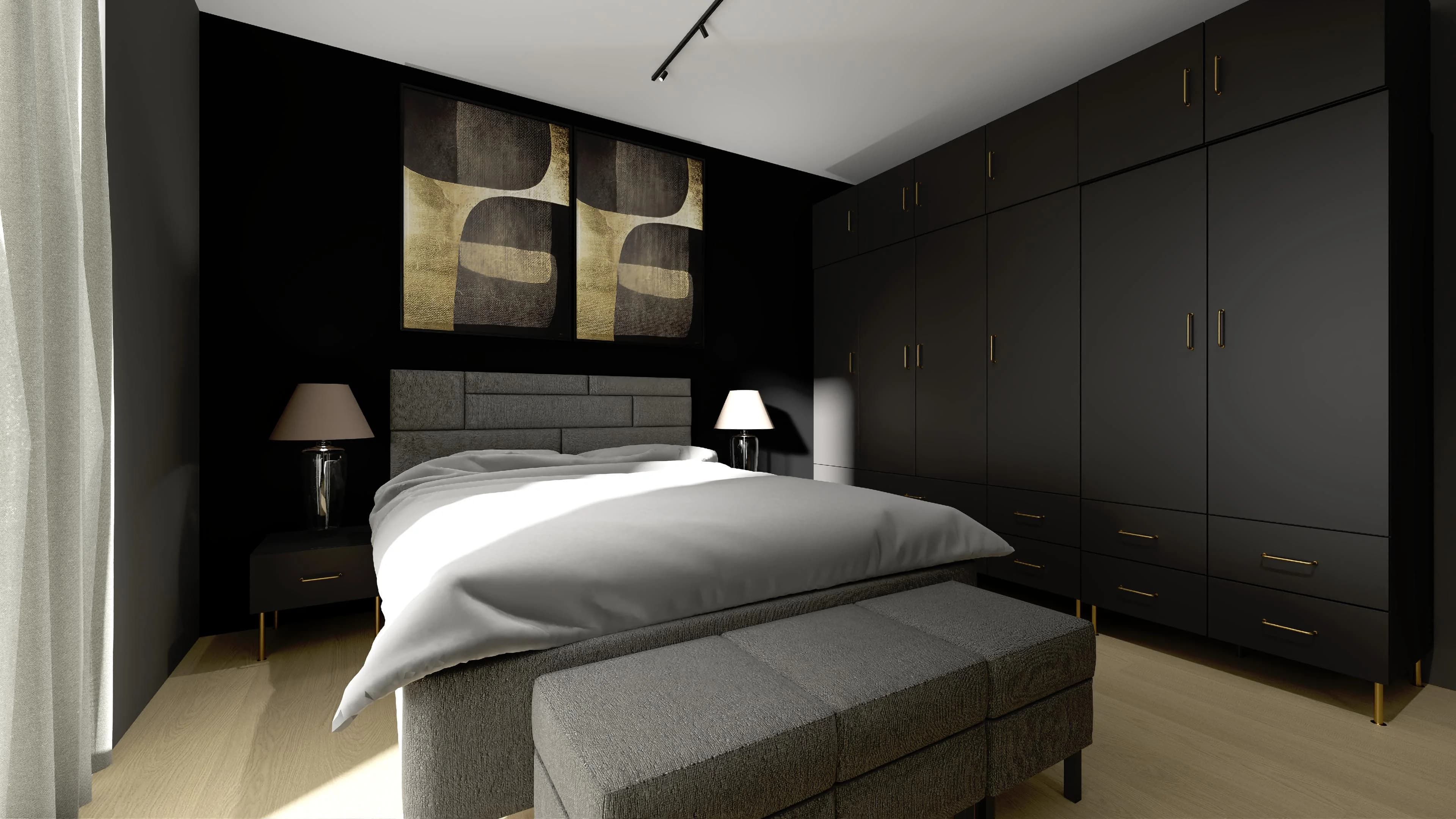Ta aranżacja emanuje szykiem. Jej wyjątkowy charakter jest zasługą ponadczasowego połączenia czerni ze złotem, które przejawia się w detalach i uchwytach mebli. Tapicerowane łóżko z dekoracyjnym wezgłowiem zapewnia komfortowy sen, a ustawione u jego podnóża pufy pełnią rolę dodatkowego siedziska. Ogromna szafa stanowi iście królewską garderobę.