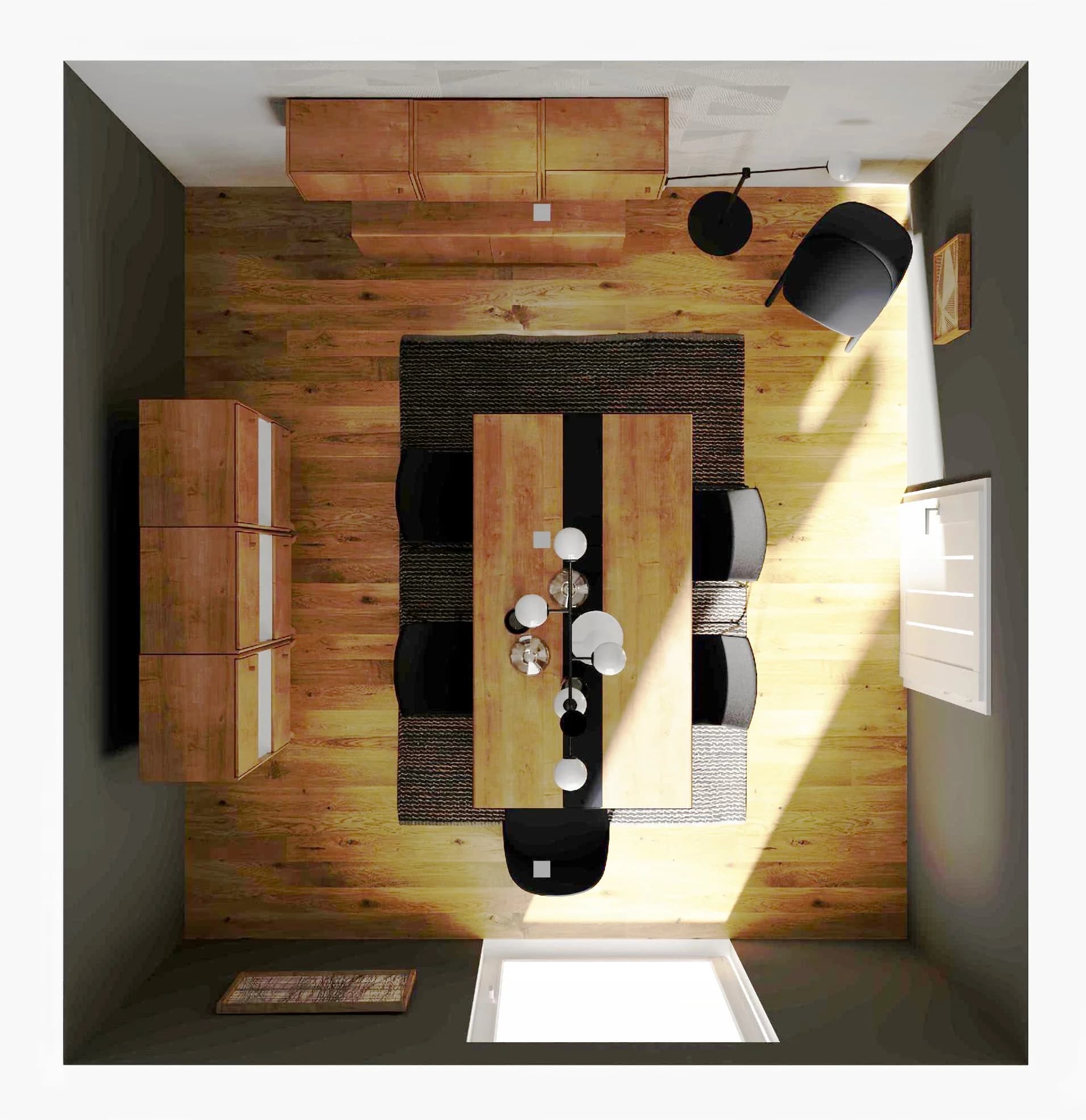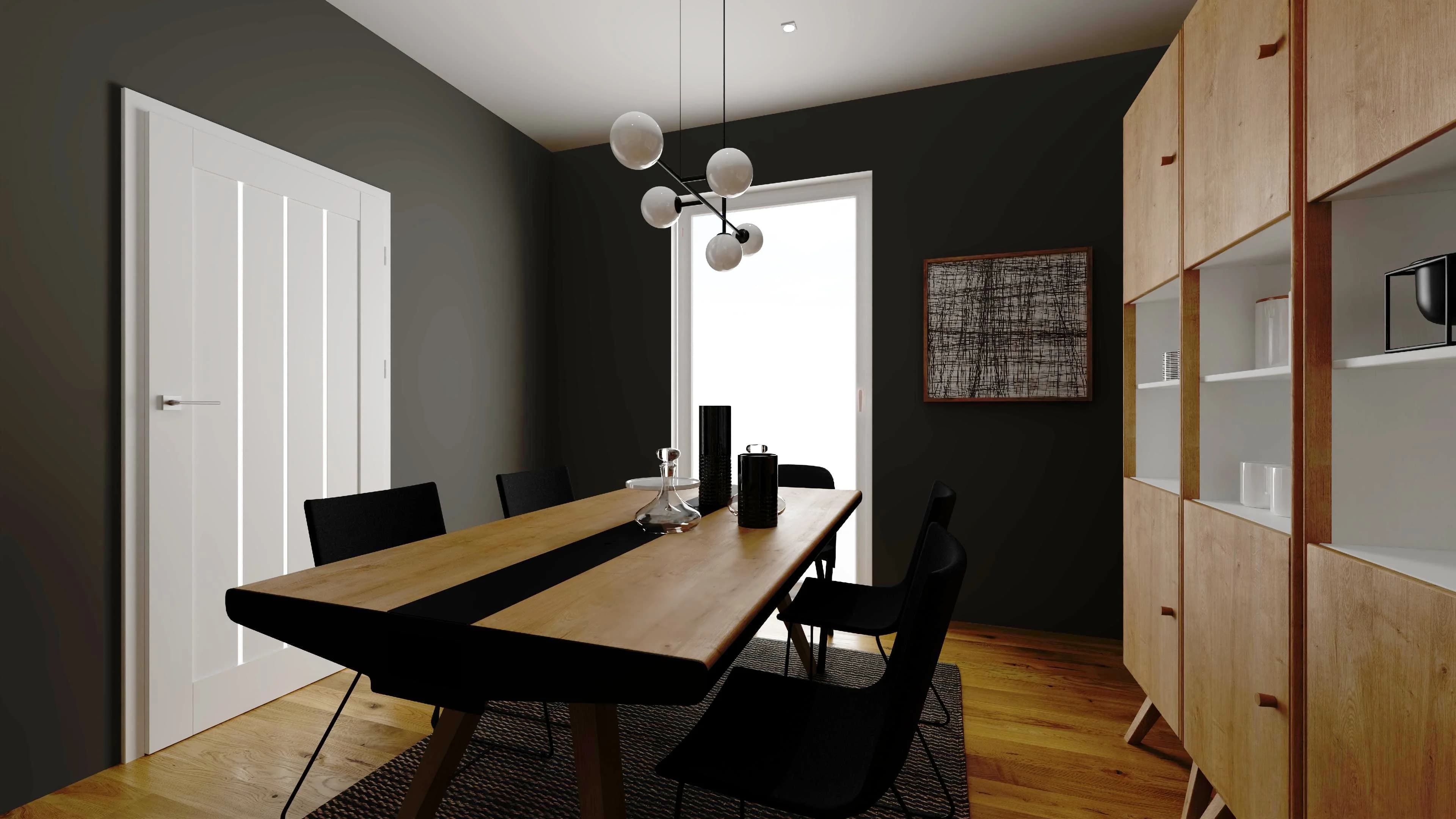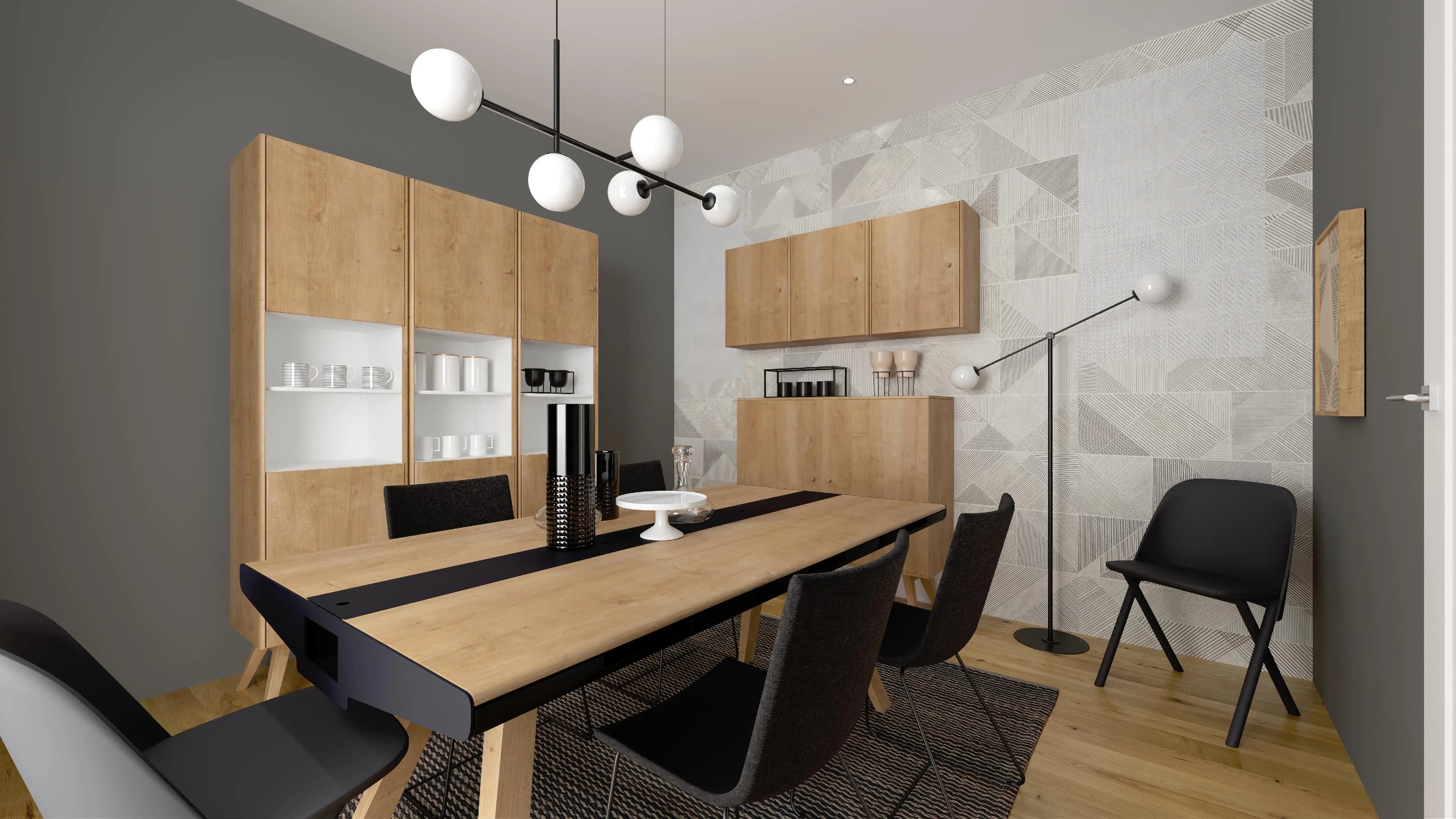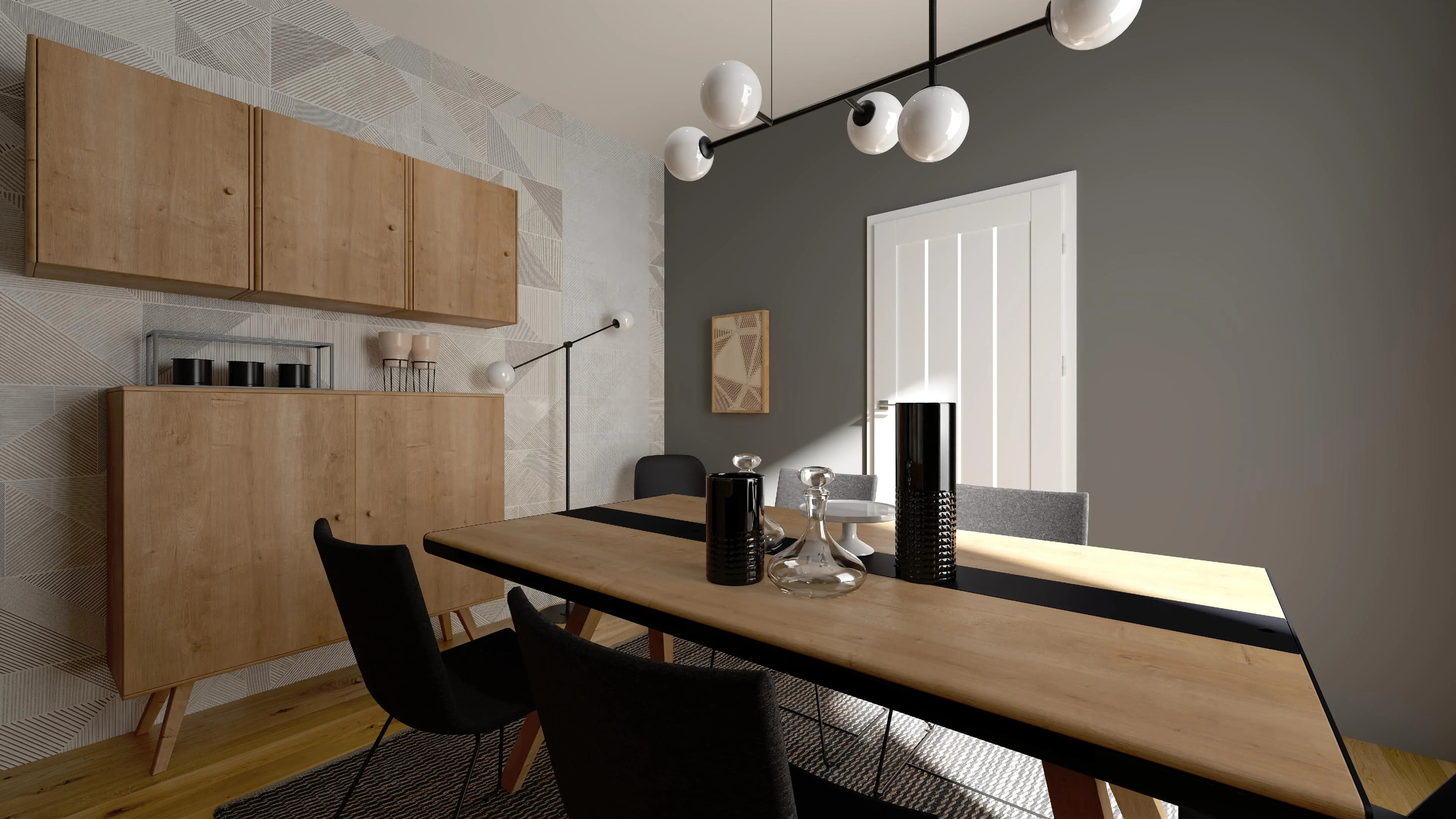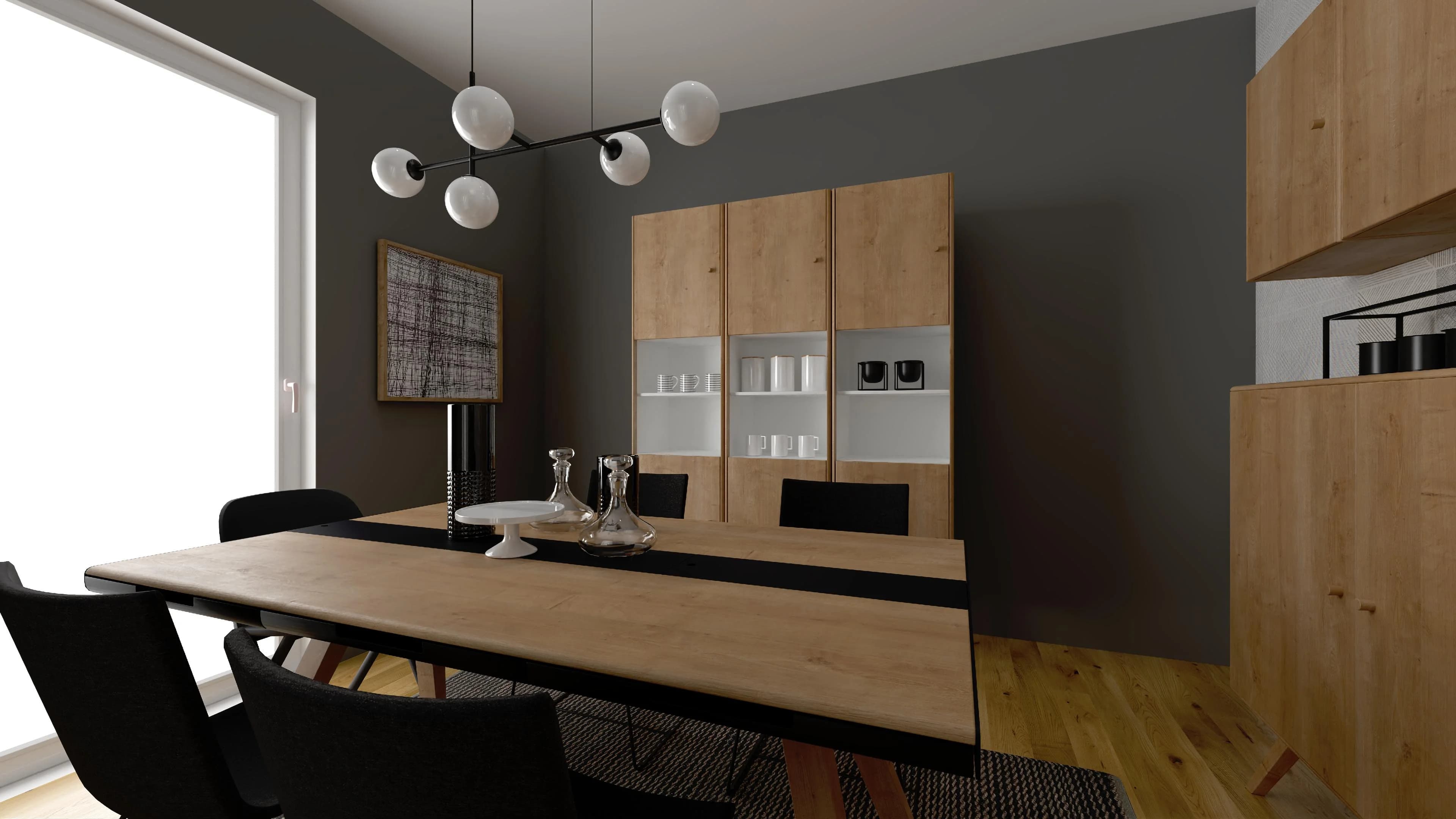 The small interior, thanks to thoughtful details, provides a comfortable place for everyday gatherings. The wooden table with drawers can accommodate various trinkets, and the shaped chairs can also be used for working from home. Thanks to the wide display cabinet, your favourite dinner service will be right at hand. Black lamps and geometric patterns add an interesting touch to the dining room.