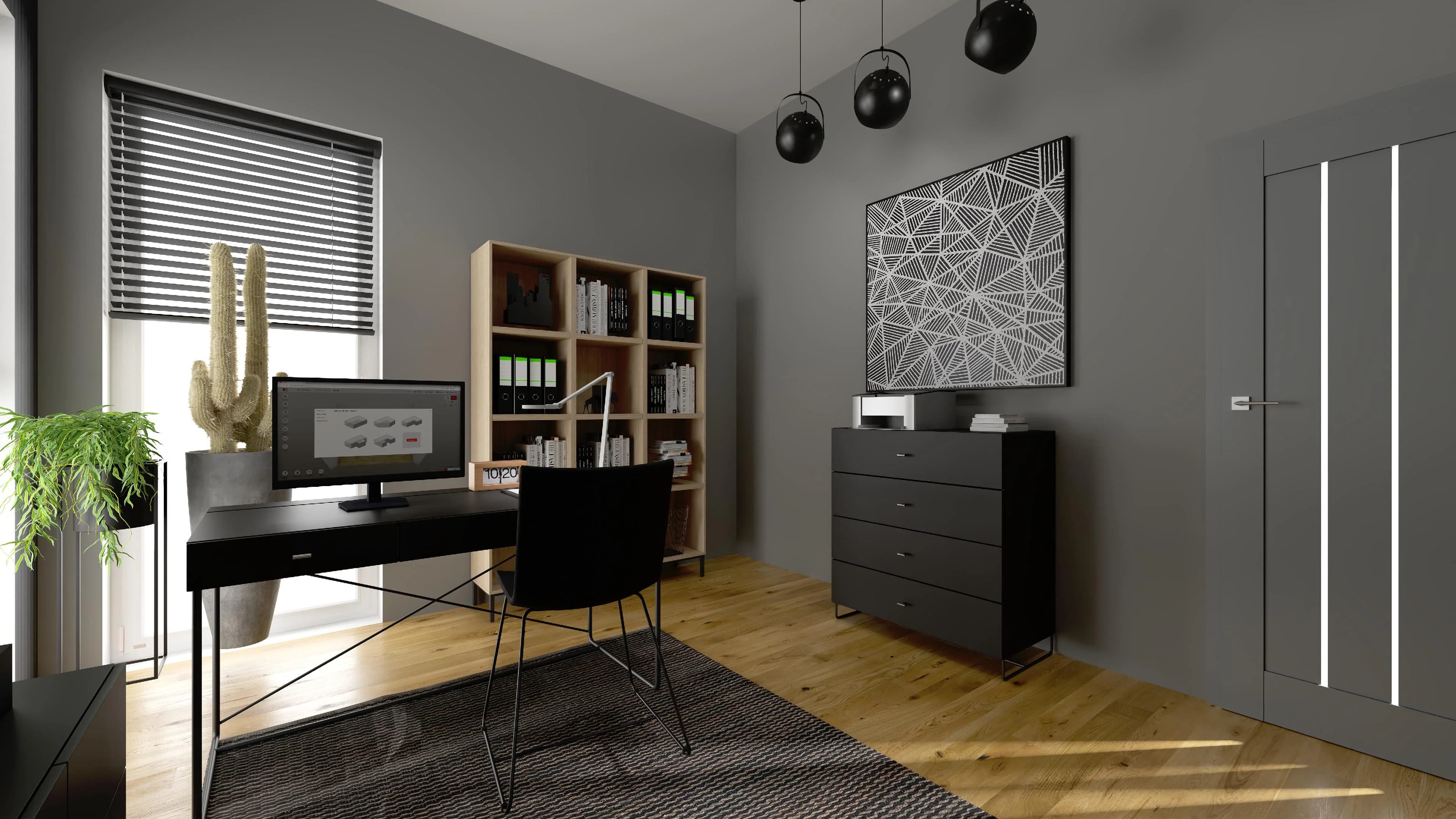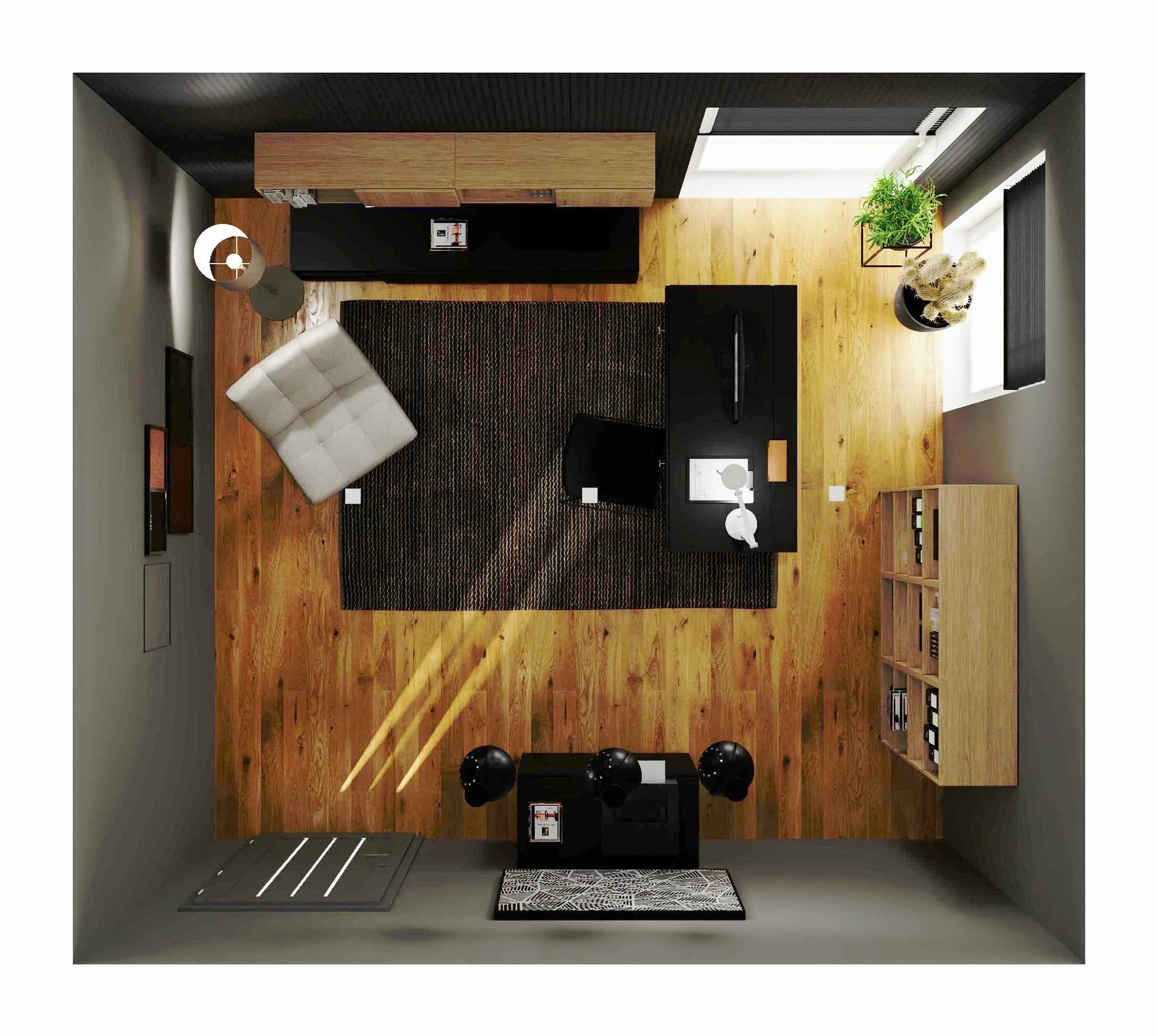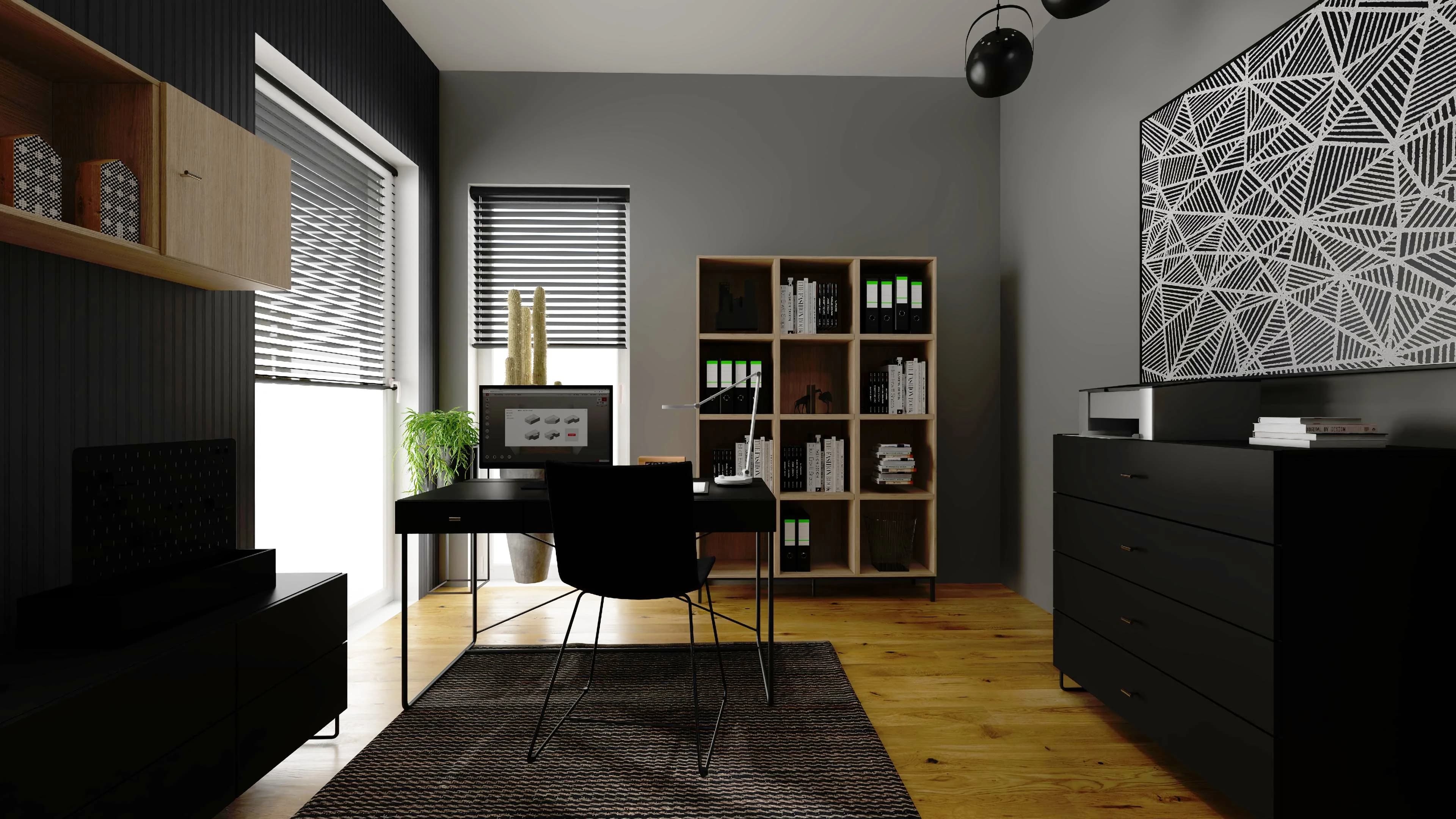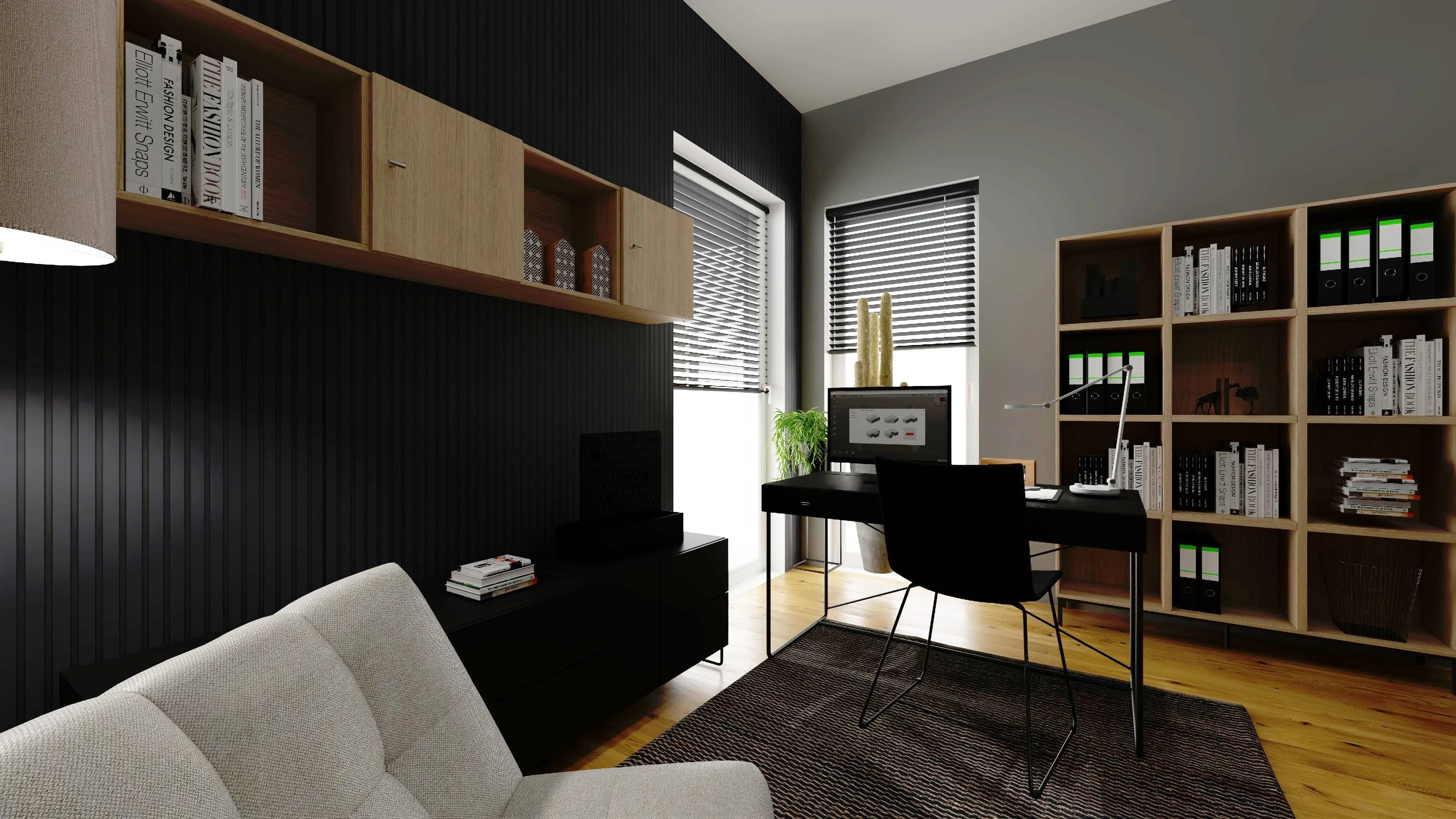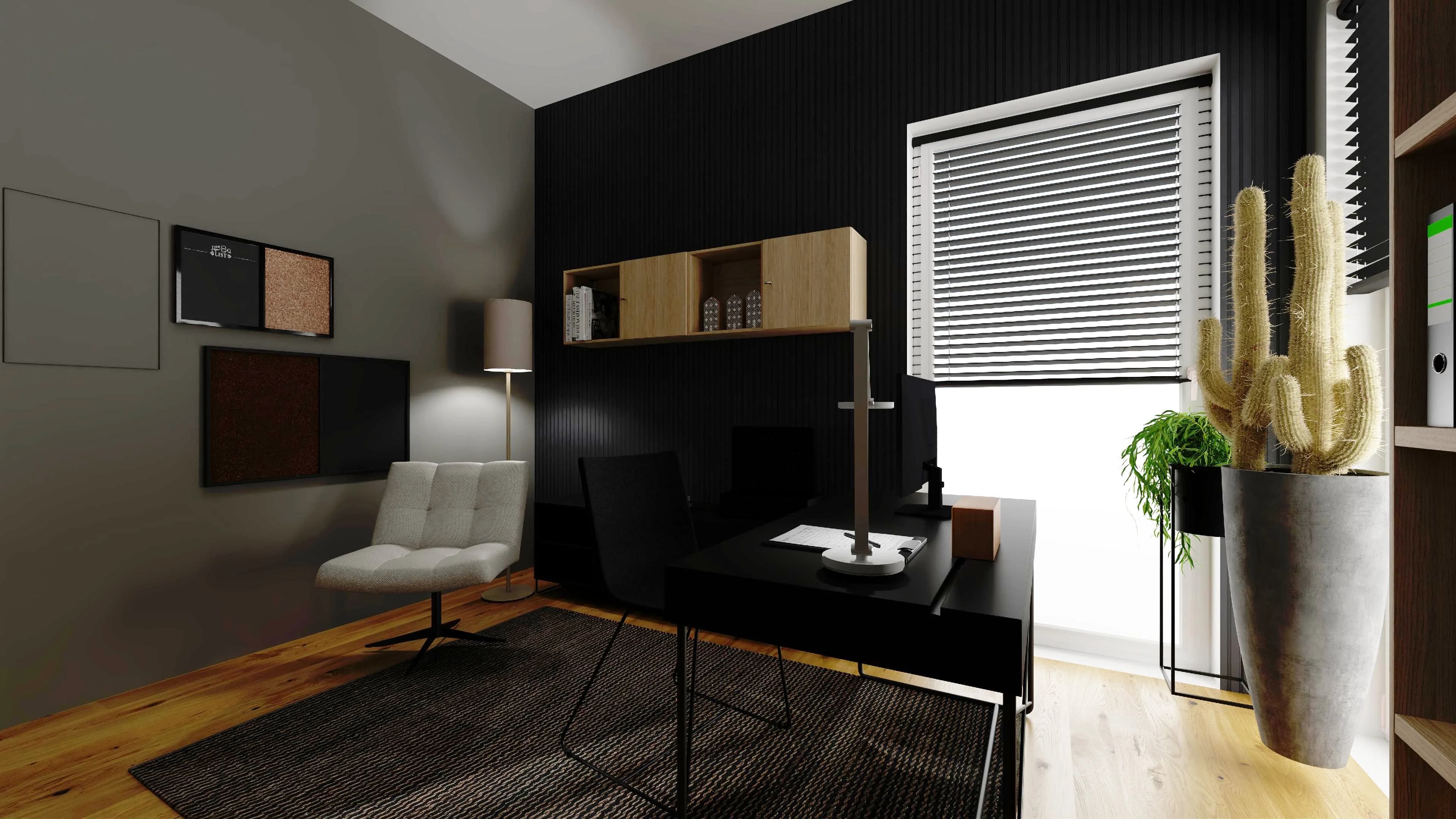 Dzięki ciemnym barwom wnętrze tego biura prezentuje się bardzo stylowo. Ustawione na środku pokoju biurko zapewnia komfortową przestrzeń do pracy, a praktyczne meble pozwalają zorganizować wszystkie potrzebne dokumenty. Podczas przerwy w pracy przyda się wygodny fotel. Za sprawą ciemnej ściany z lameli i naturalnego dywanu aranżacja zyskuje na wyrazie.
