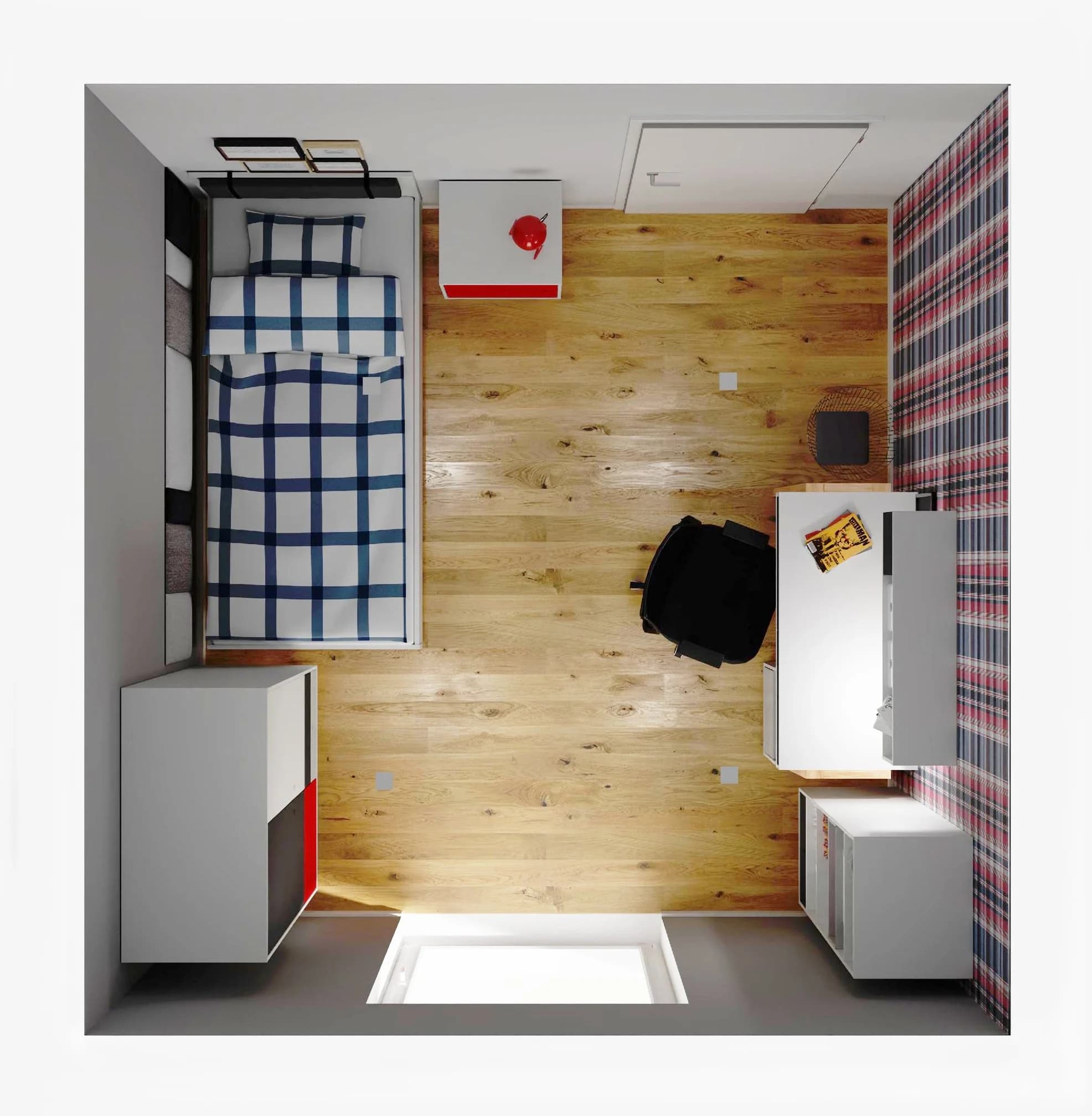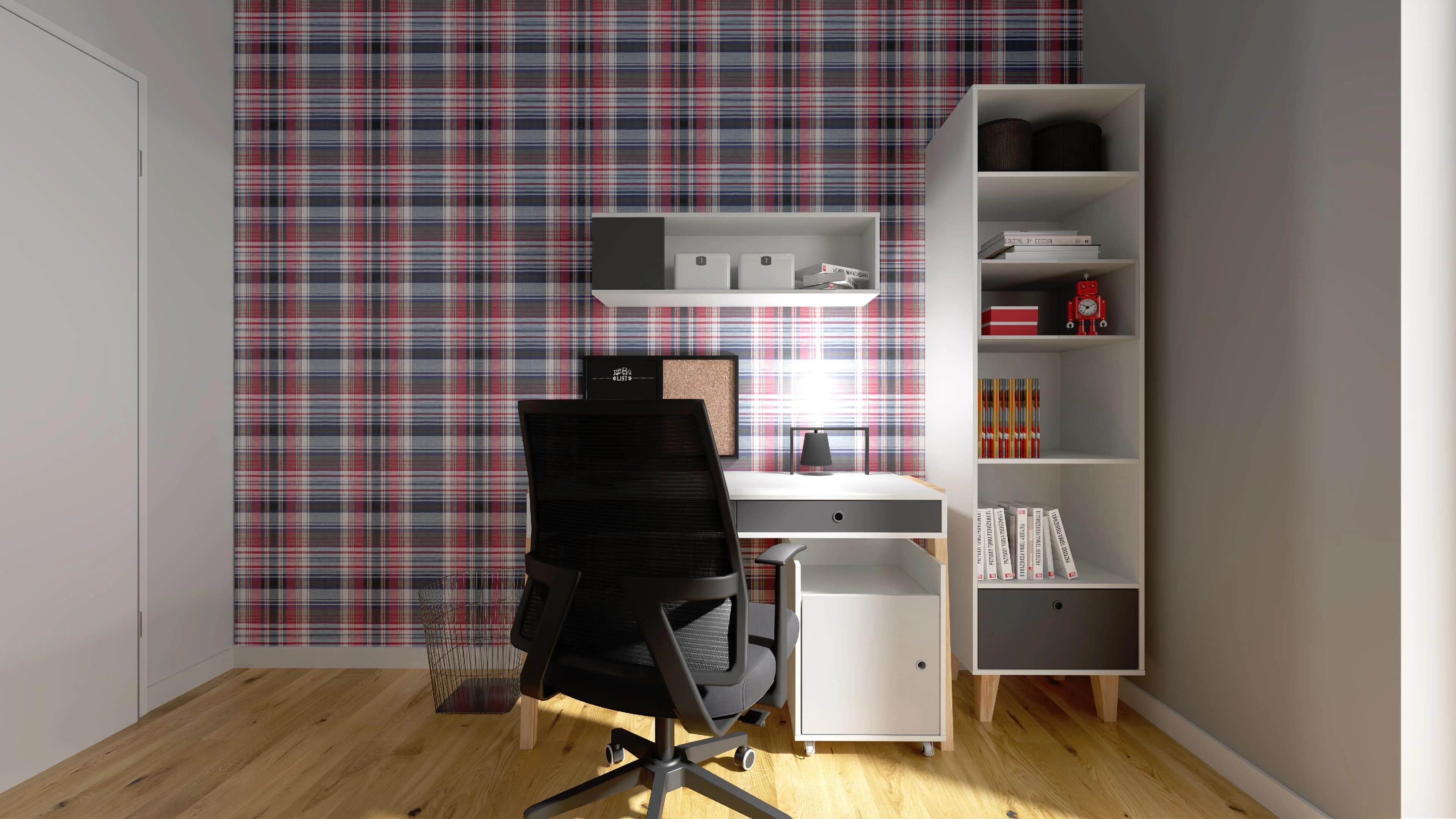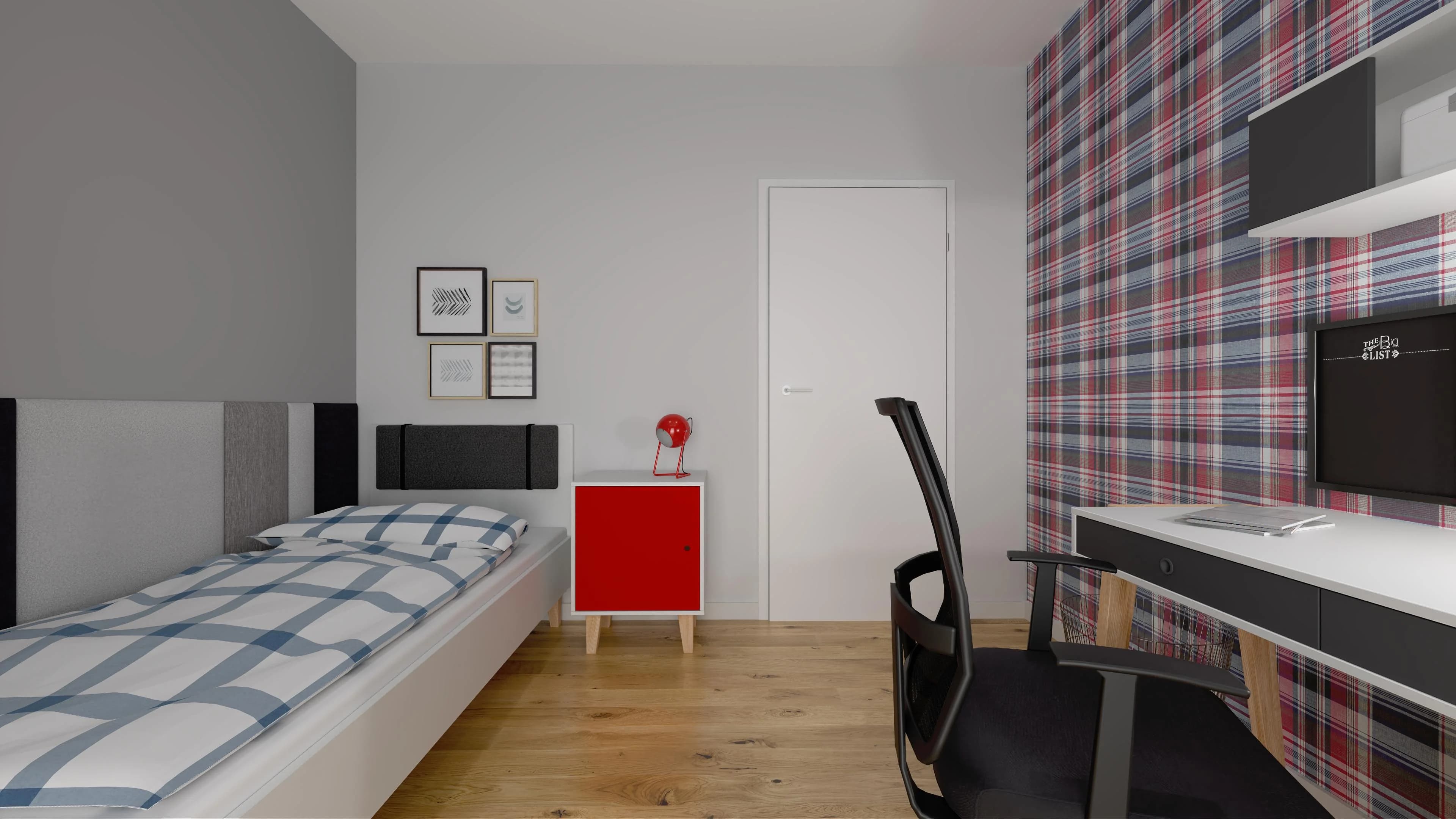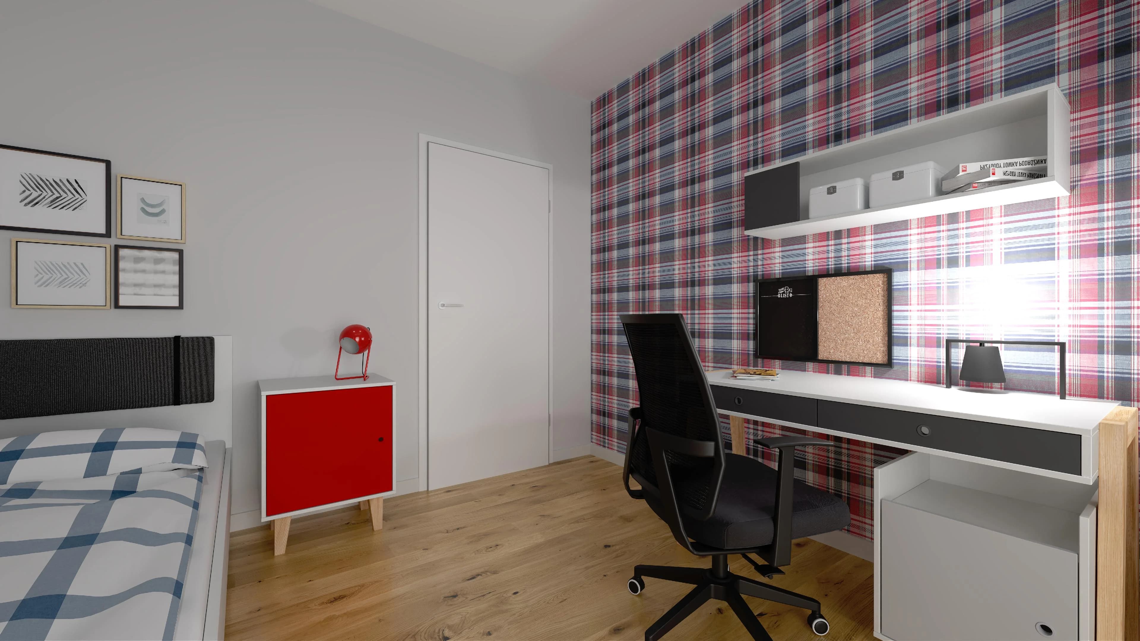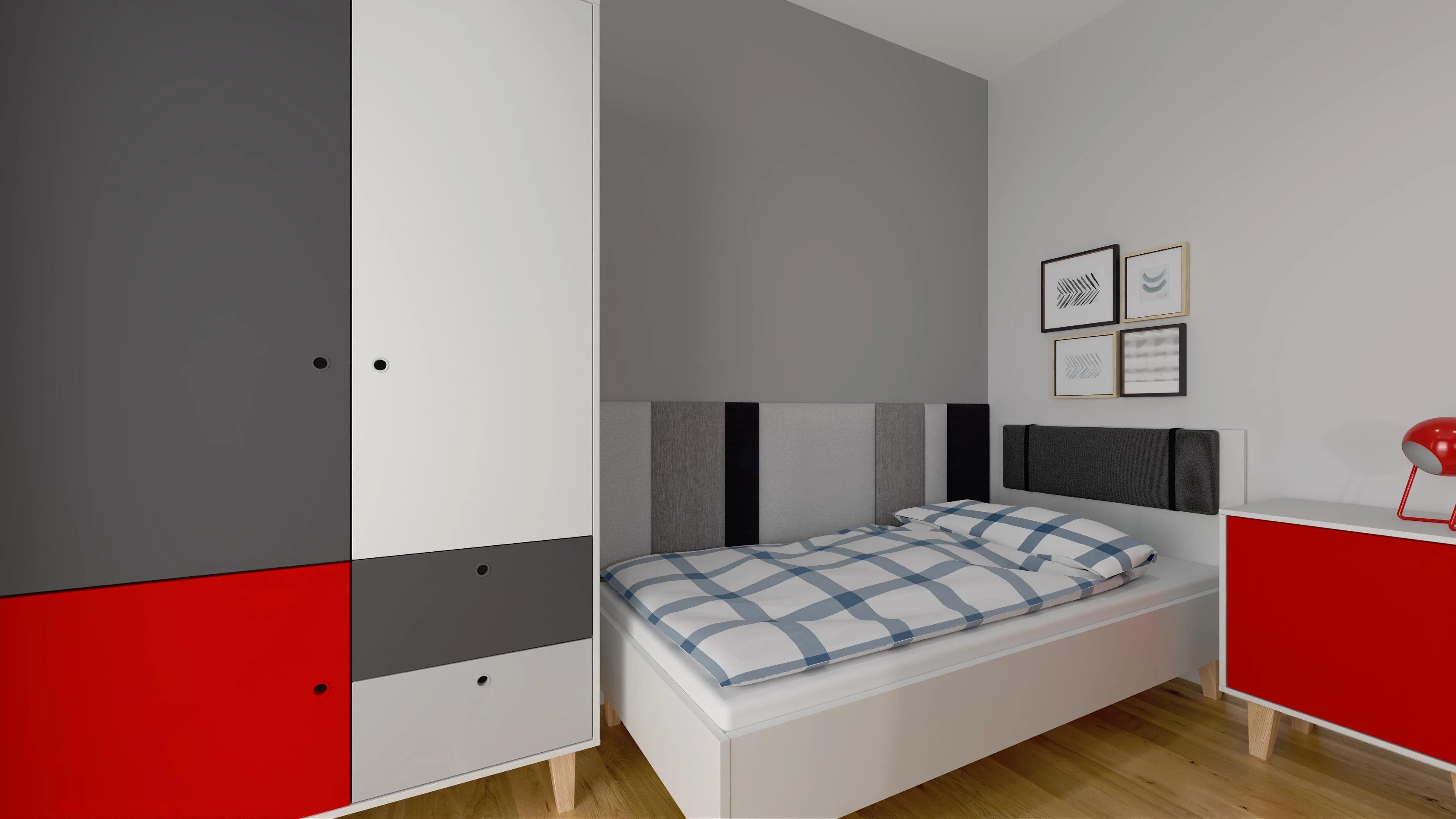 Pełen pozytywnej energii i komfortowy – taki jest ten pokój młodzieżowy. Rolę główną gra w nim wzór kraty, który pojawia się na ścianie, oraz wyrazista barwa czerwieni. Łóżko, choć niewielkie, zapewnia wygodną przestrzeń do snu i relaksu o każdej porze. Przy biurku znajdzie się miejsce do nauki i realizacji hobby, a w szafie zmieszczą się ubrania i prywatne drobiazgi.