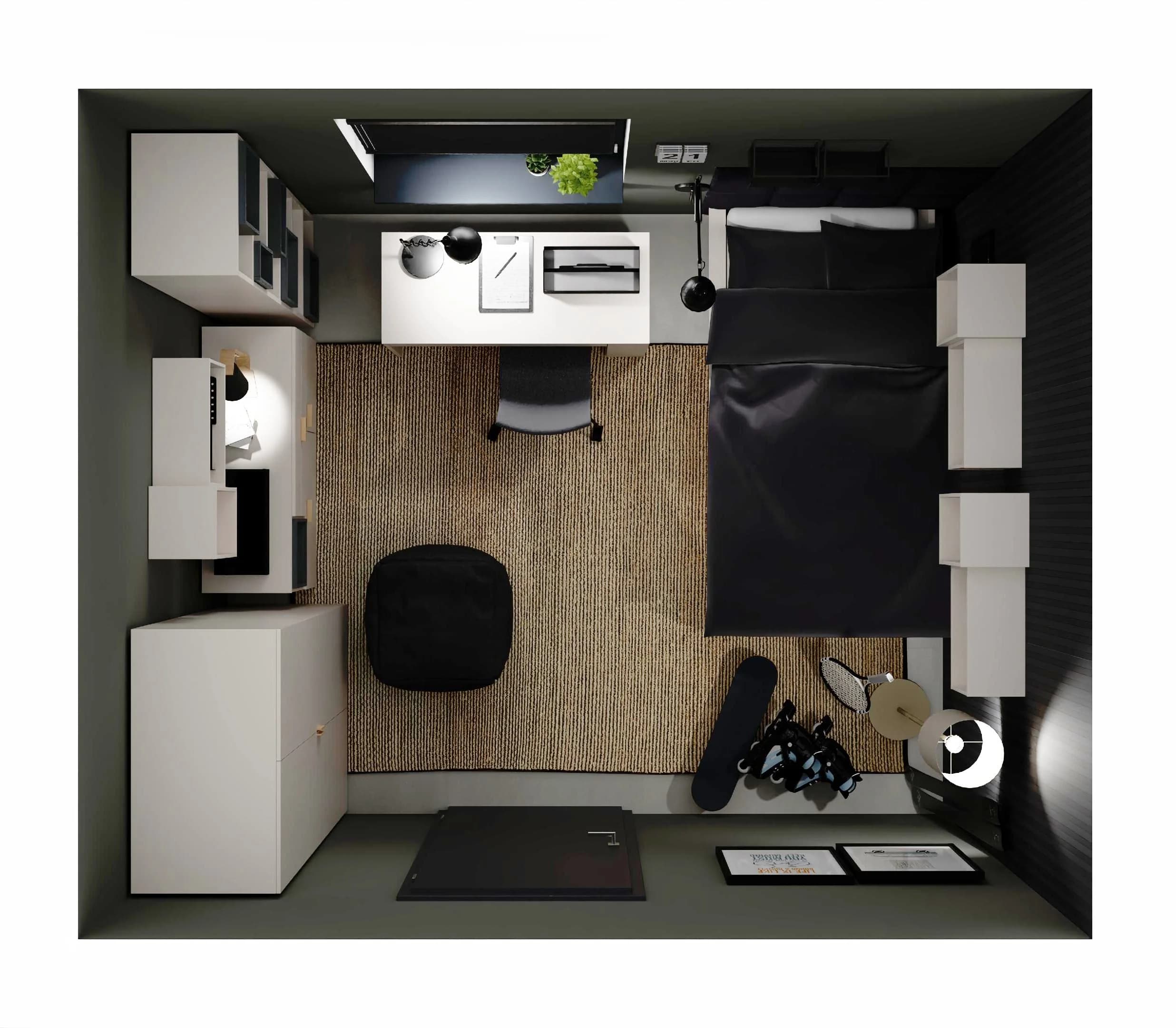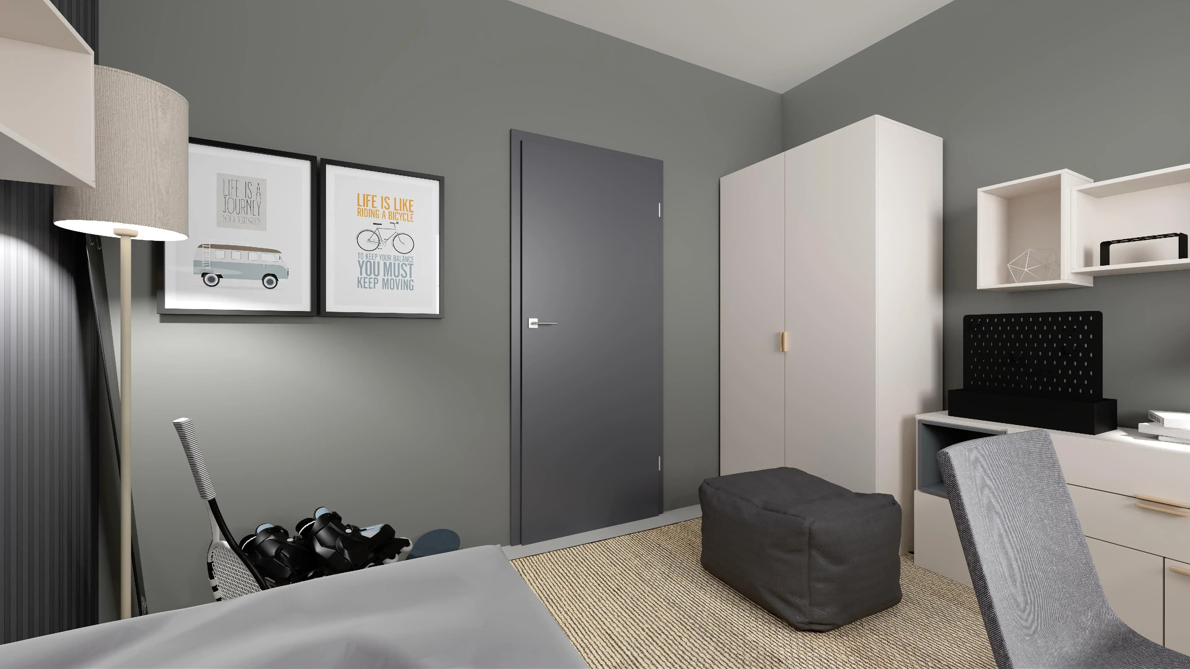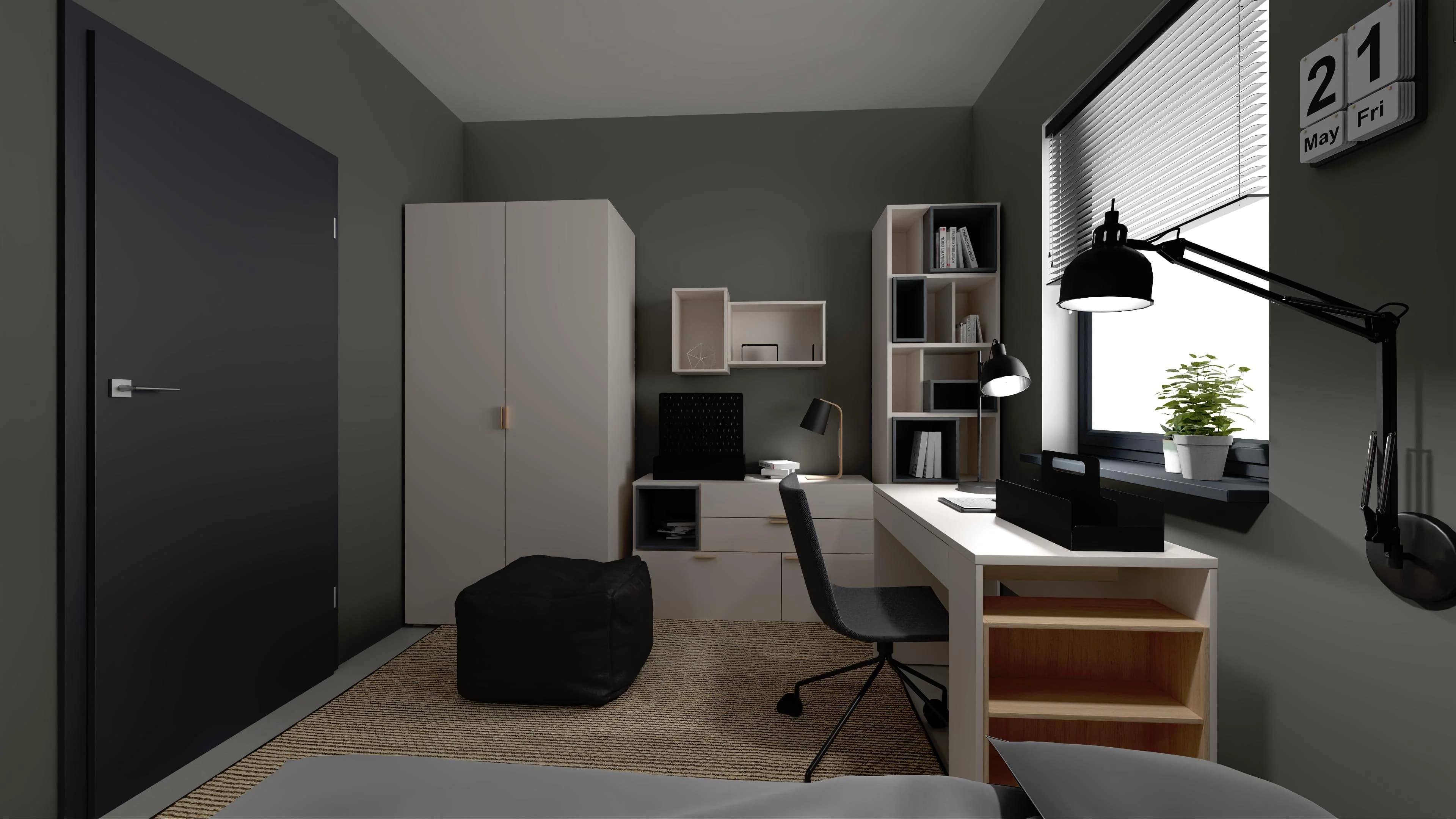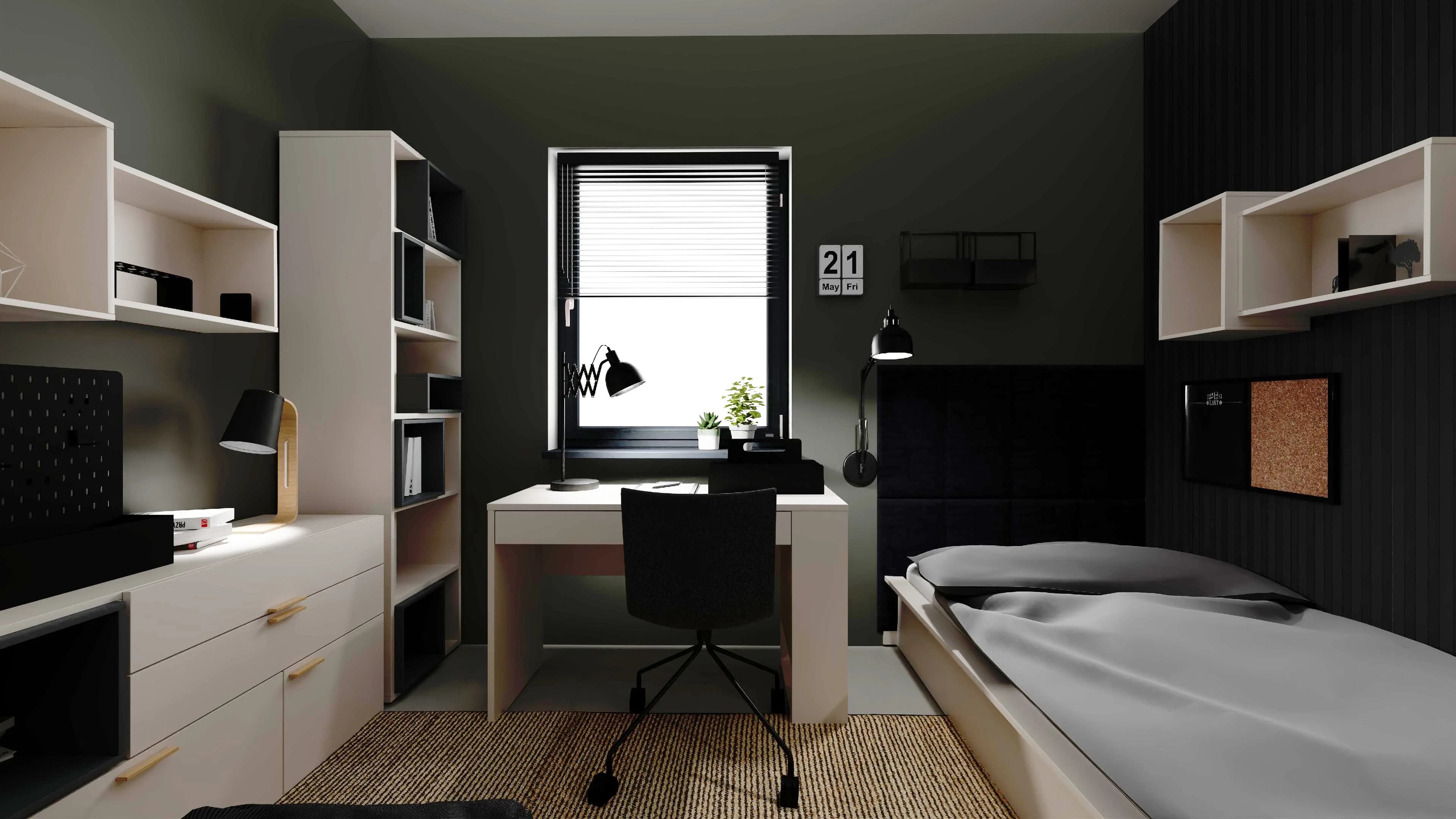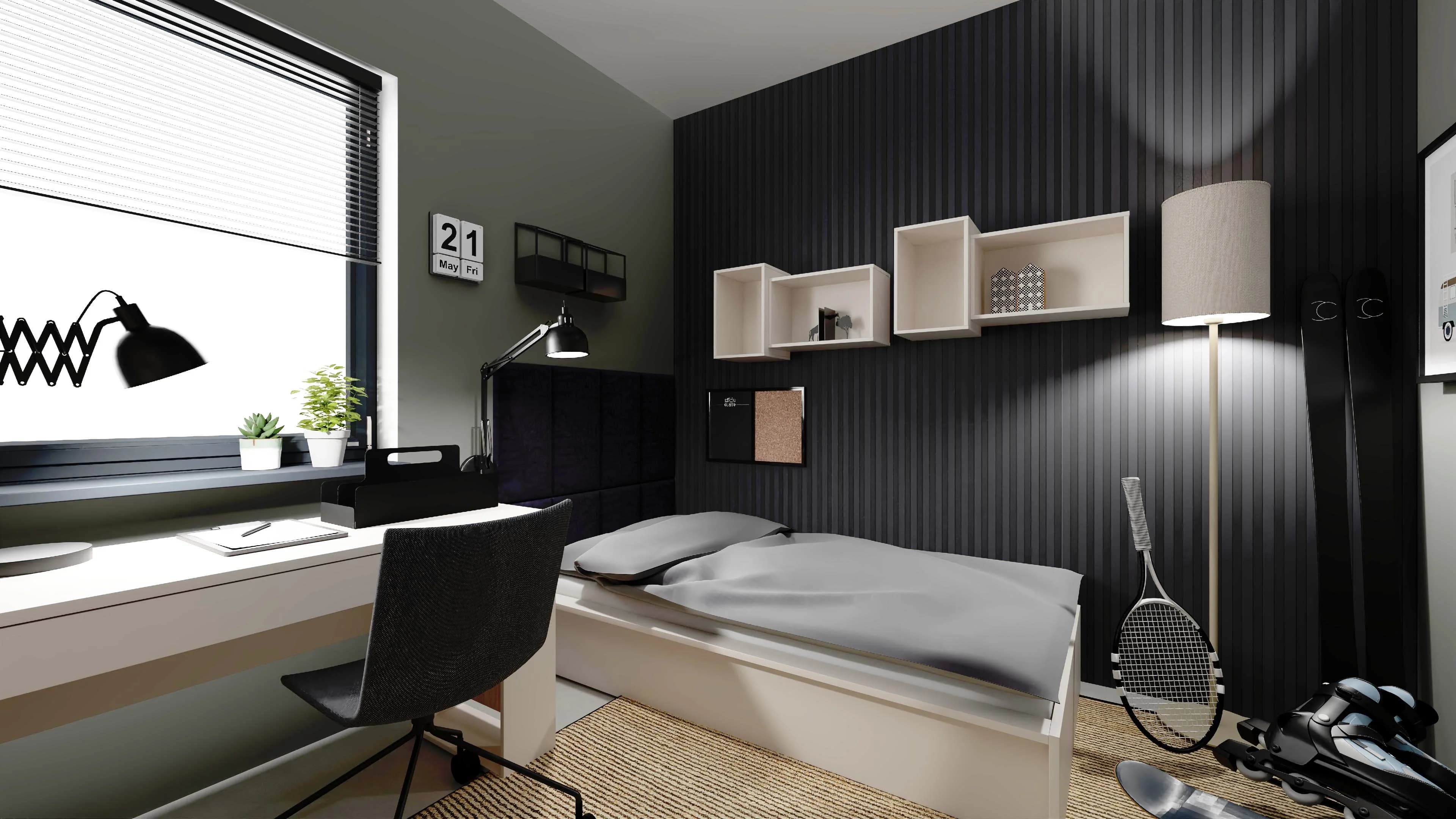 The black decorative laths behind the bed blend harmoniously here with the grey walls and white ceiling. Thanks to the practical furniture, you can easily organise your books and clothes and display your favourite gadgets. A desk with drawers and a swivel chair on wheels provide comfortable conditions for studying. The lighting has been thoughtfully designed to ensure comfortable relaxation after dark.