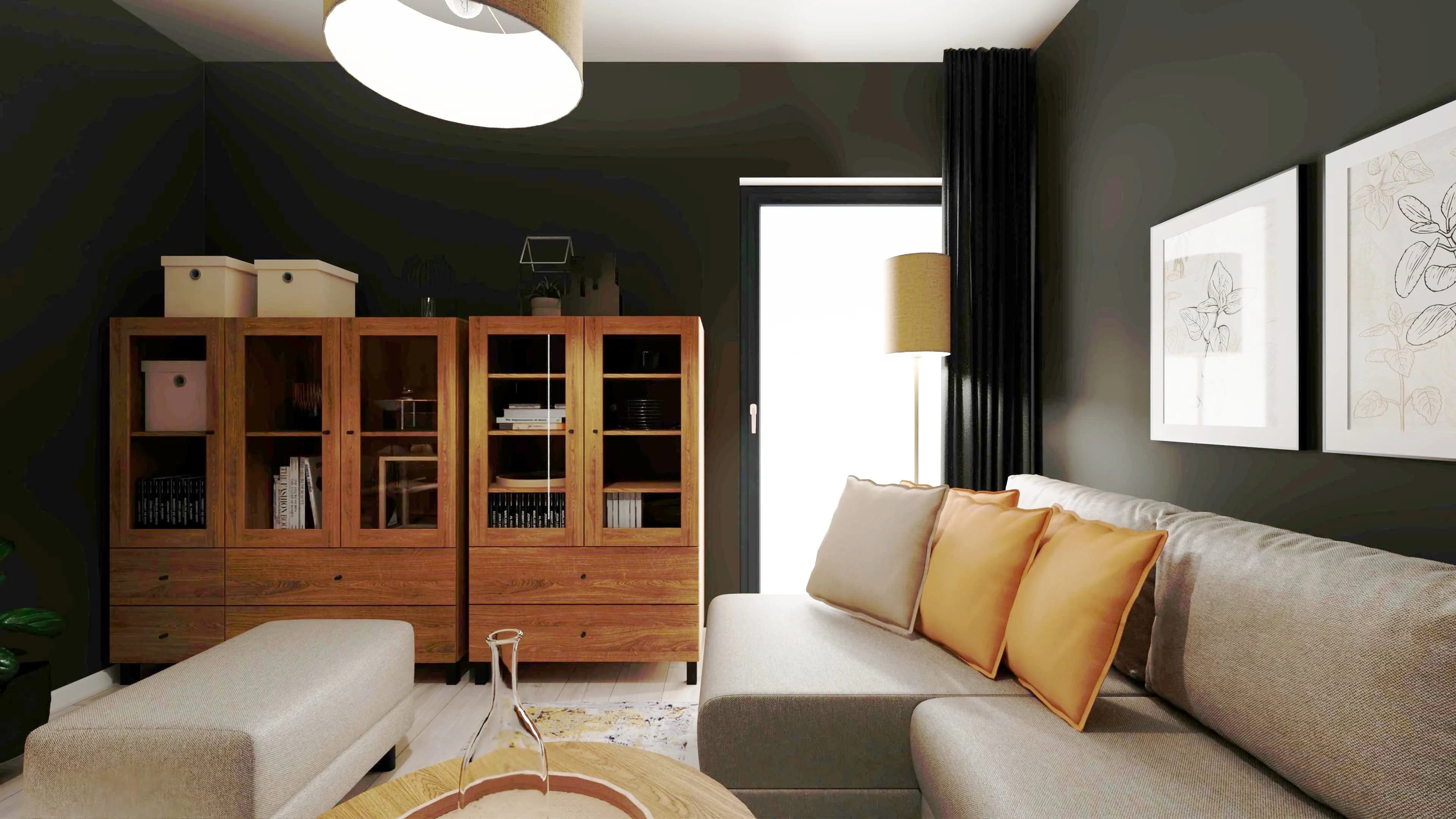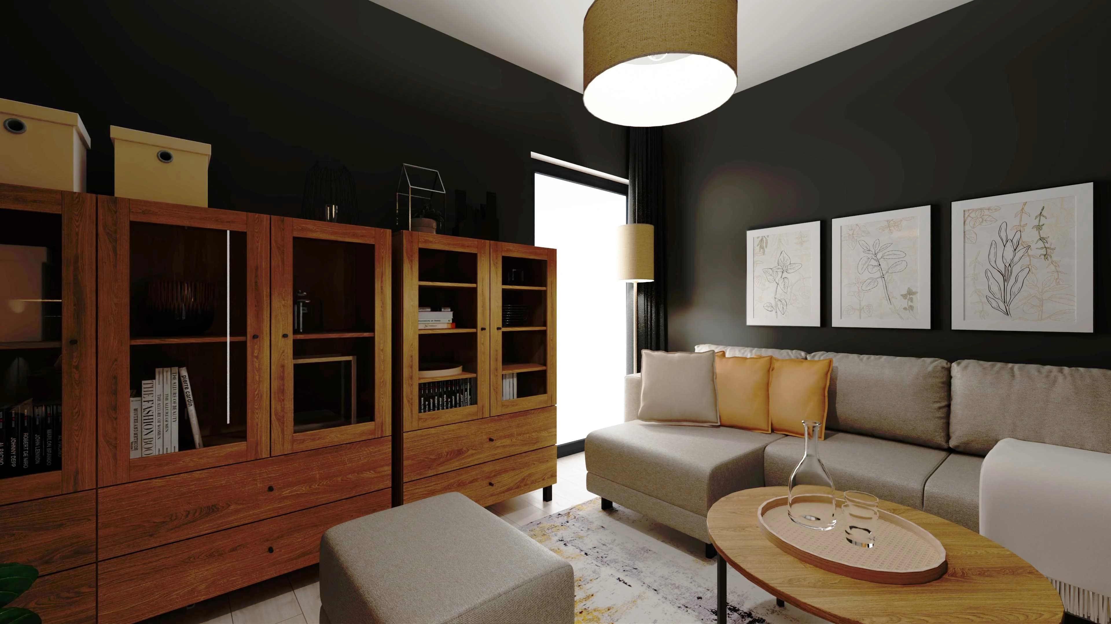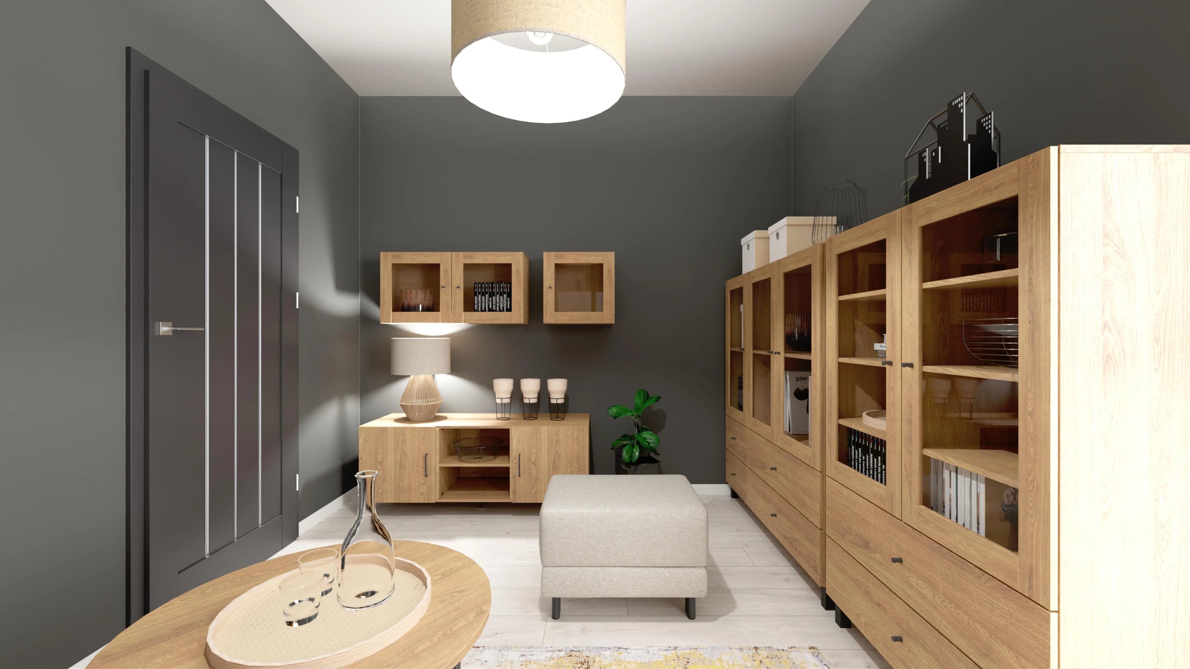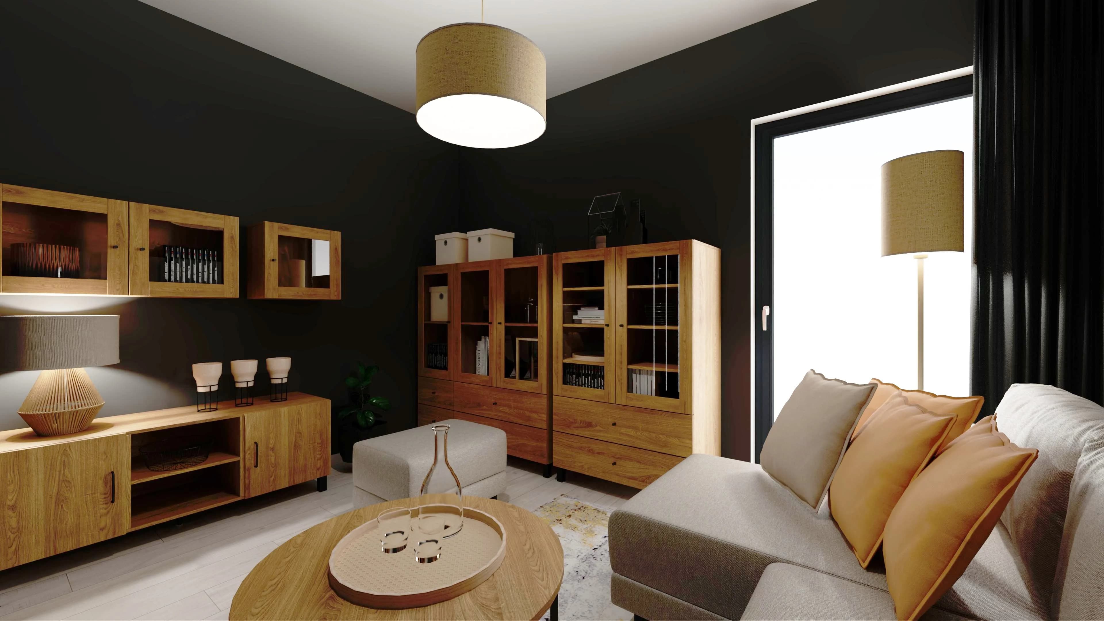 Grafitowy pokój dzienny z akcentami drewna