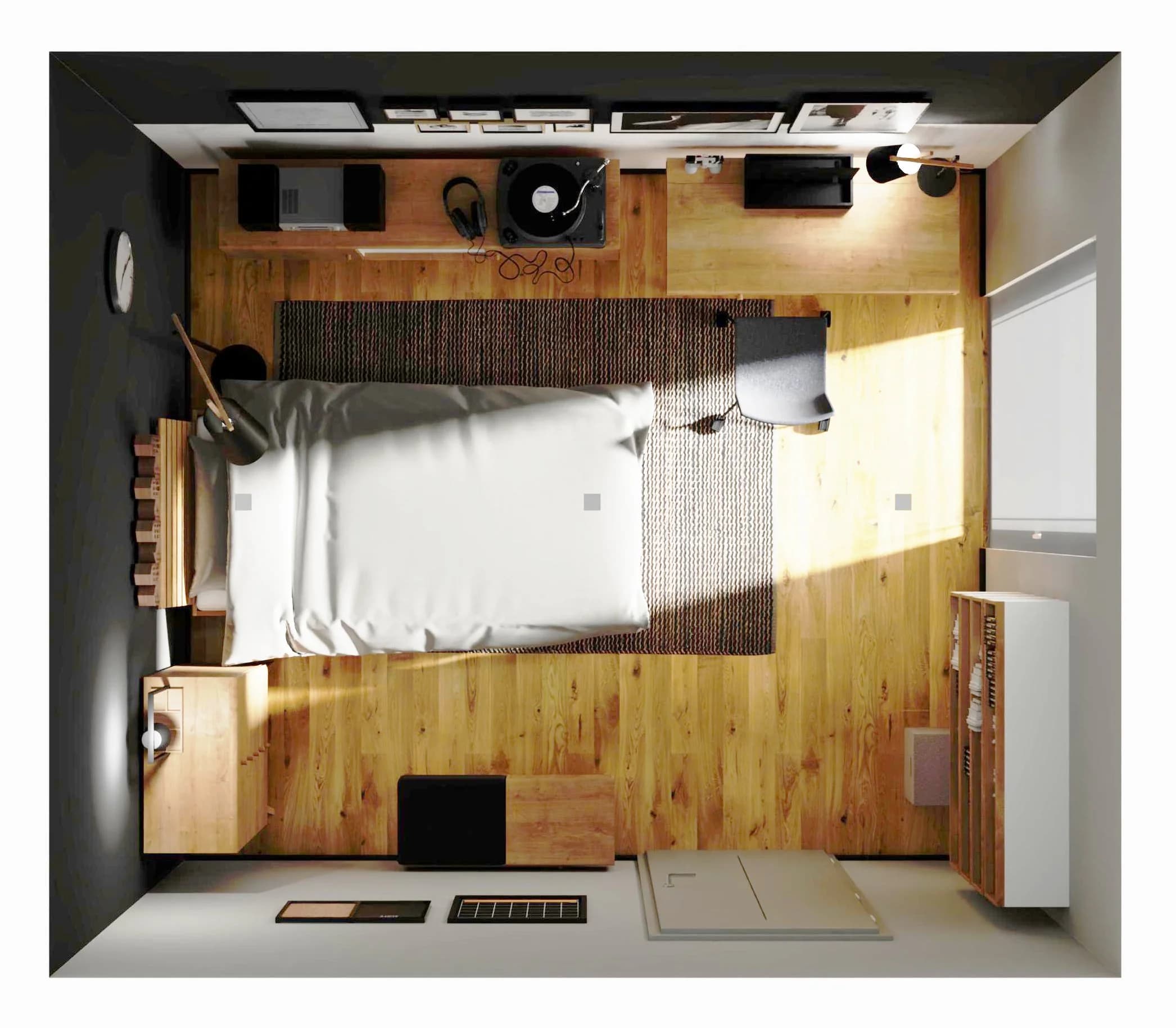W tym pokoju znajdzie się miejsce na relaks i realizację własnych pasji. Mimo niewielkiego metrażu udało się ustawić w nim biurko do nauki, szafkę na konsolę i prywatne drobiazgi, jednoosobowe łóżko i komodę. Ciekawym akcentem dekoracyjnym są sięgające połowy ściany lamele oraz czarno-białe grafiki. Przestrzeń wizualnie ociepla i wycisza duży dywan.