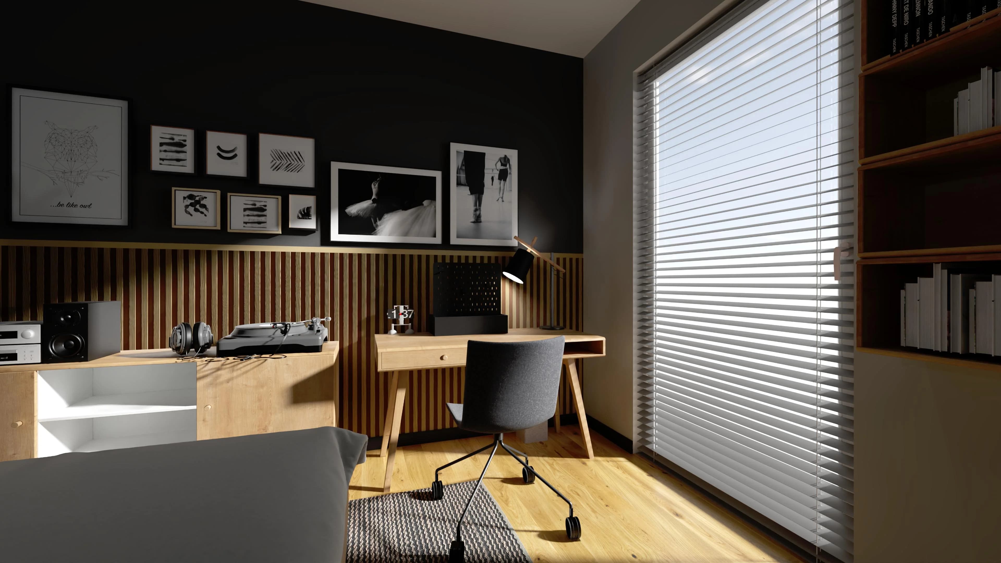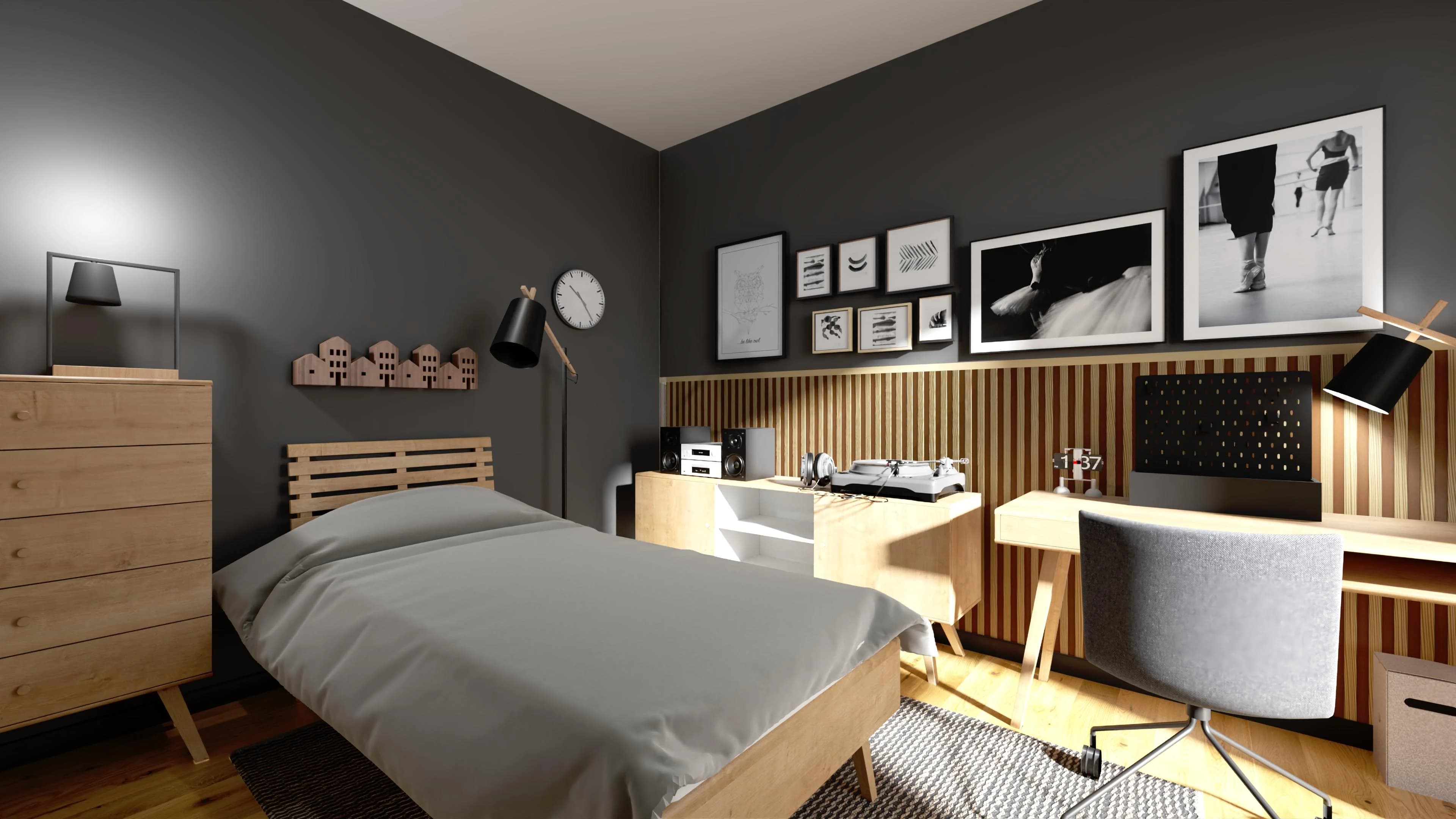Grafitowy pokój nastolatka z ciepłymi akcentami drewna